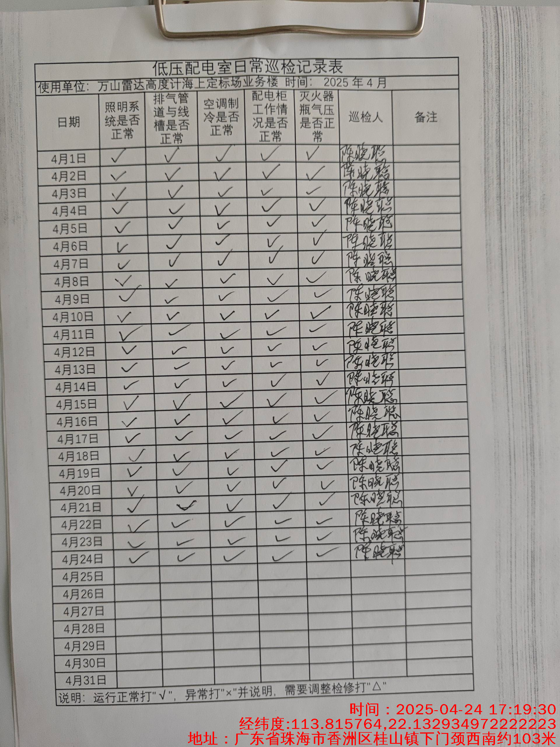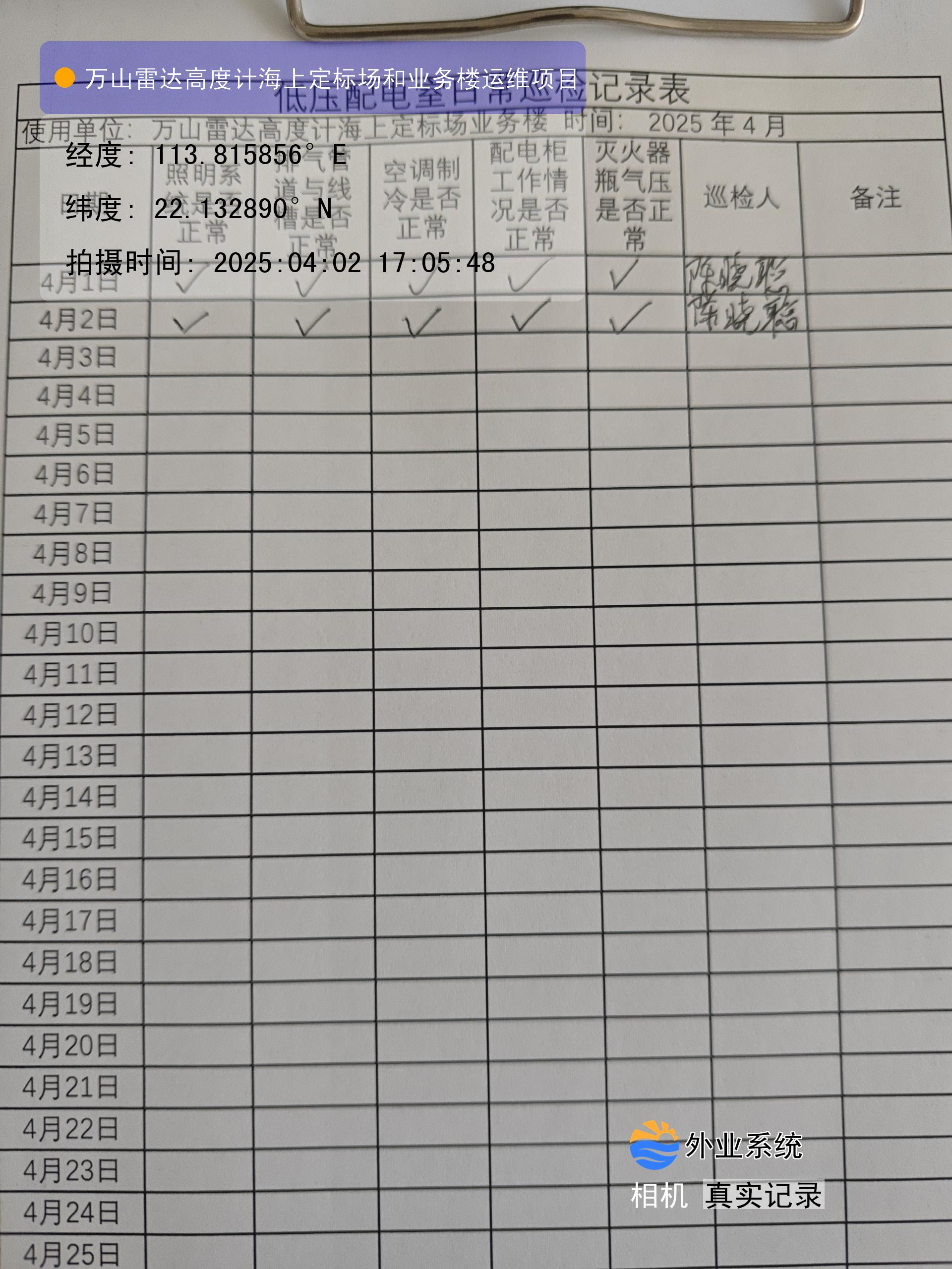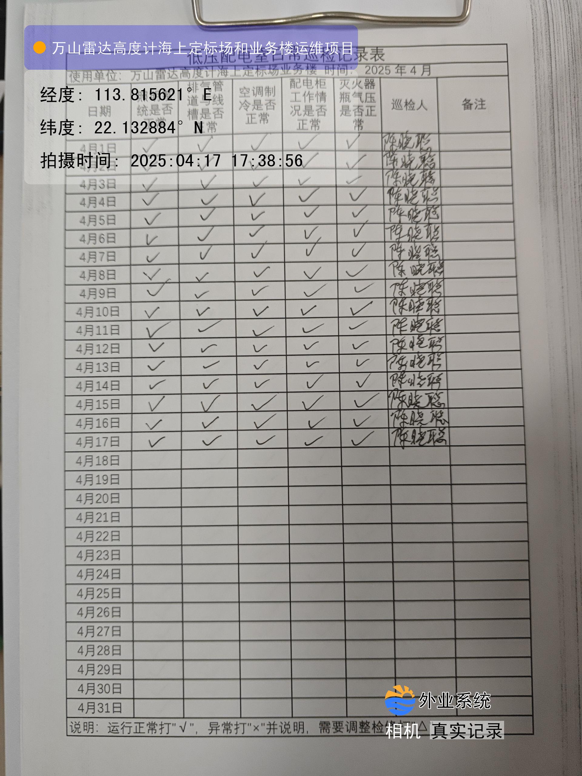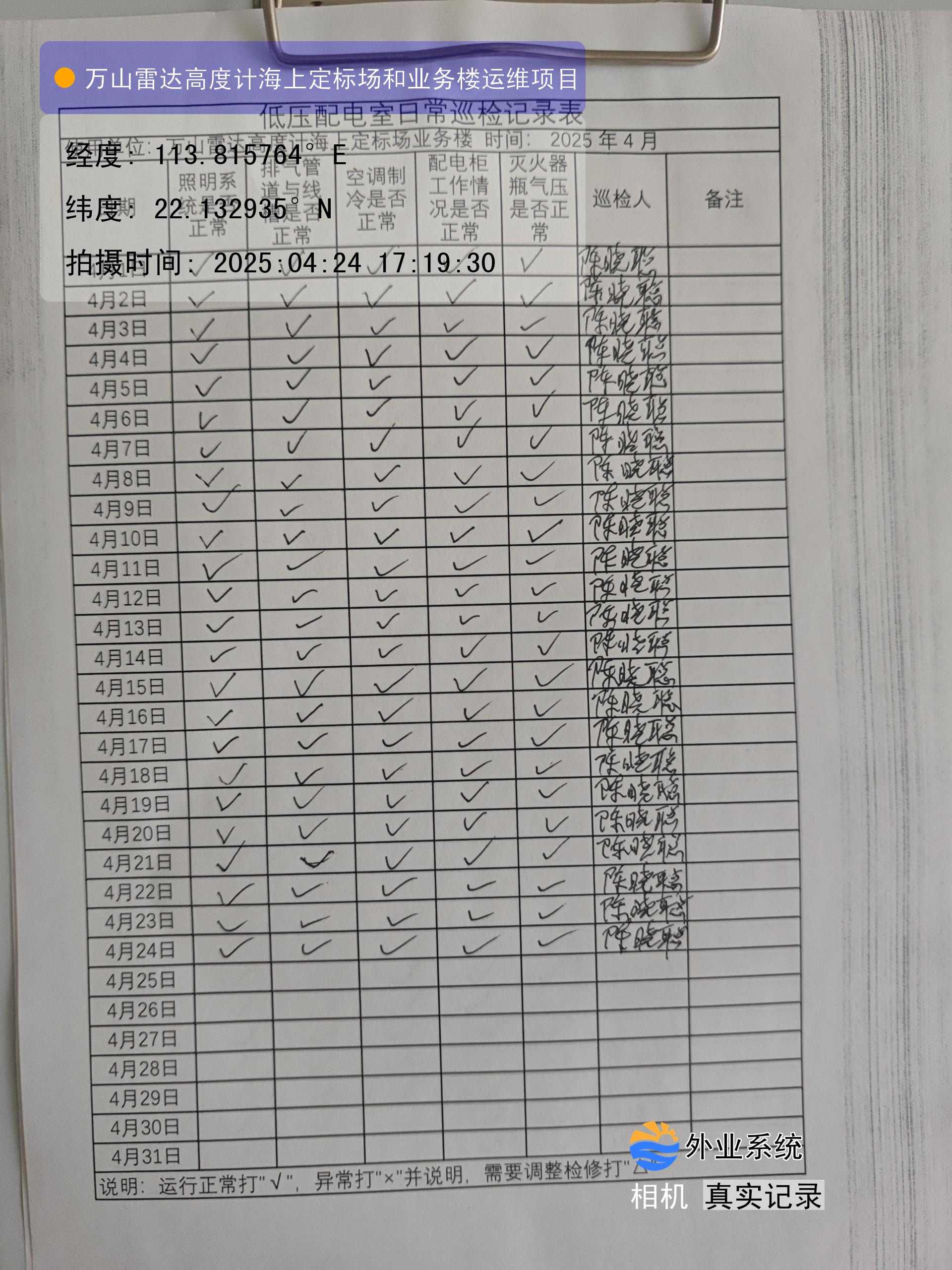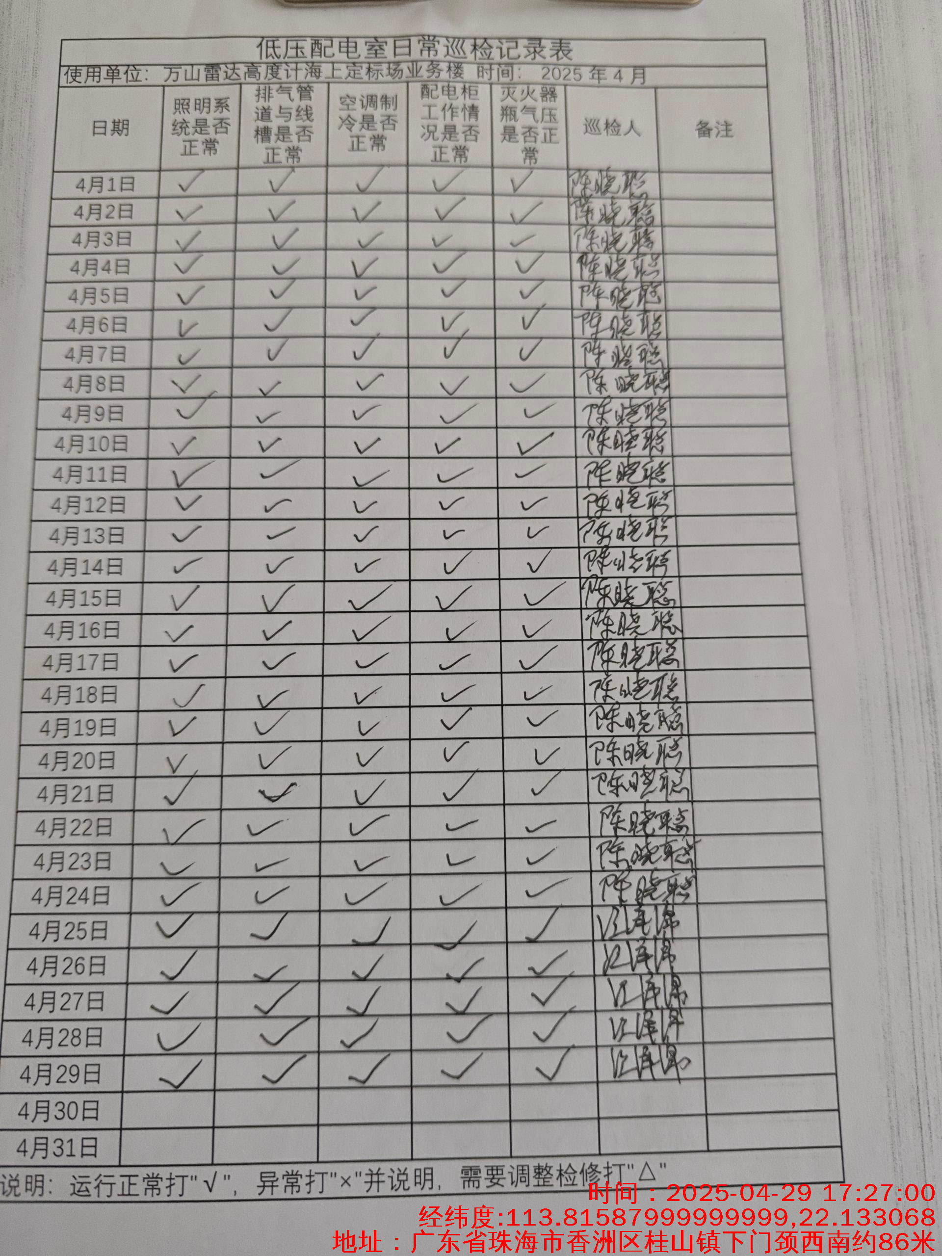 | 记录表-低压配电室日常巡检 | 原图 | 水印1 | 水印2 | 陈晓聪 | 工作照 | 2025-04-01 17:00:00 |