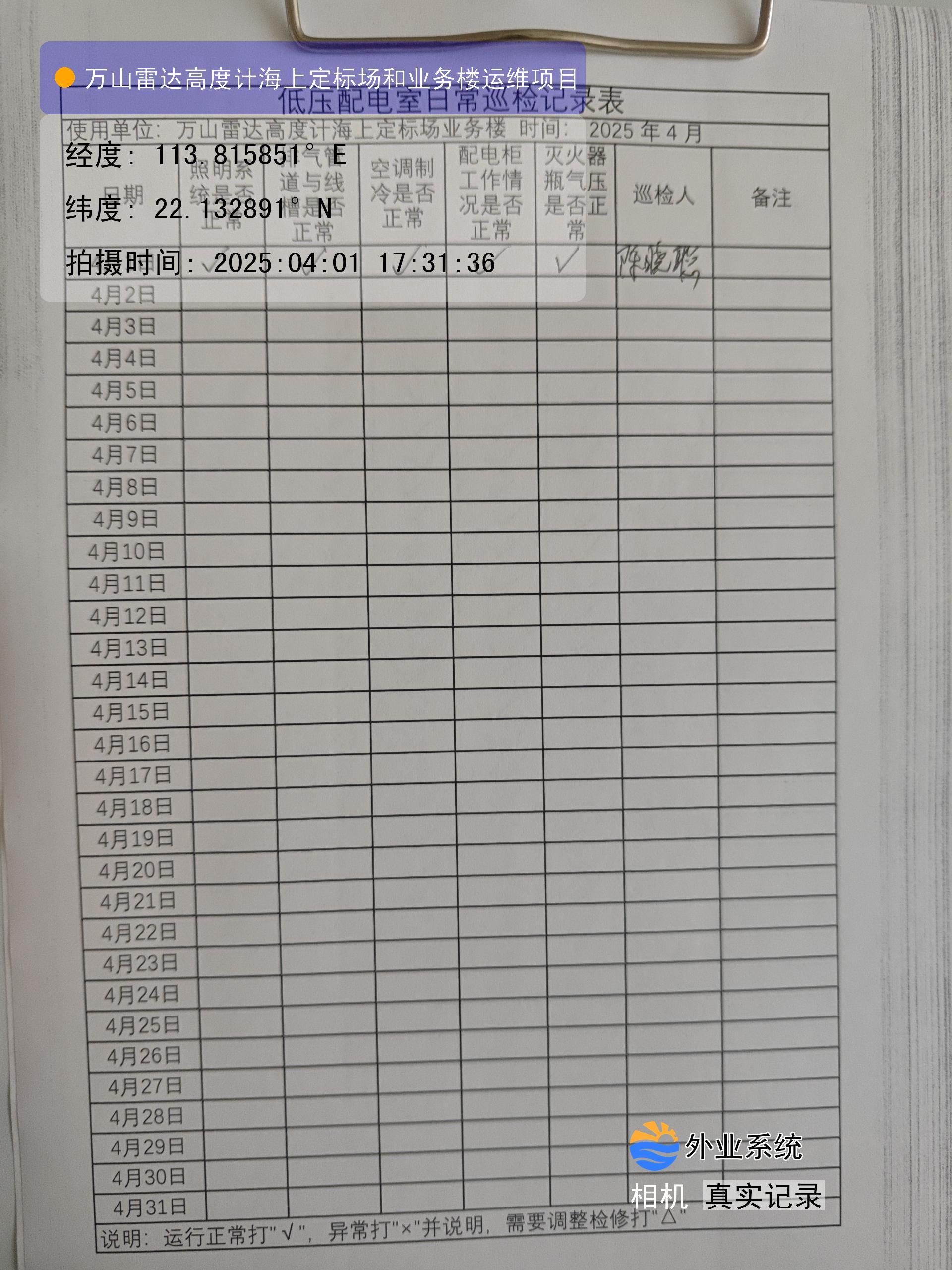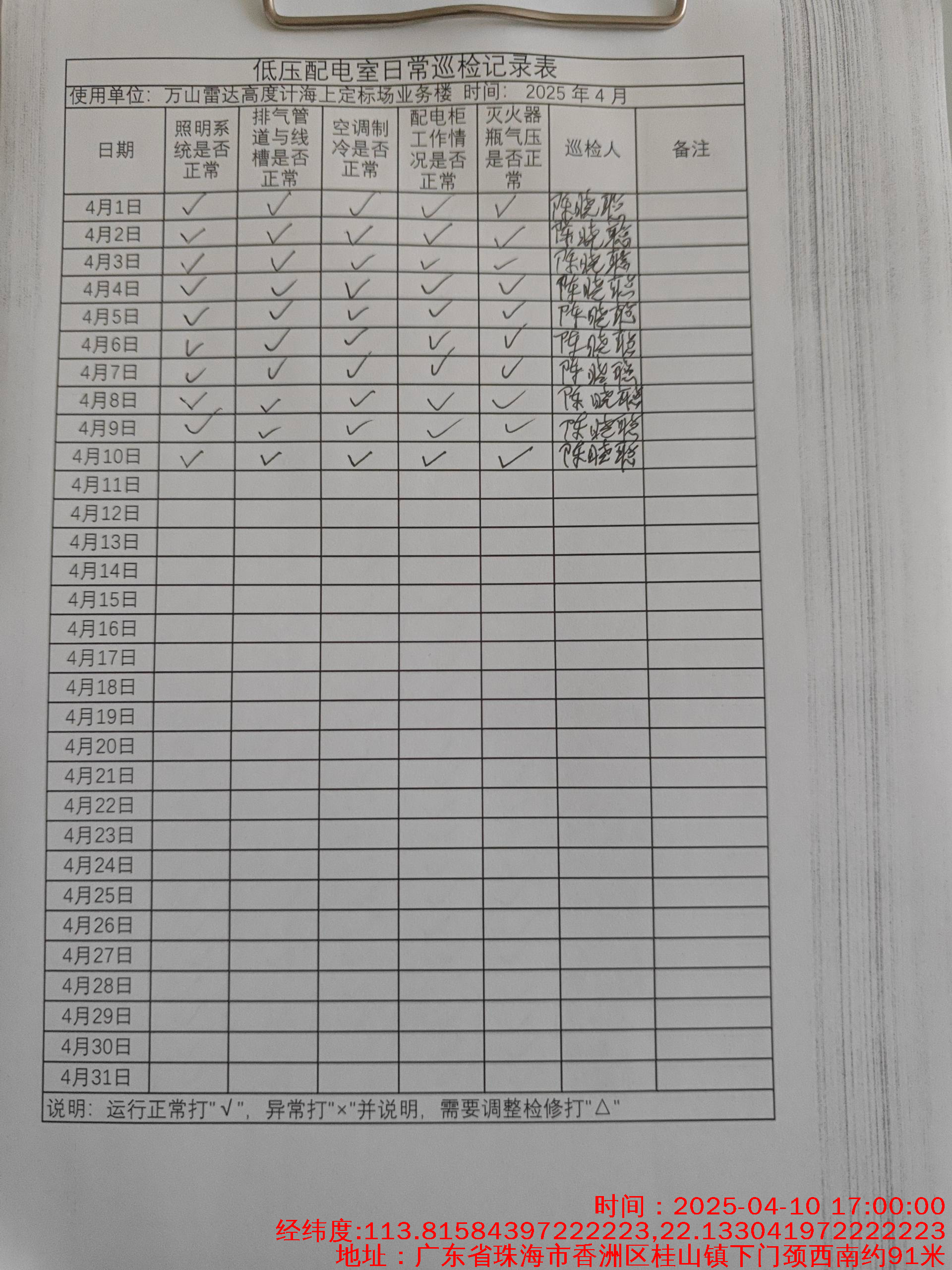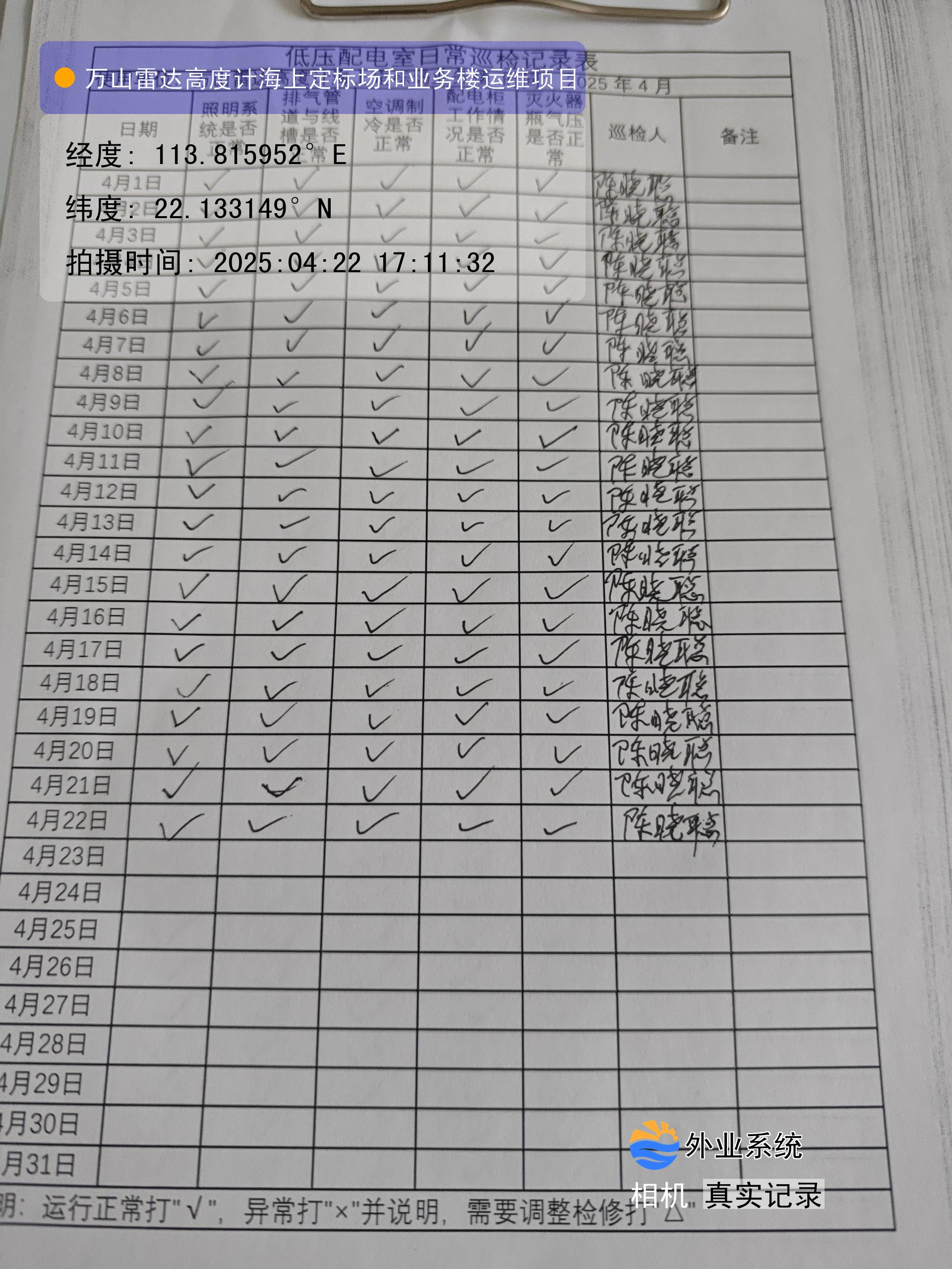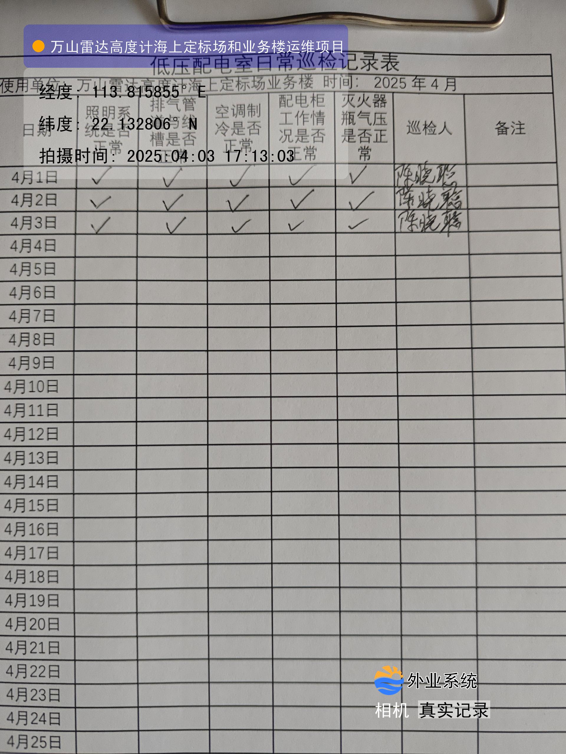 | 记录表-低压配电室日常巡检 | 原图 | 水印1 | 水印2 | 陈晓聪 | 工作照 | 2025-04-01 17:00:00 |
