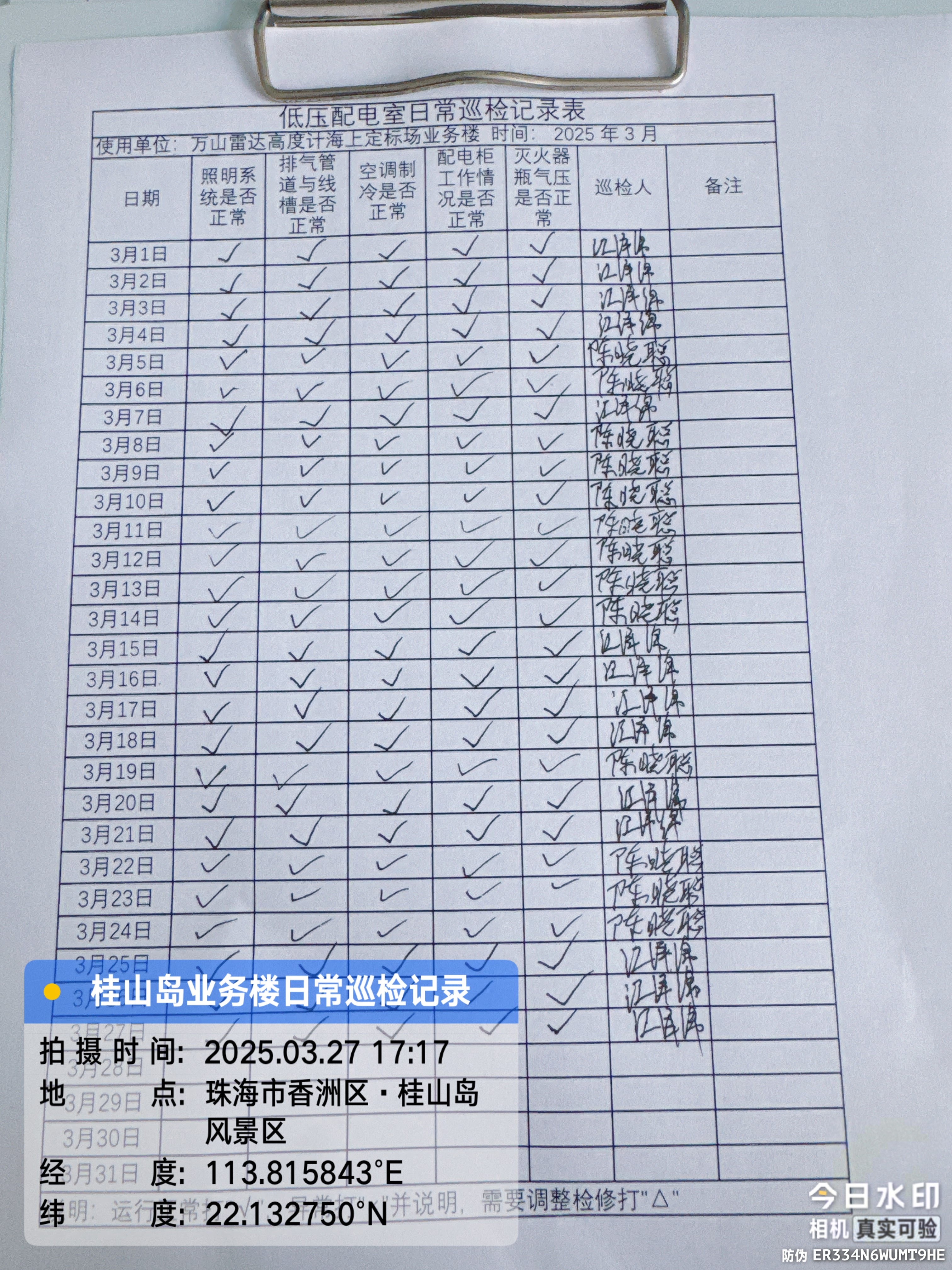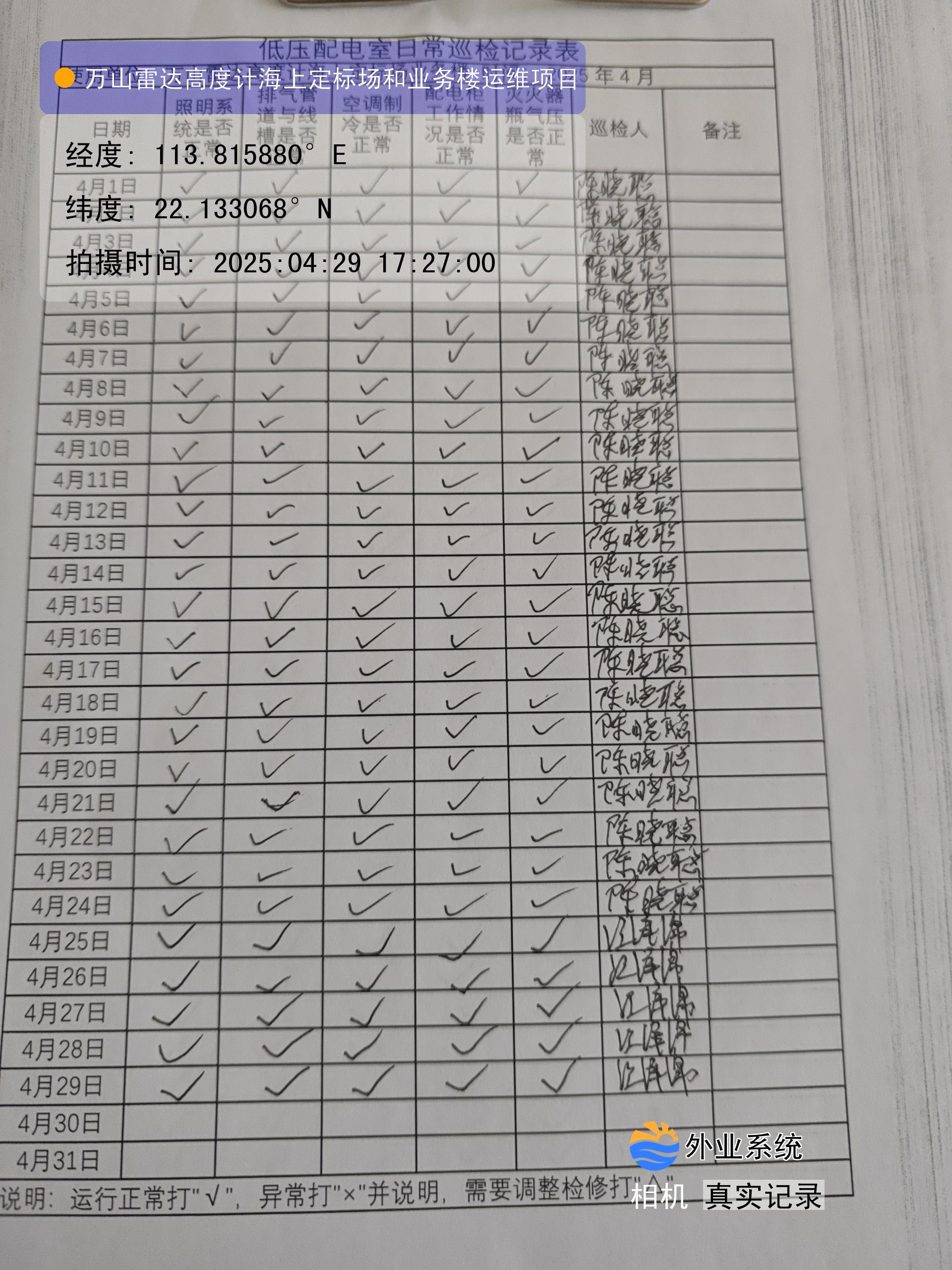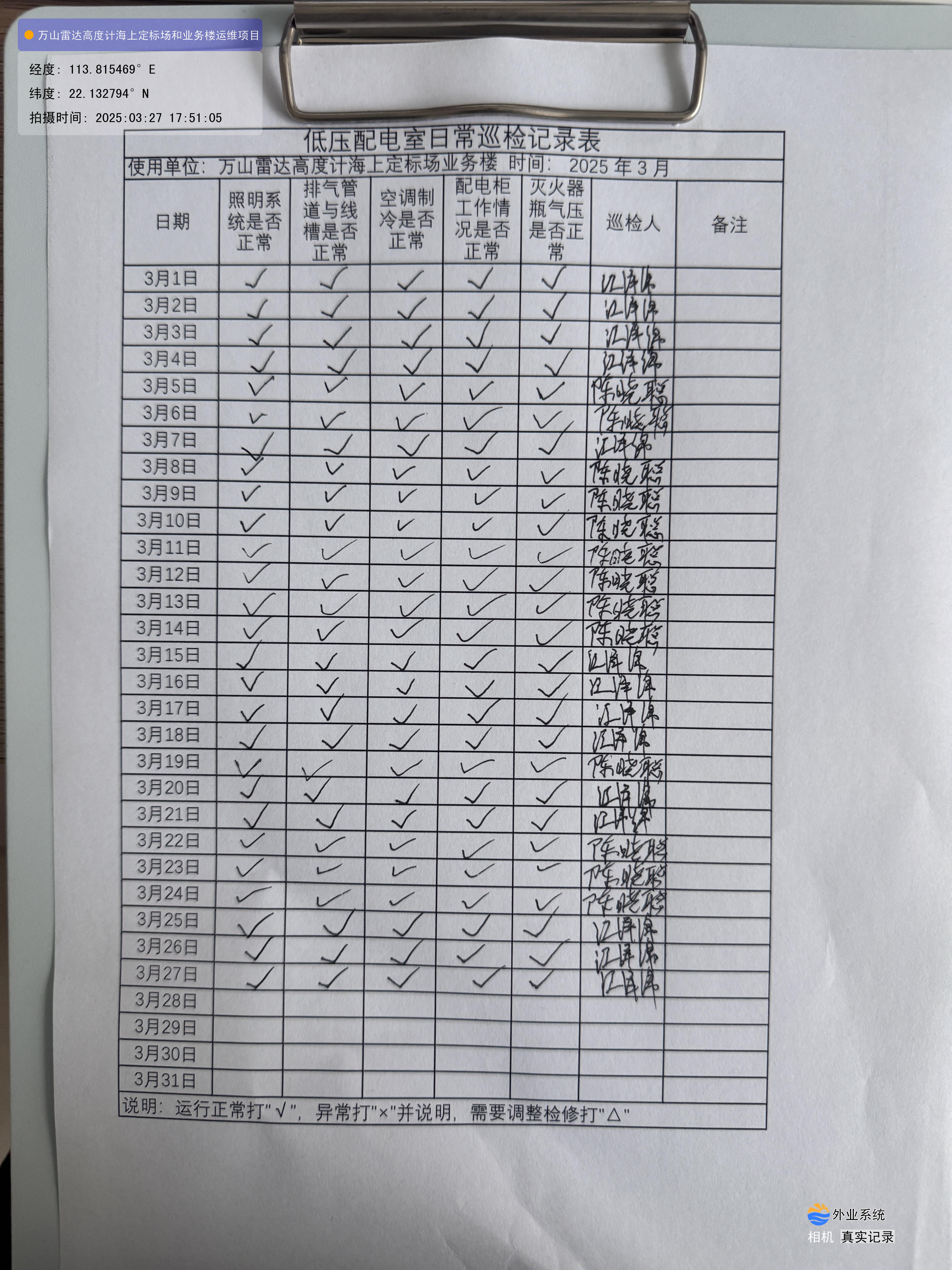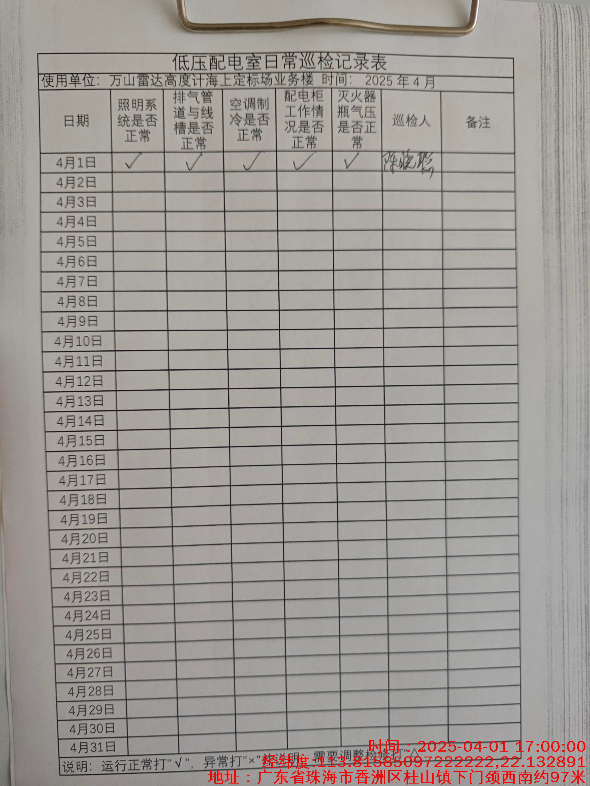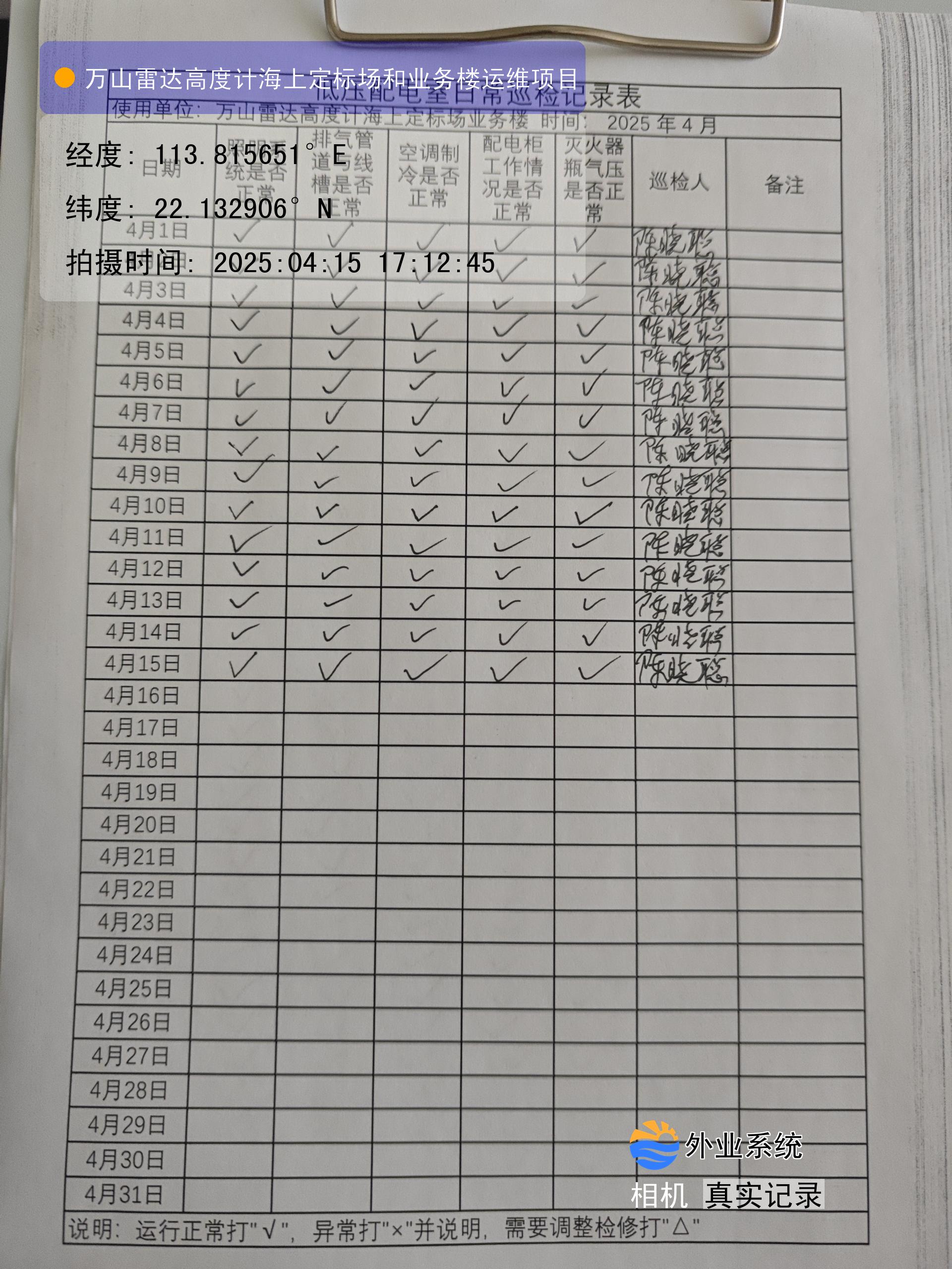 | 记录表-低压配电室日常巡检 | 原图 | 水印1 | 水印2 | 陈晓聪 | 工作照 | 2025-04-01 17:00:00 |