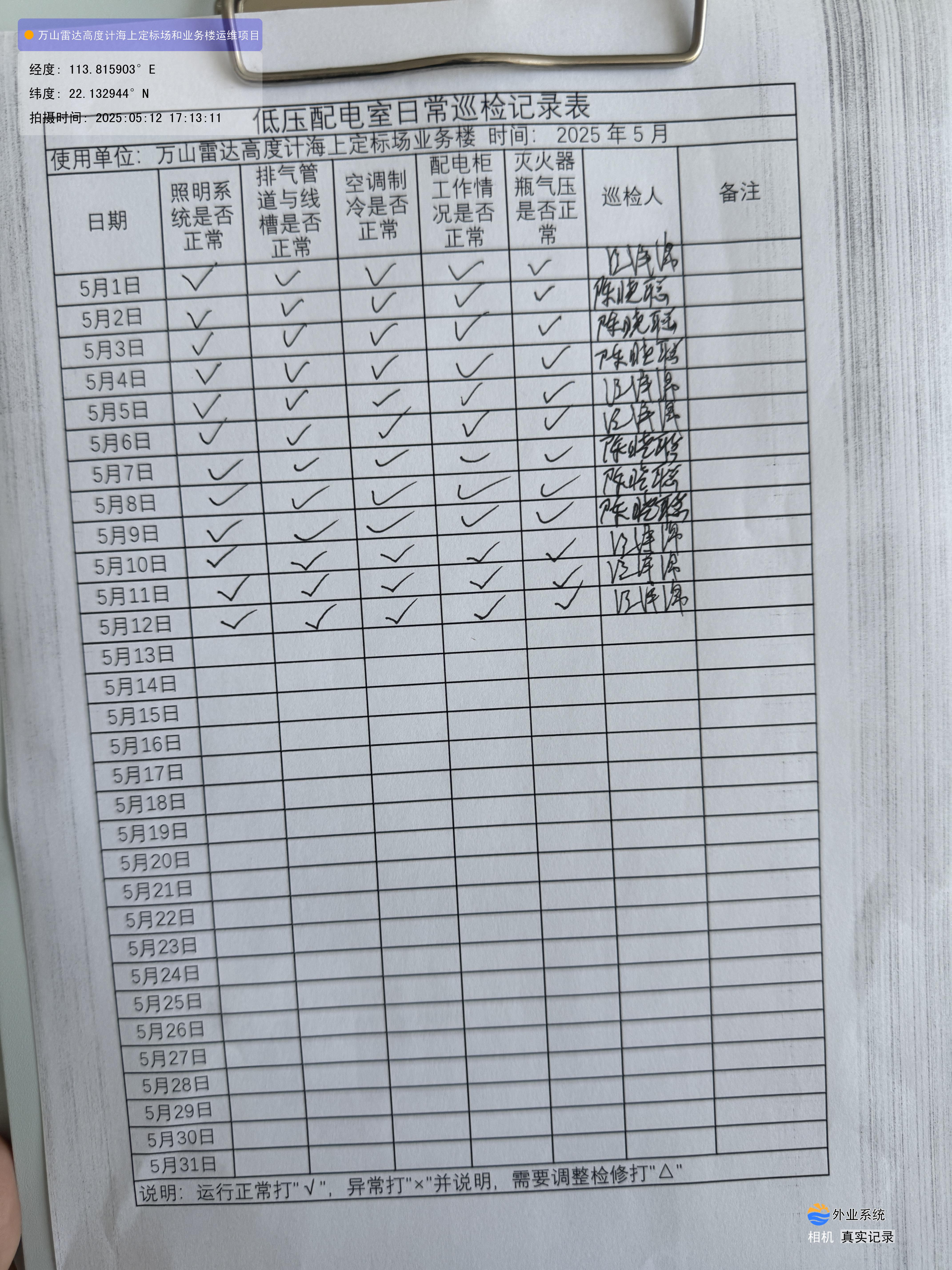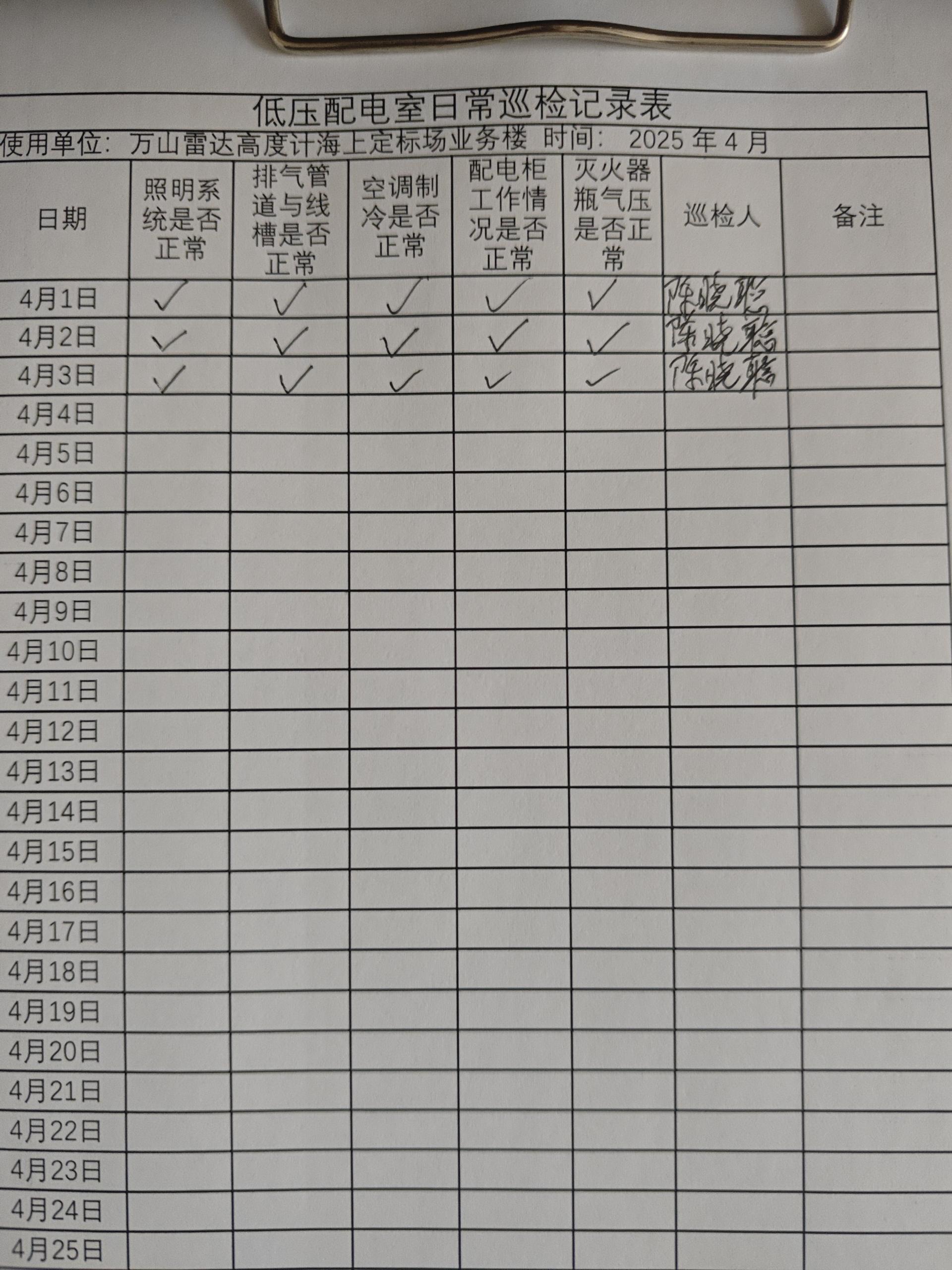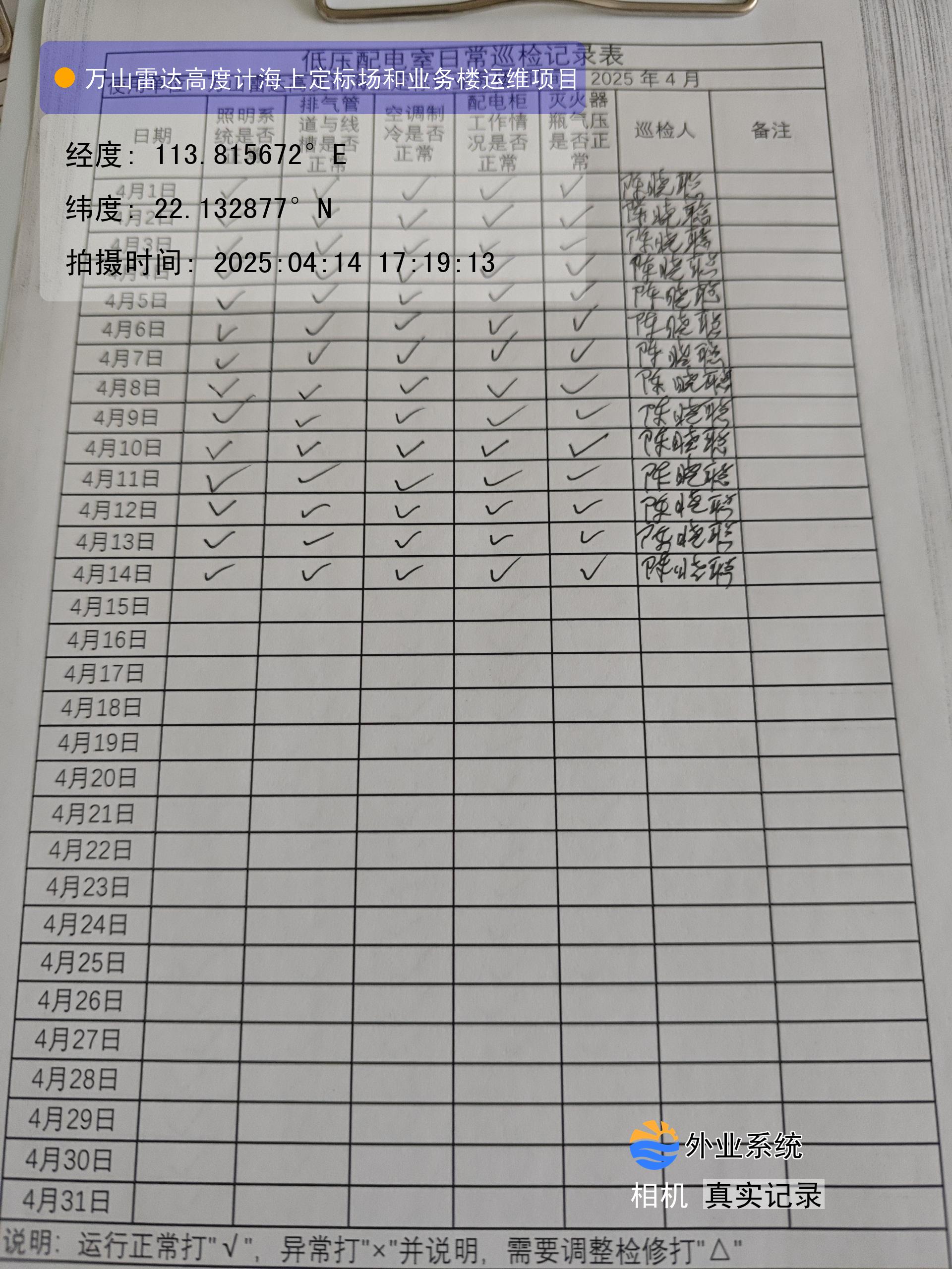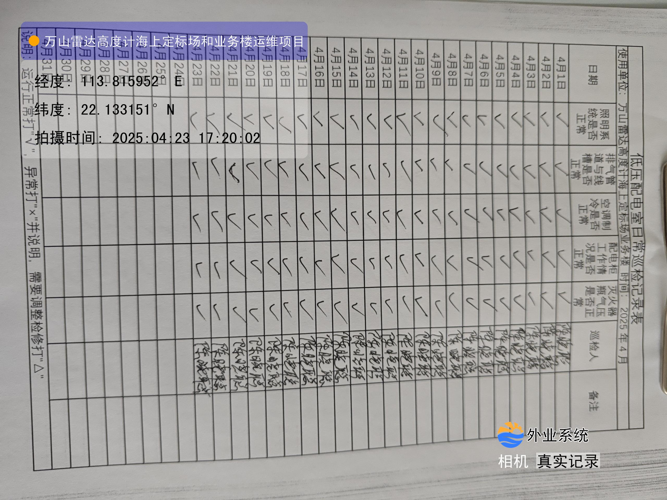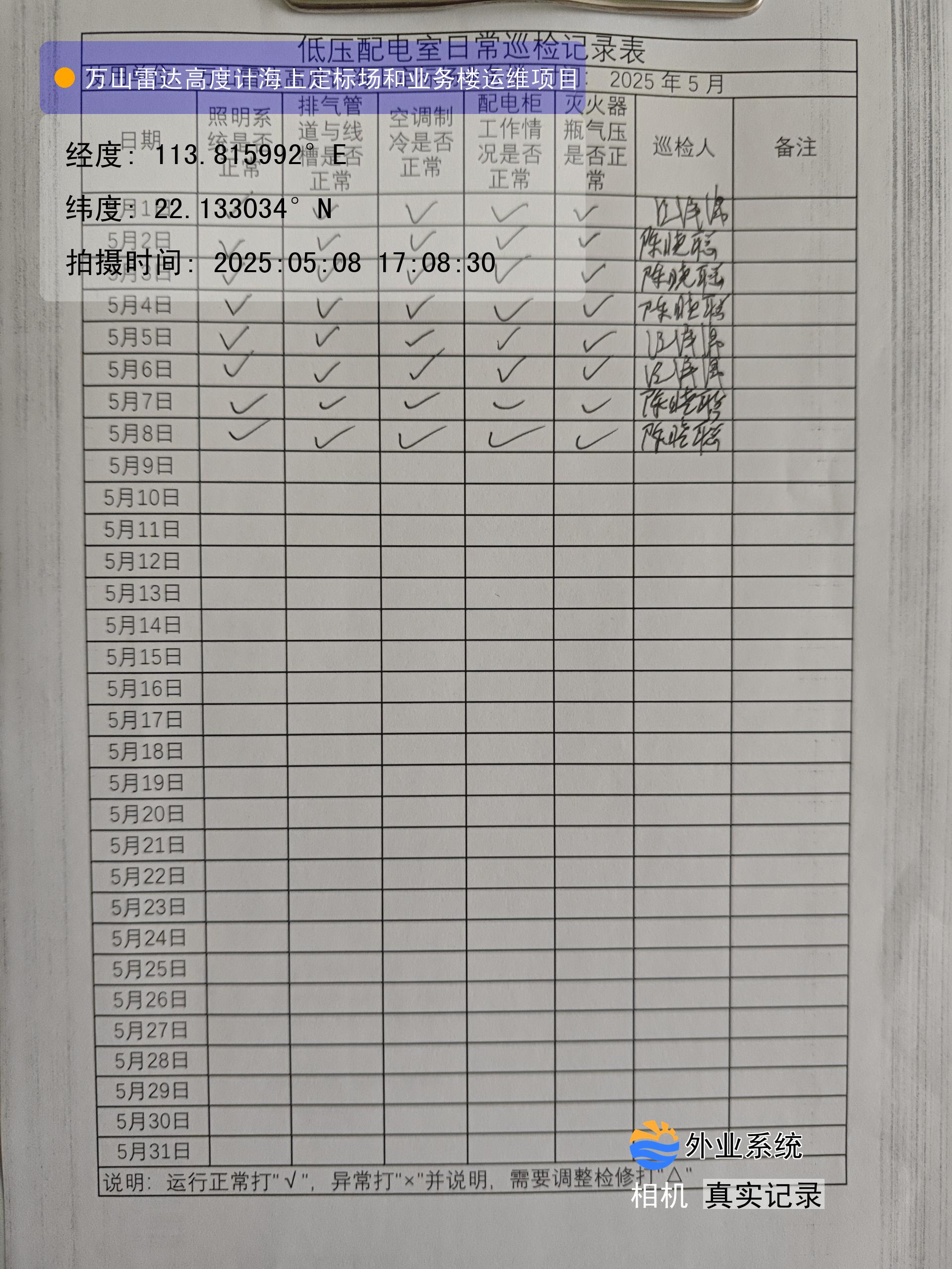 | 记录表-低压配电室日常巡检 | 原图 | 水印1 | 水印2 | 陈晓聪 | 工作照 | 2025-04-01 17:00:00 |