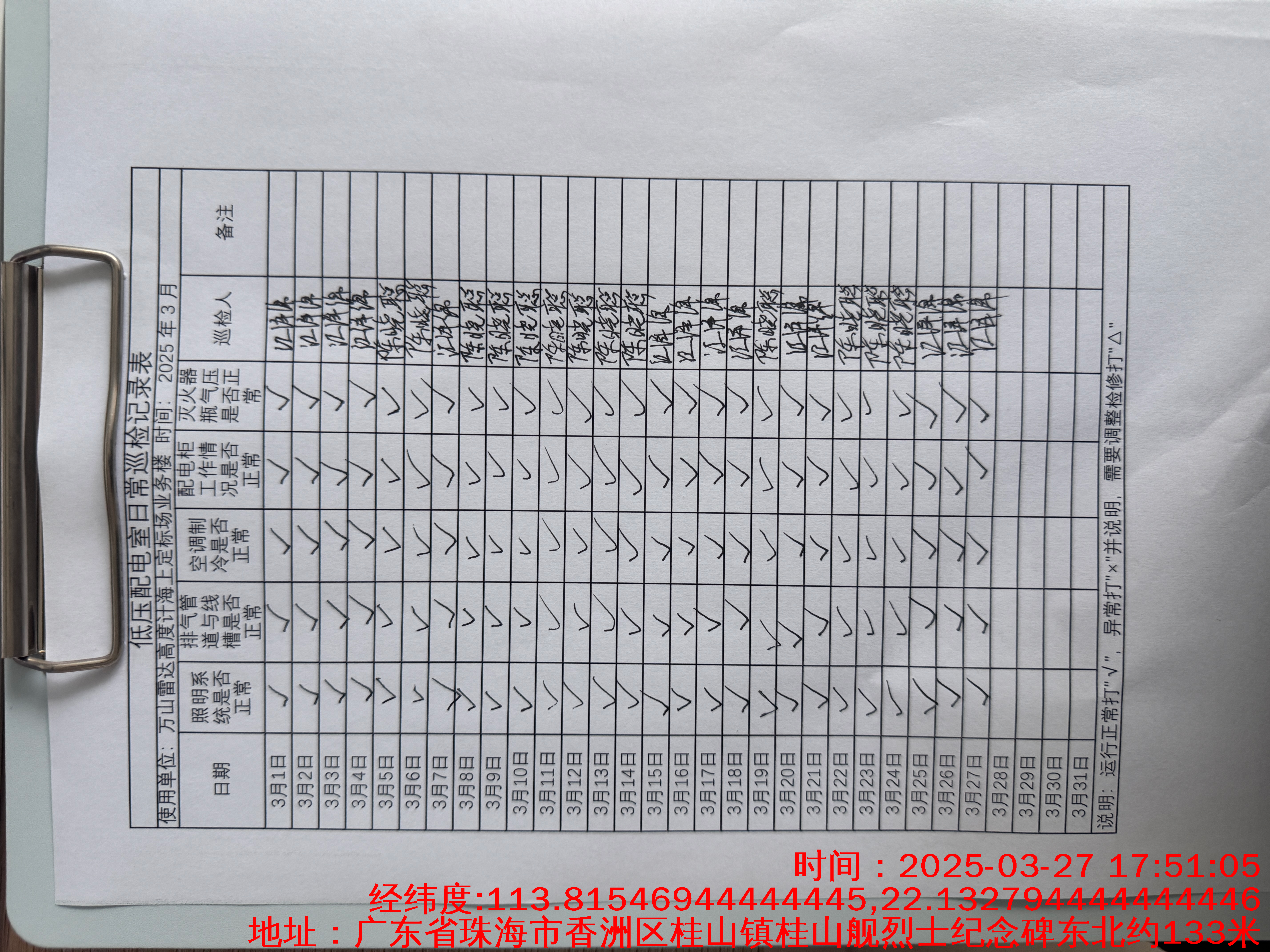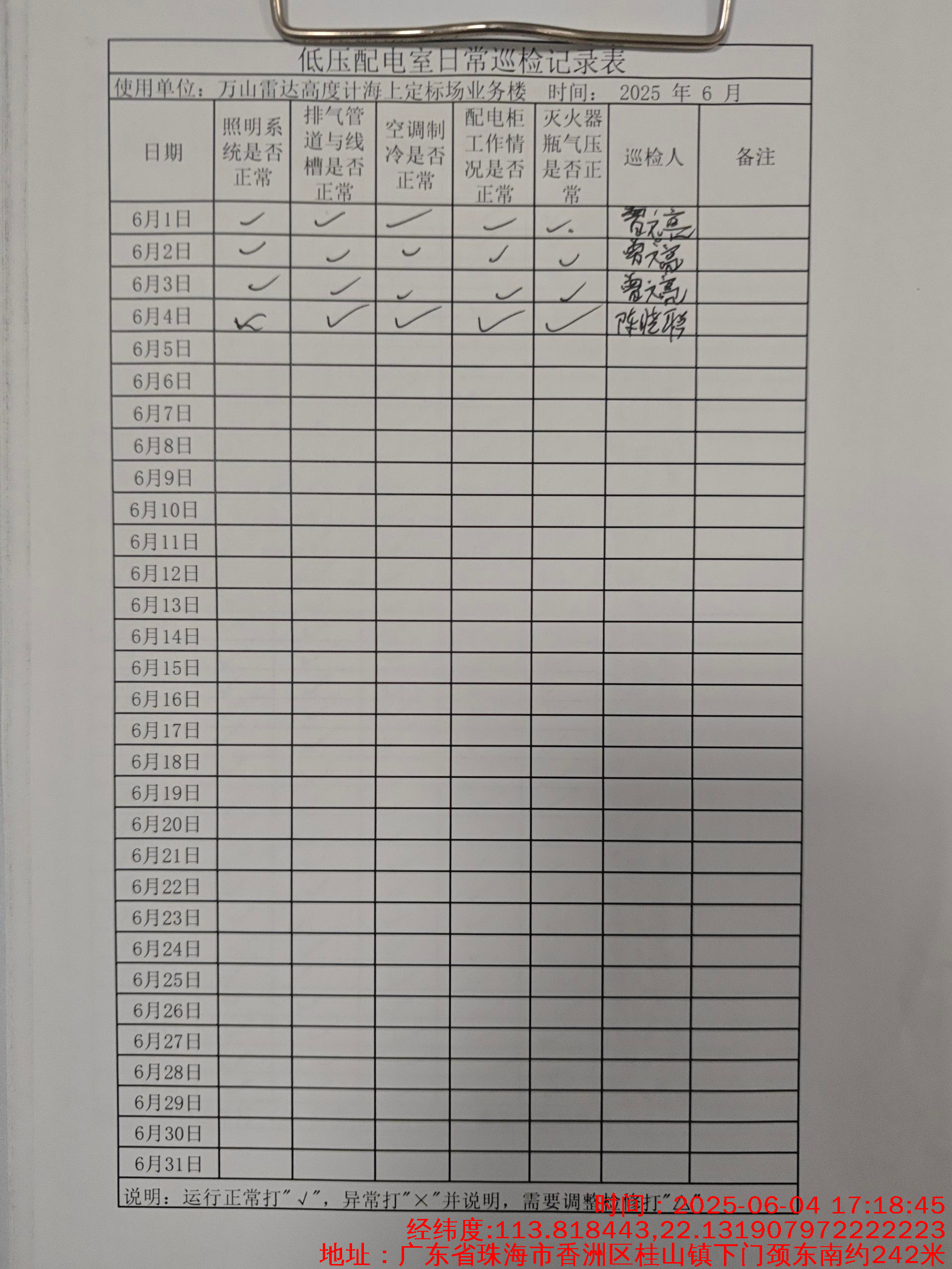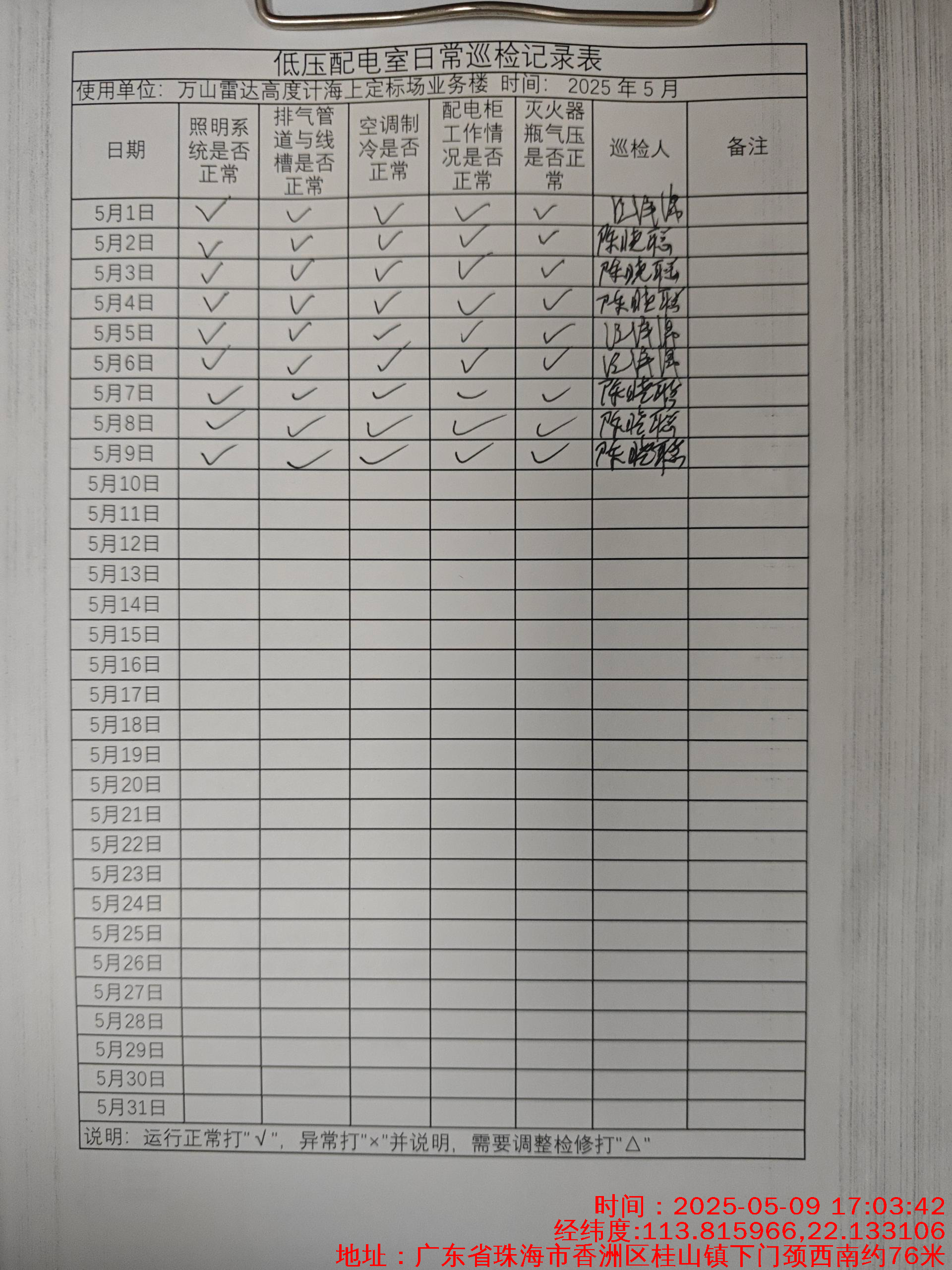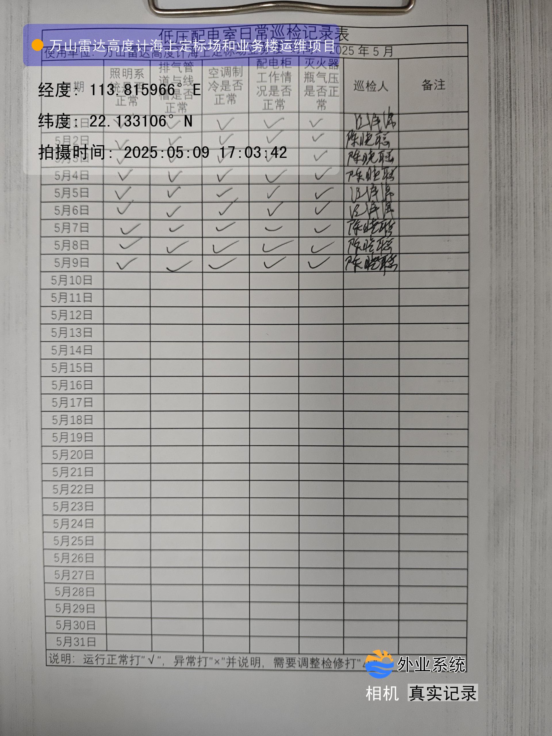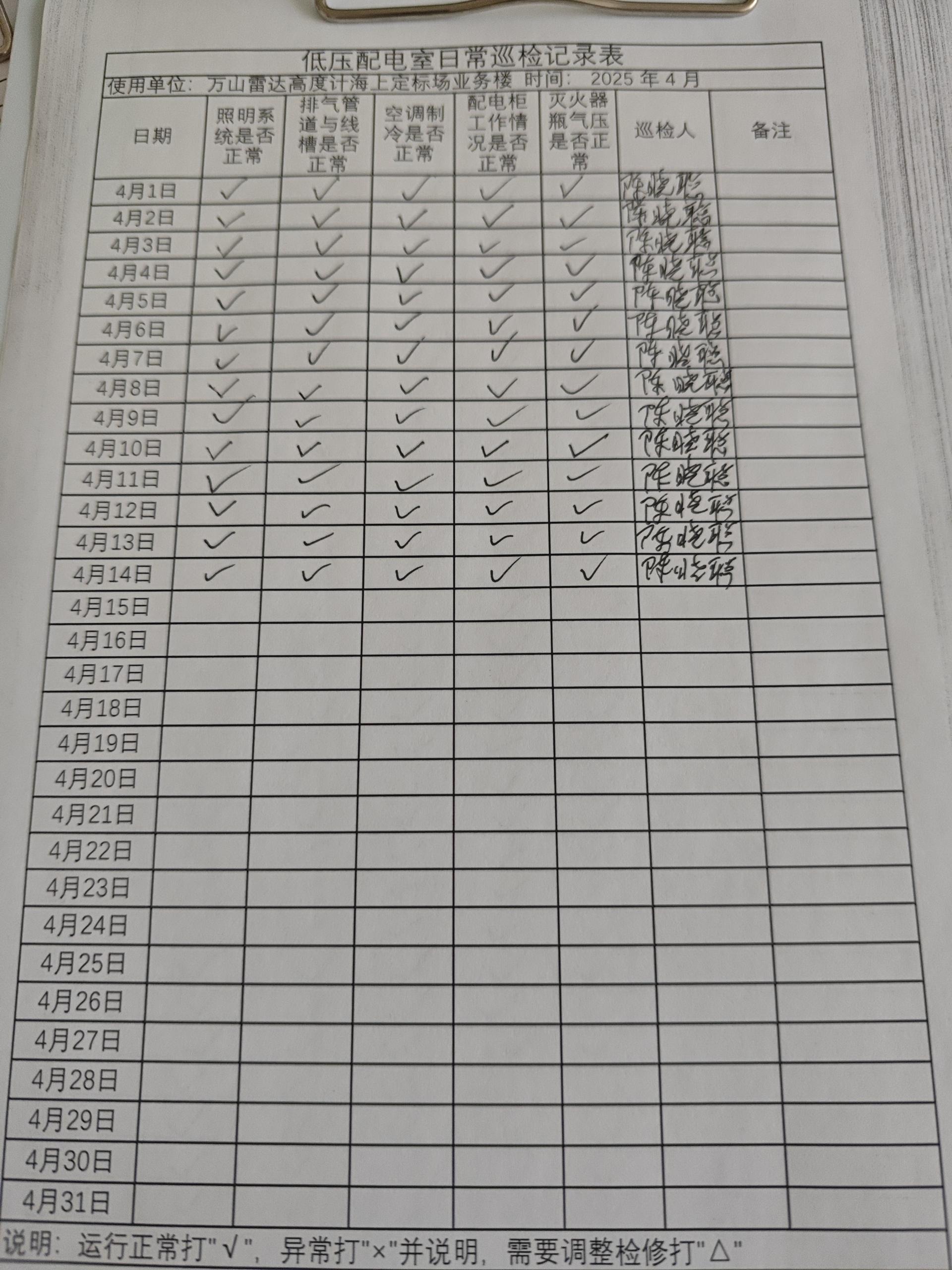 | 记录表-低压配电室日常巡检 | 原图 | 水印1 | 水印2 | 陈晓聪 | 工作照 | 2025-04-01 17:00:00 |