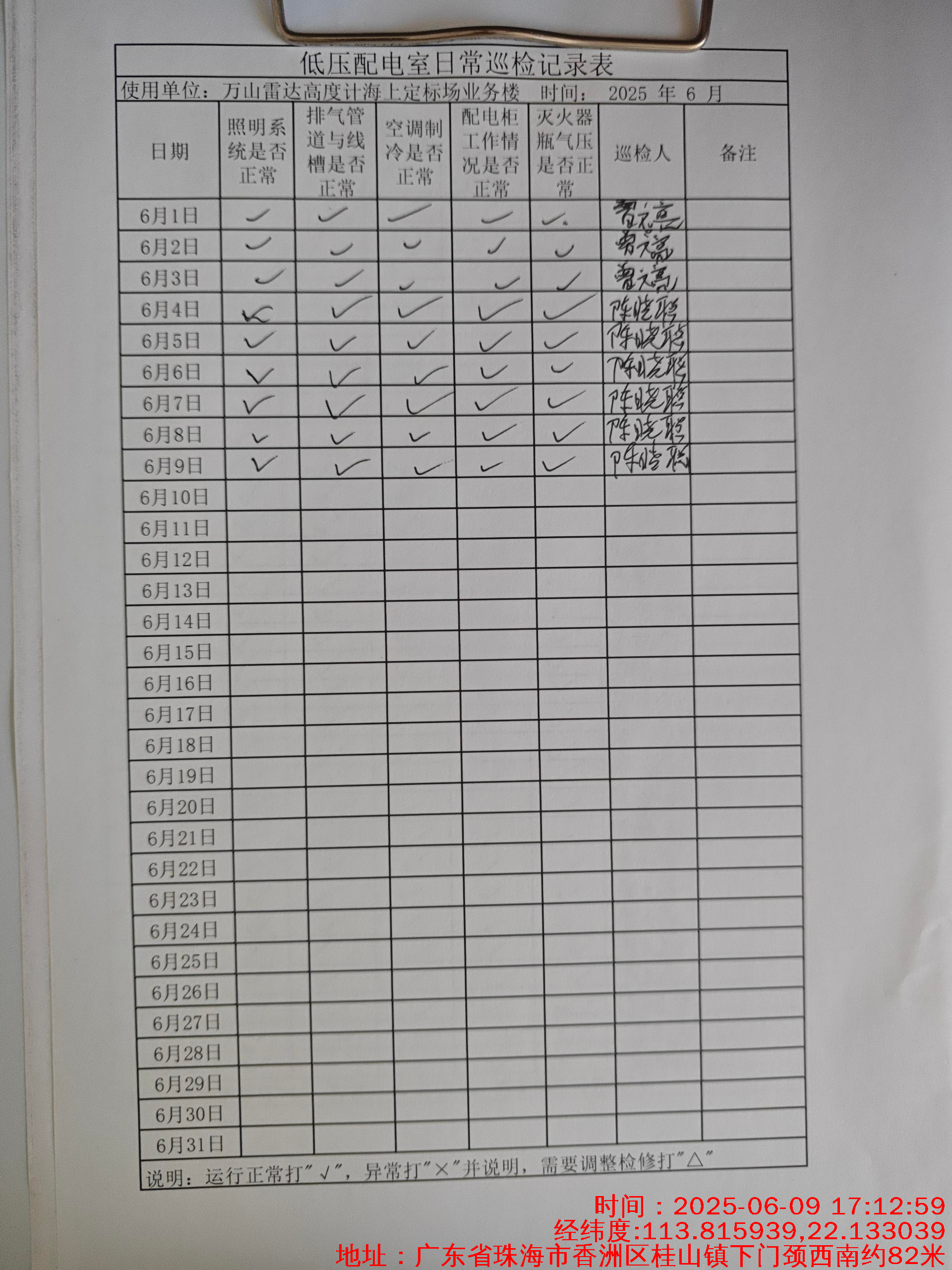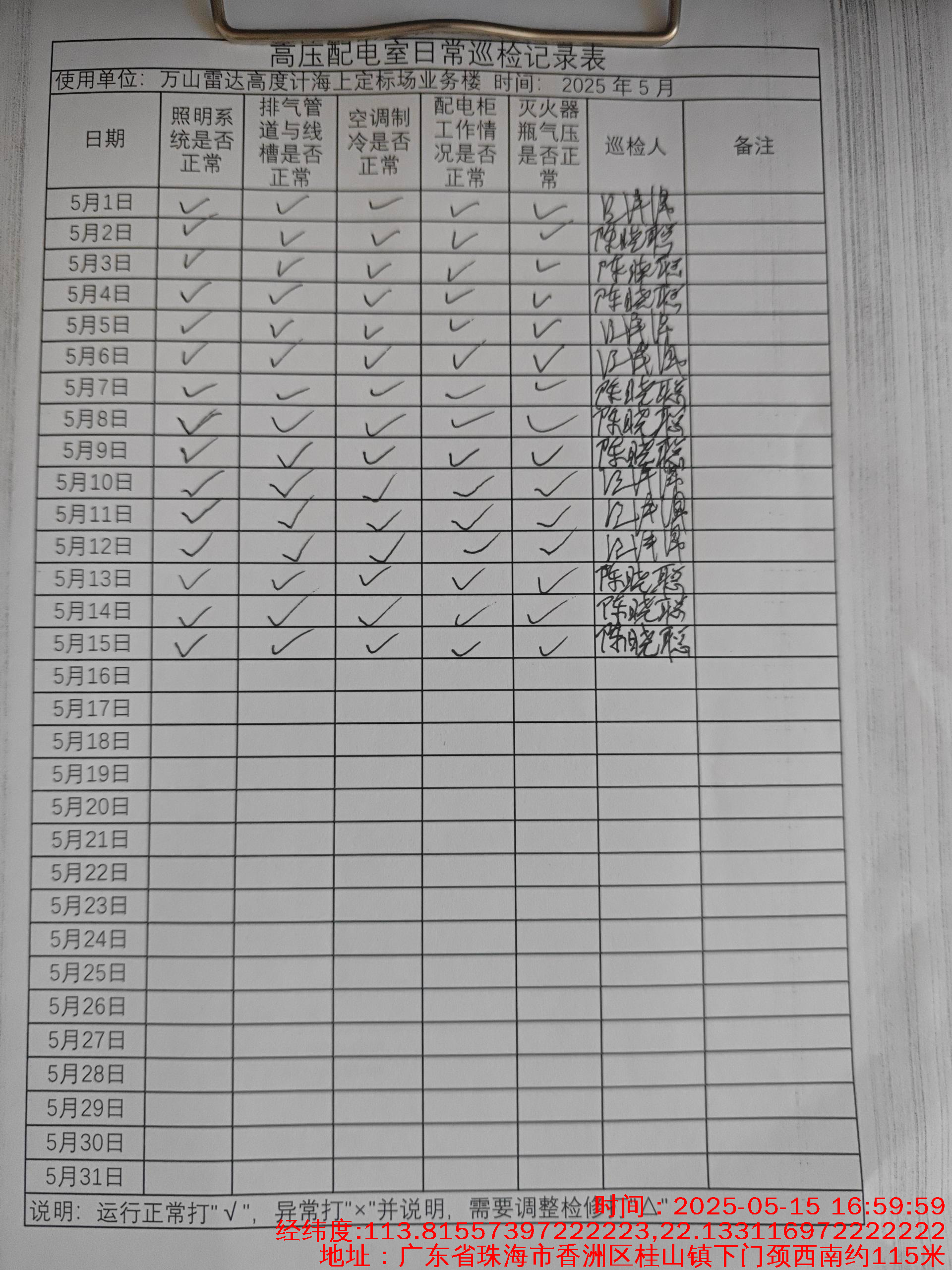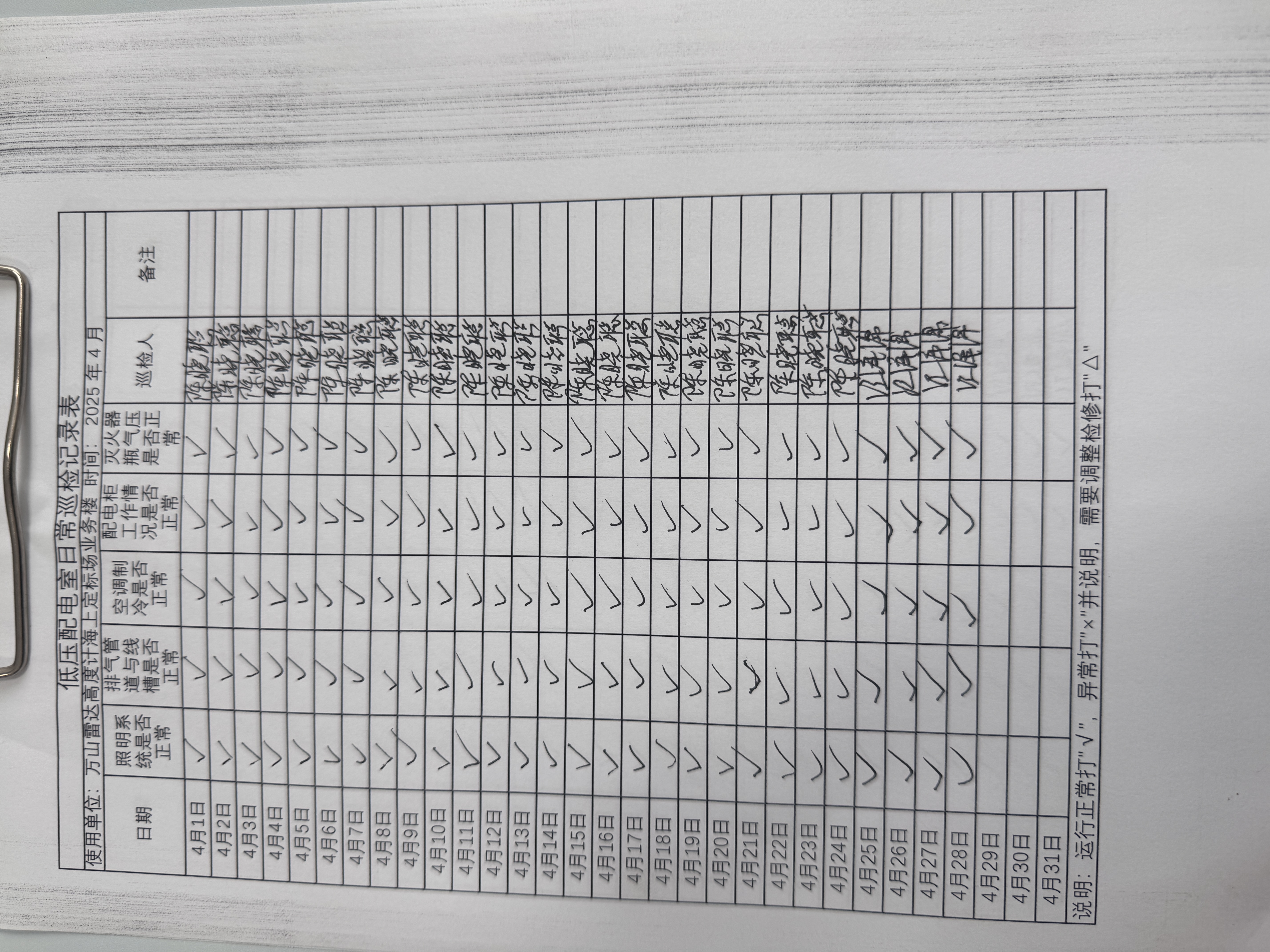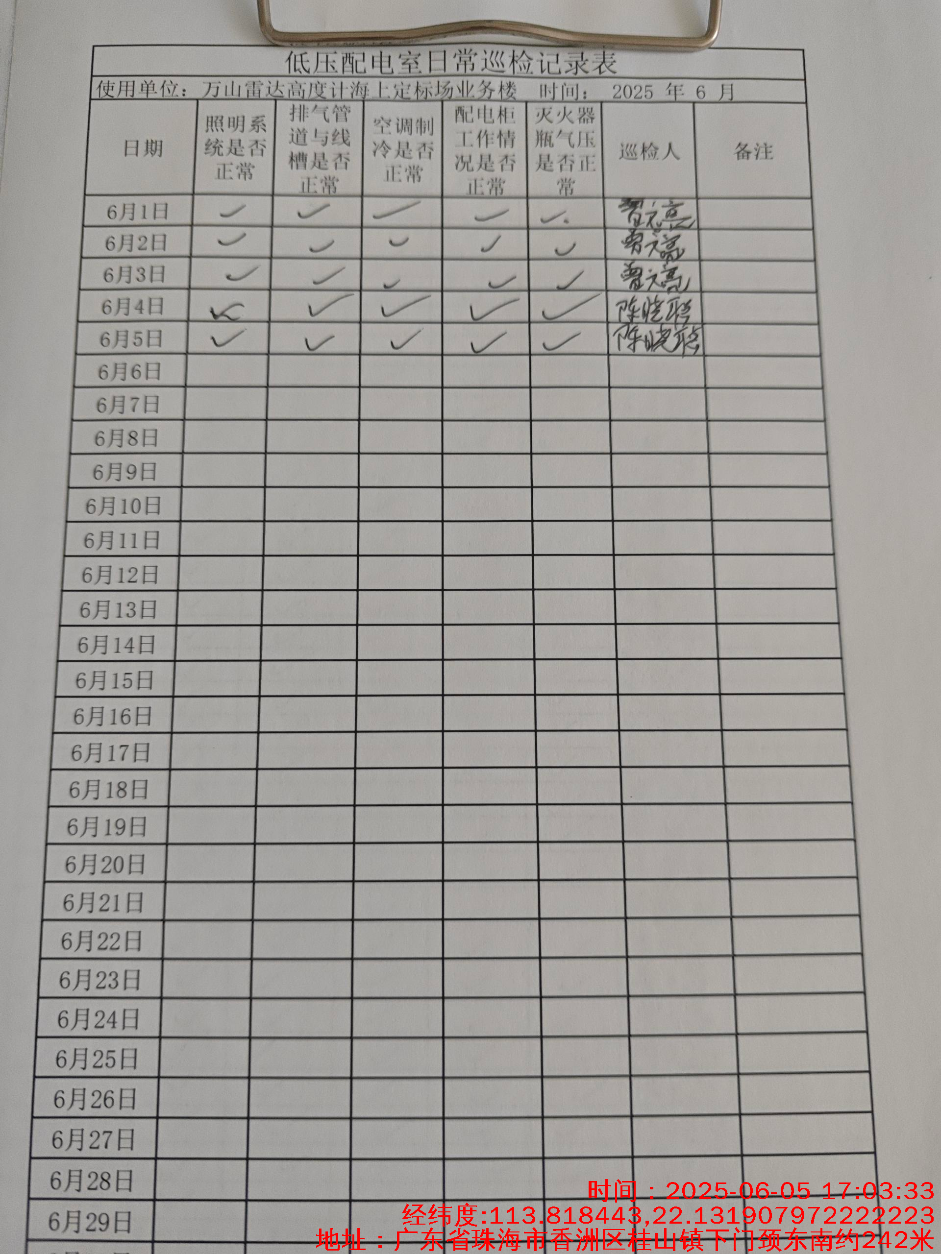 | 记录表-低压配电室日常巡检 | 原图 | 水印1 | 水印2 | 陈晓聪 | 工作照 | 2025-04-01 17:00:00 |