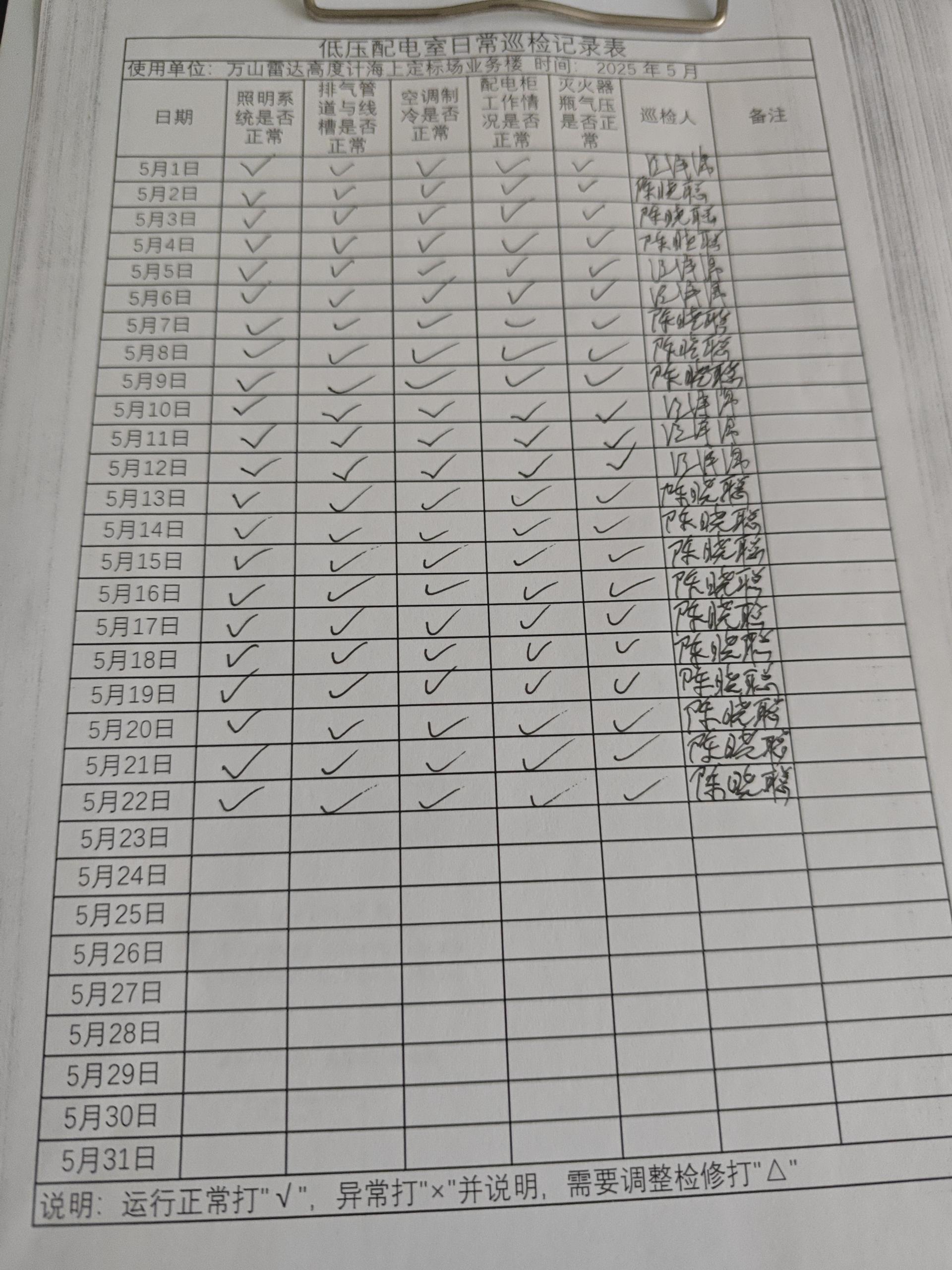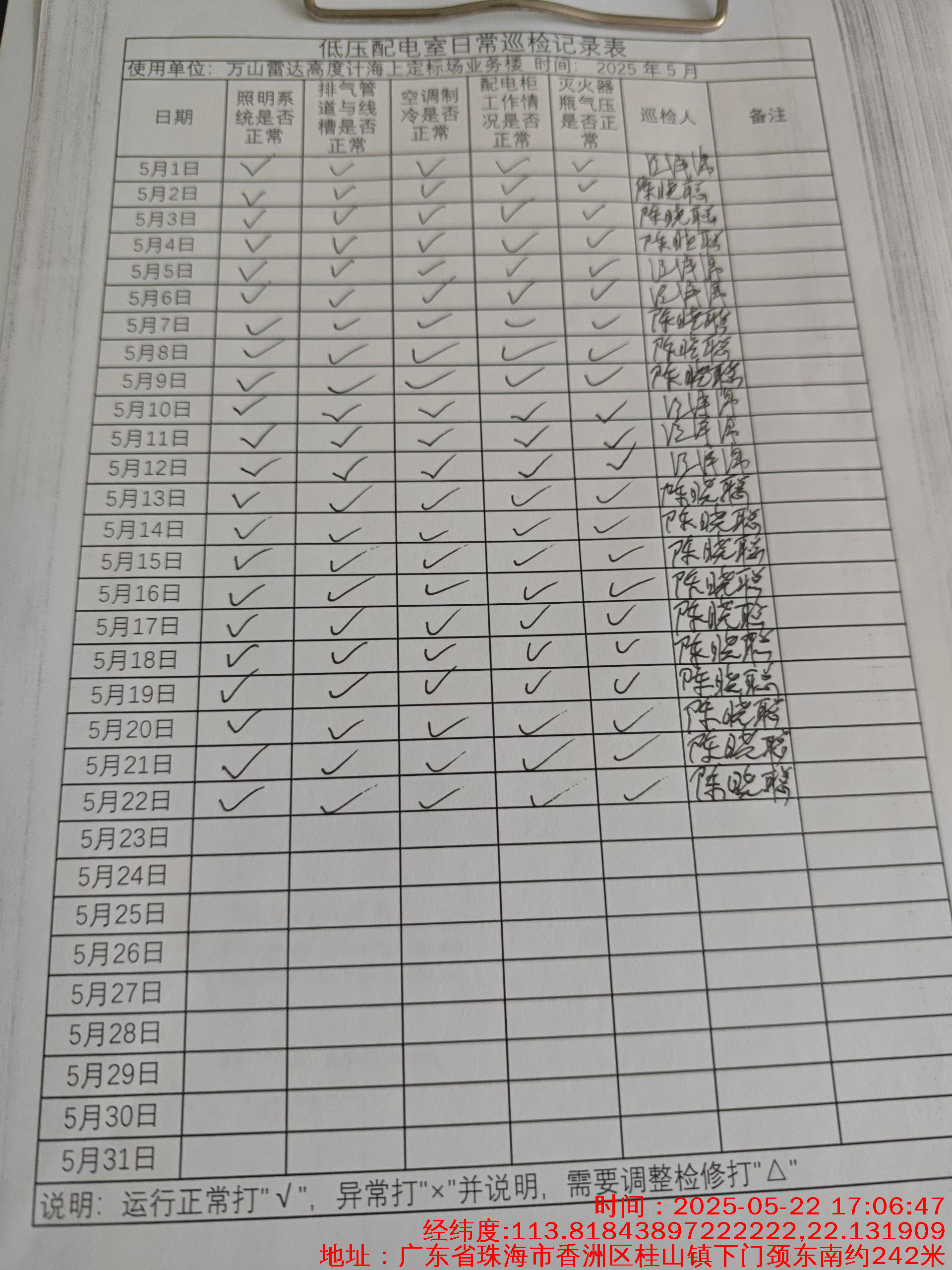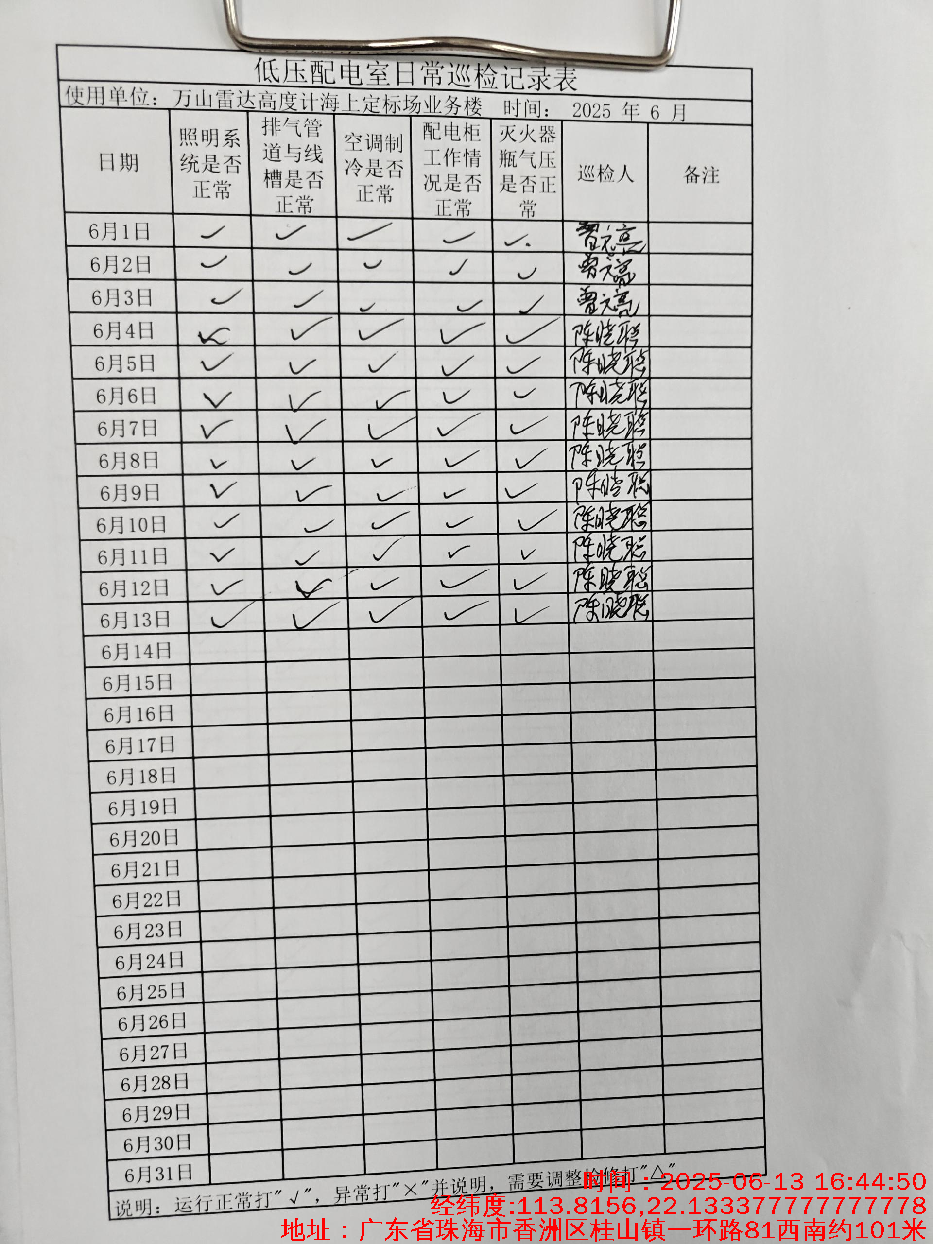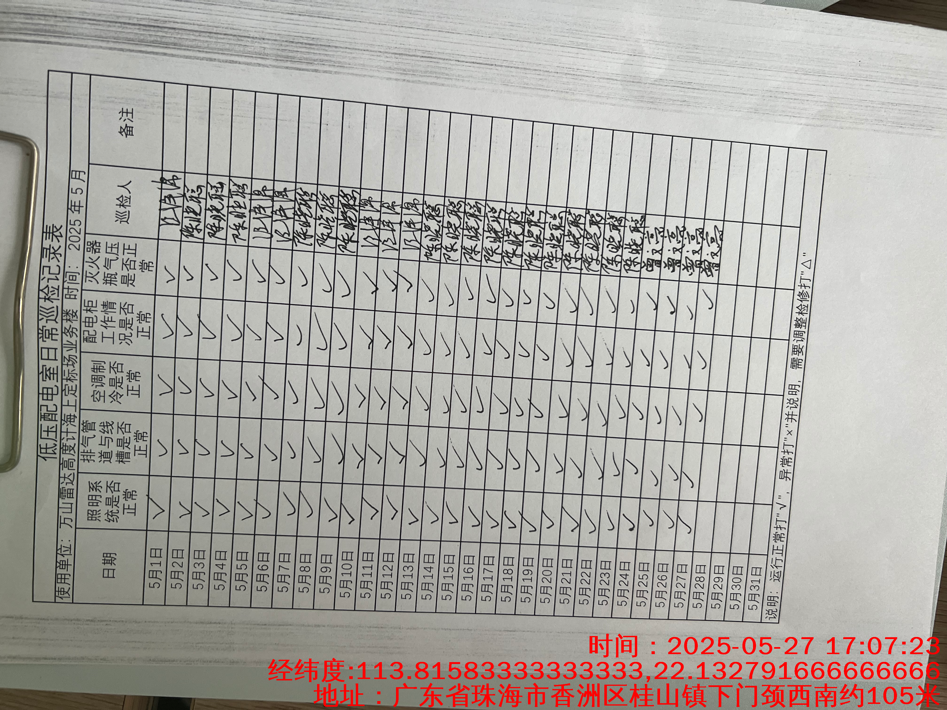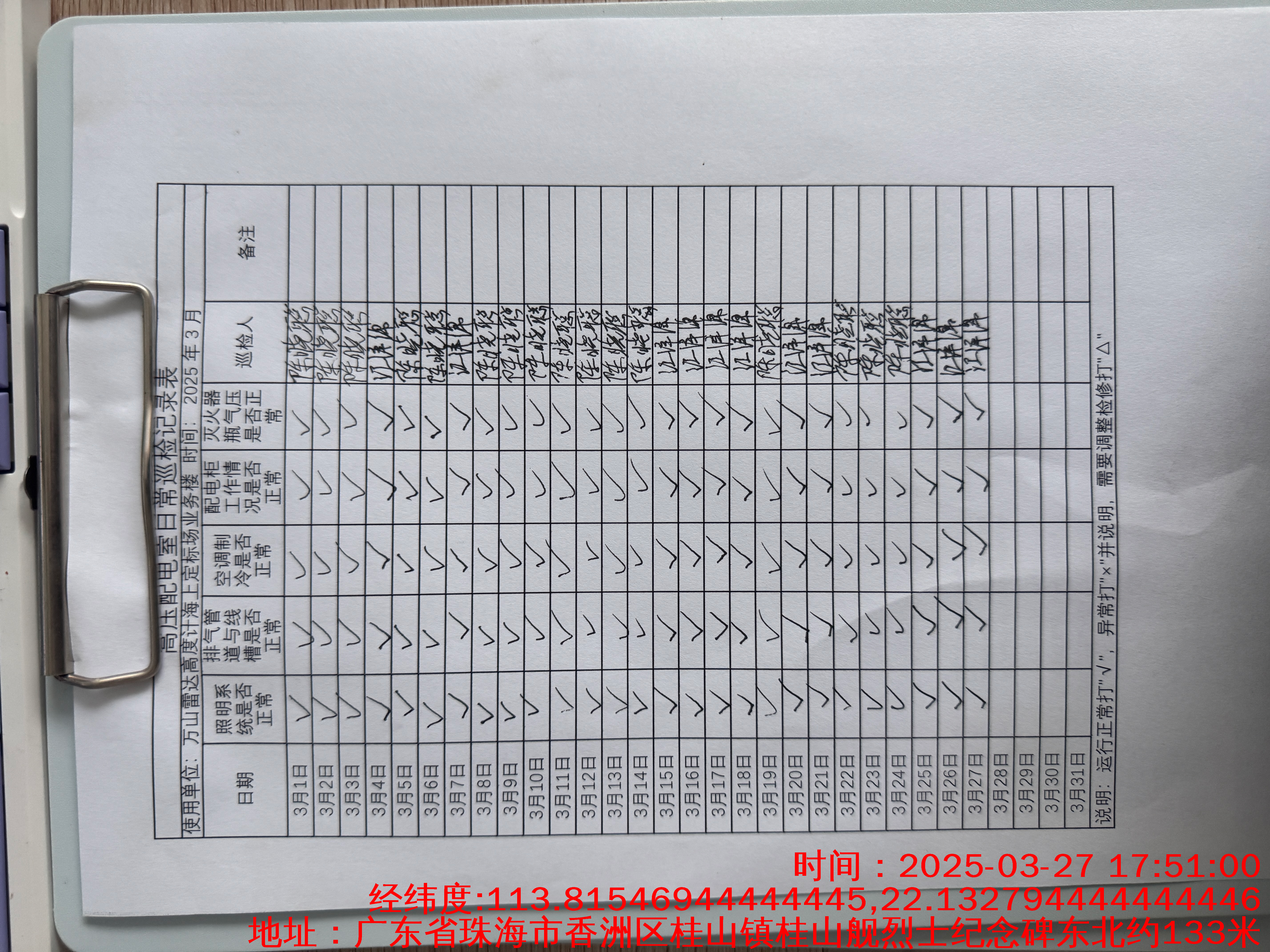 | 记录表-低压配电室日常巡检 | 原图 | 水印1 | 水印2 | 陈晓聪 | 工作照 | 2025-04-01 17:00:00 |
