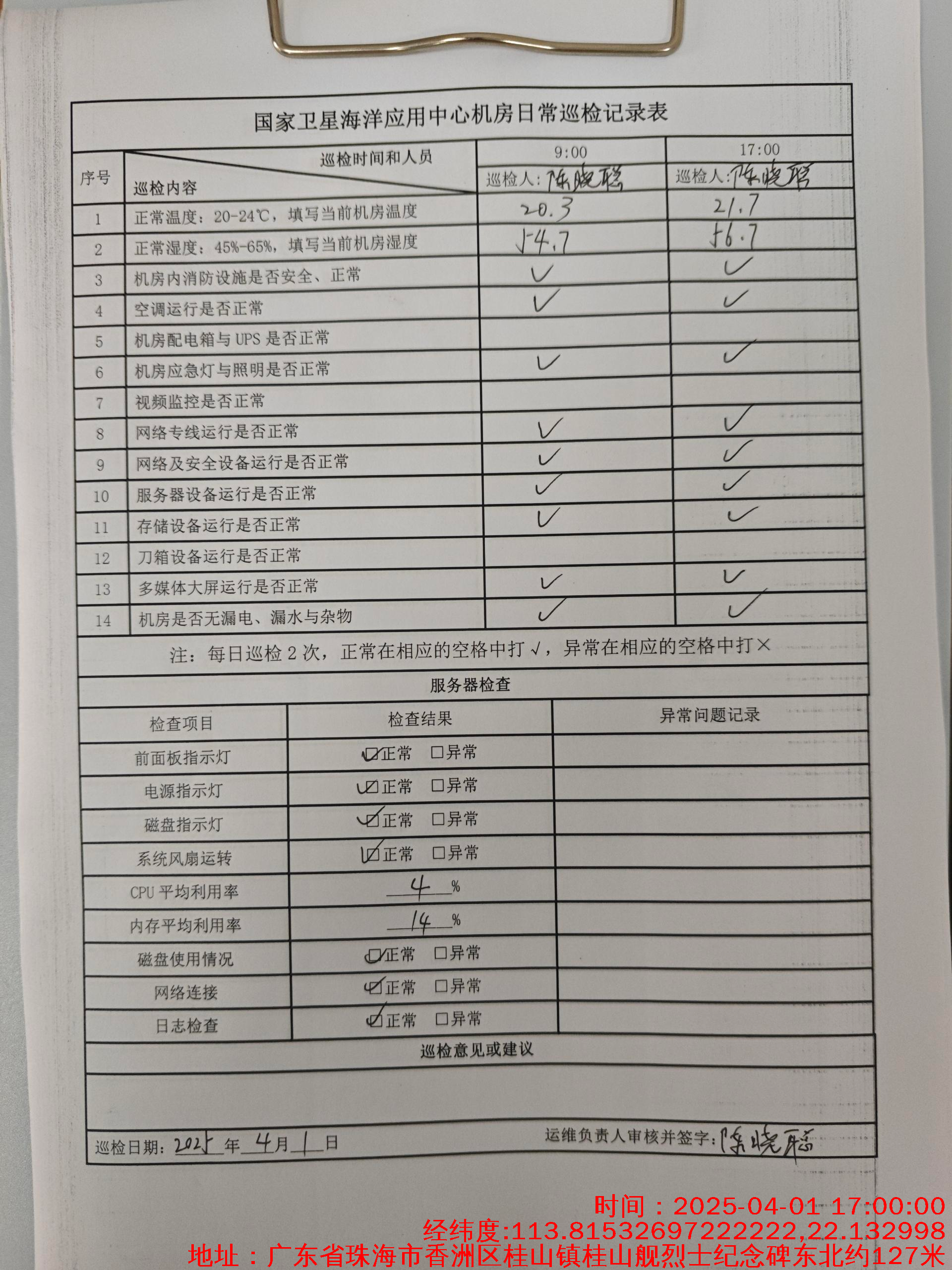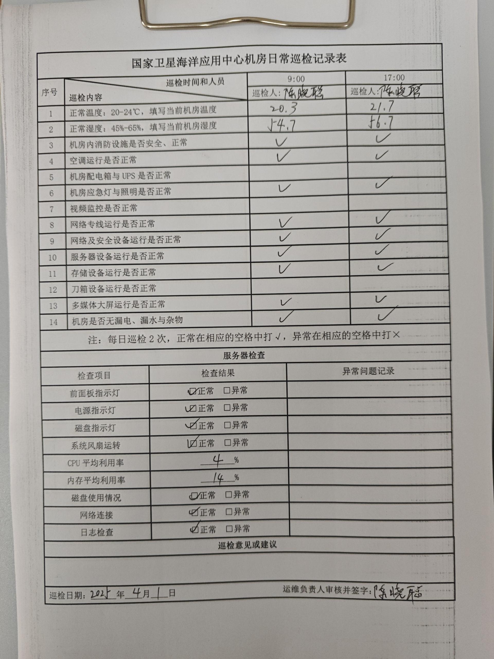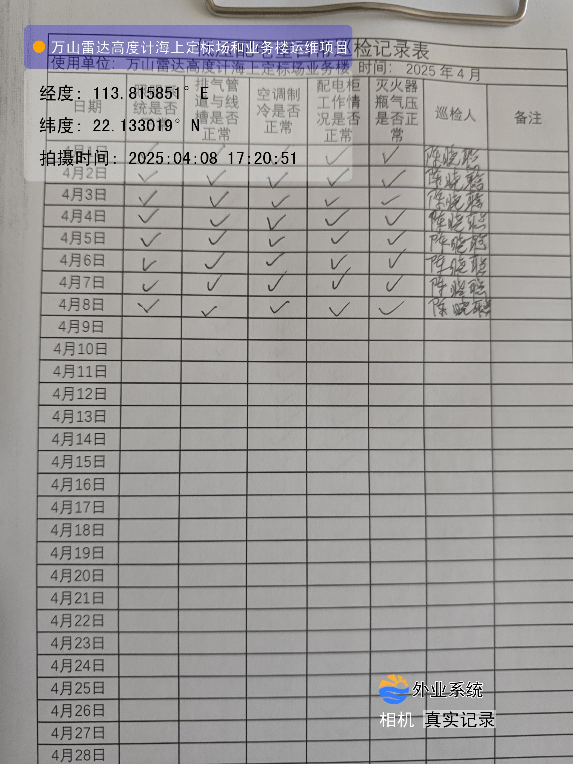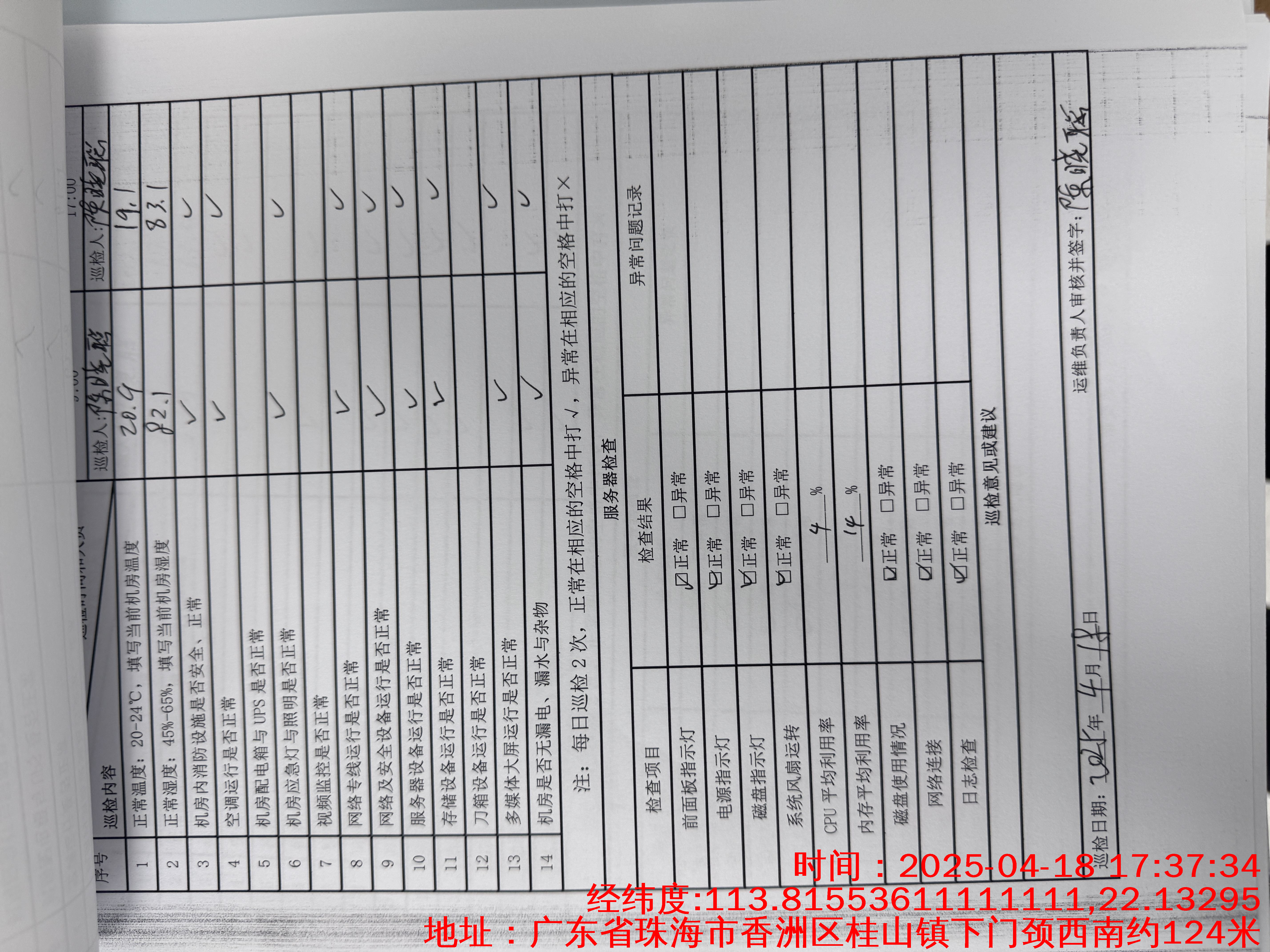 | 记录表-机房日常巡检 | 原图 | 水印1 | 水印2 | 陈晓聪 | 工作照 | 2025-04-02 17:00:00 |