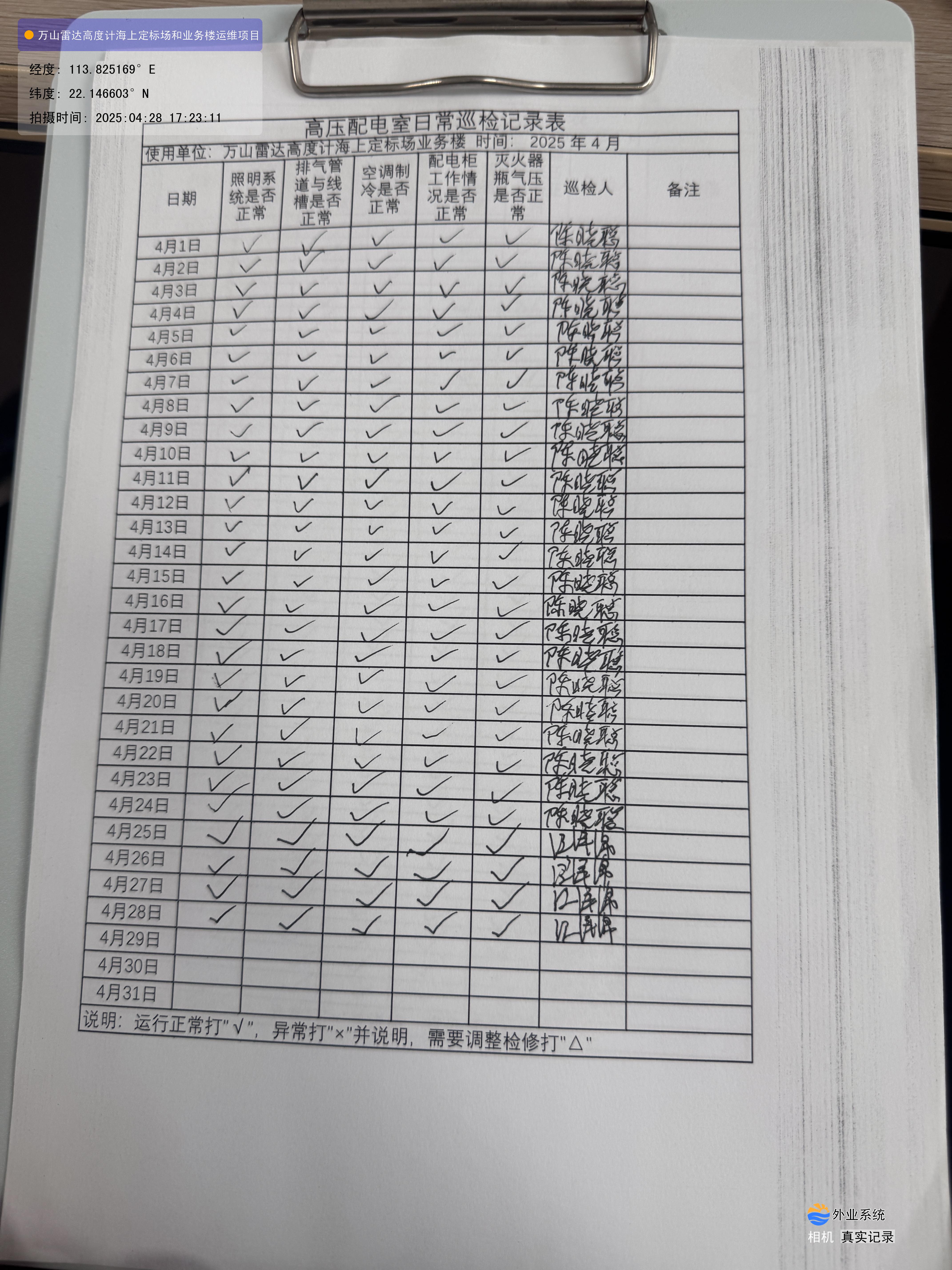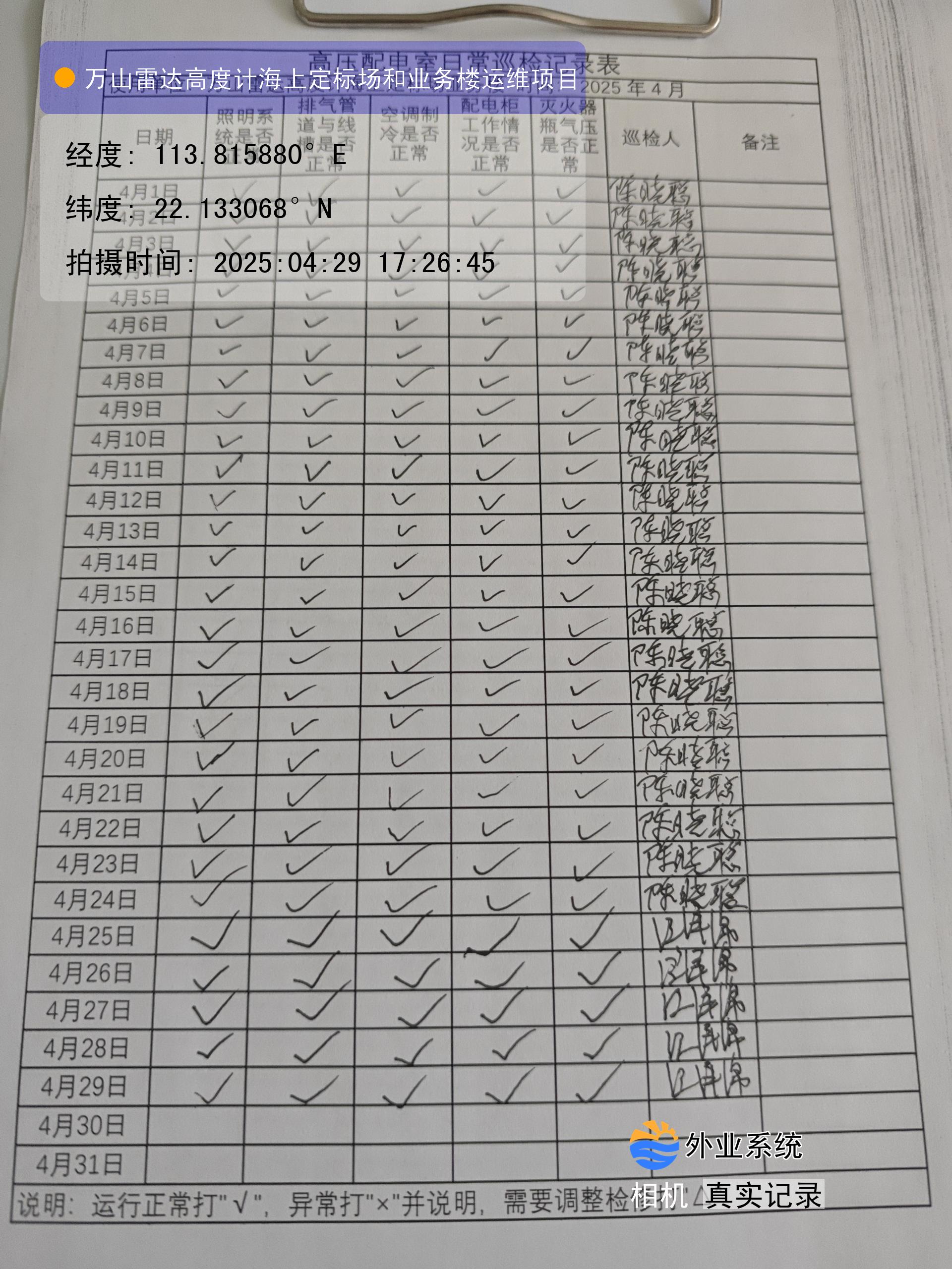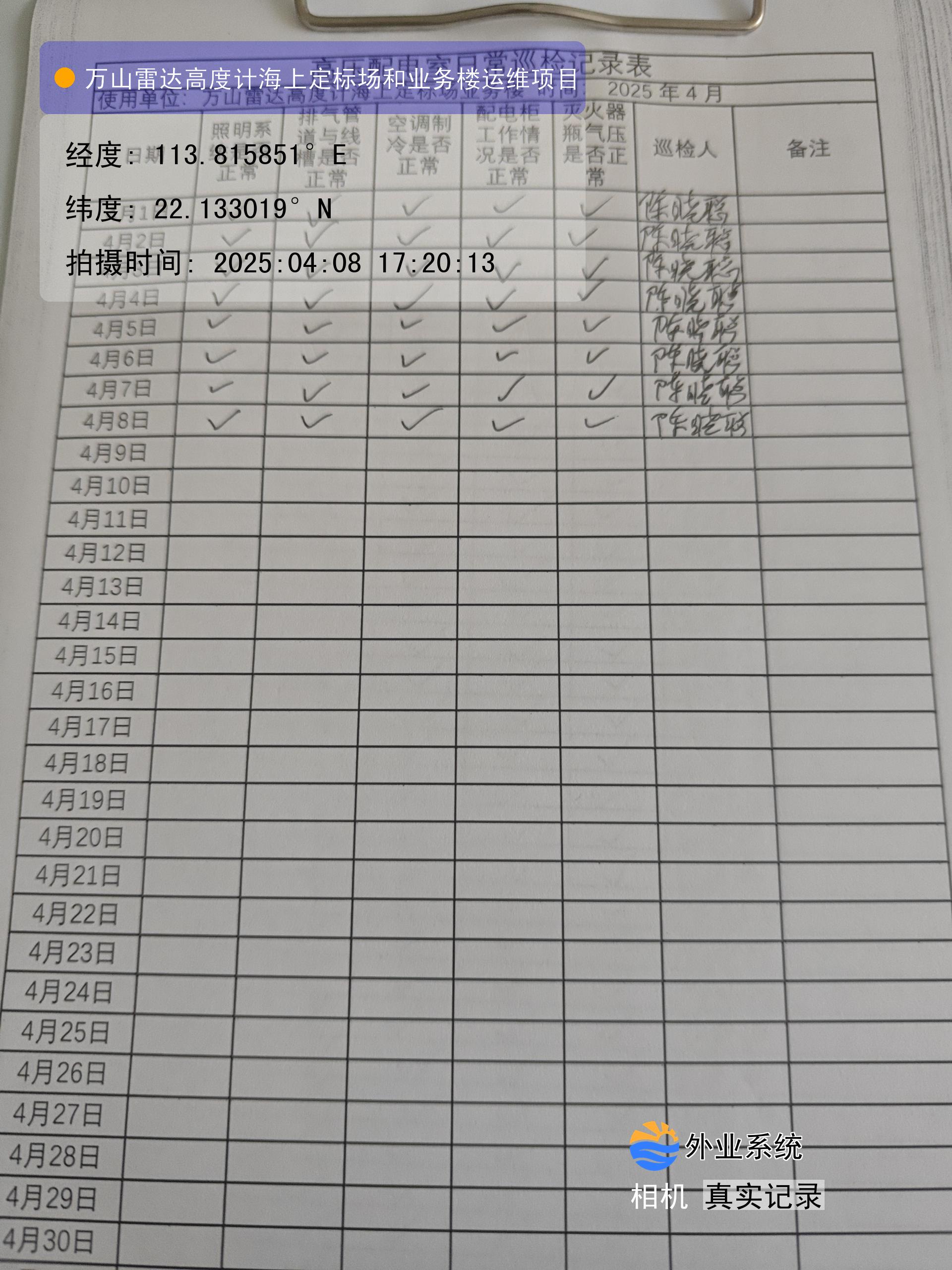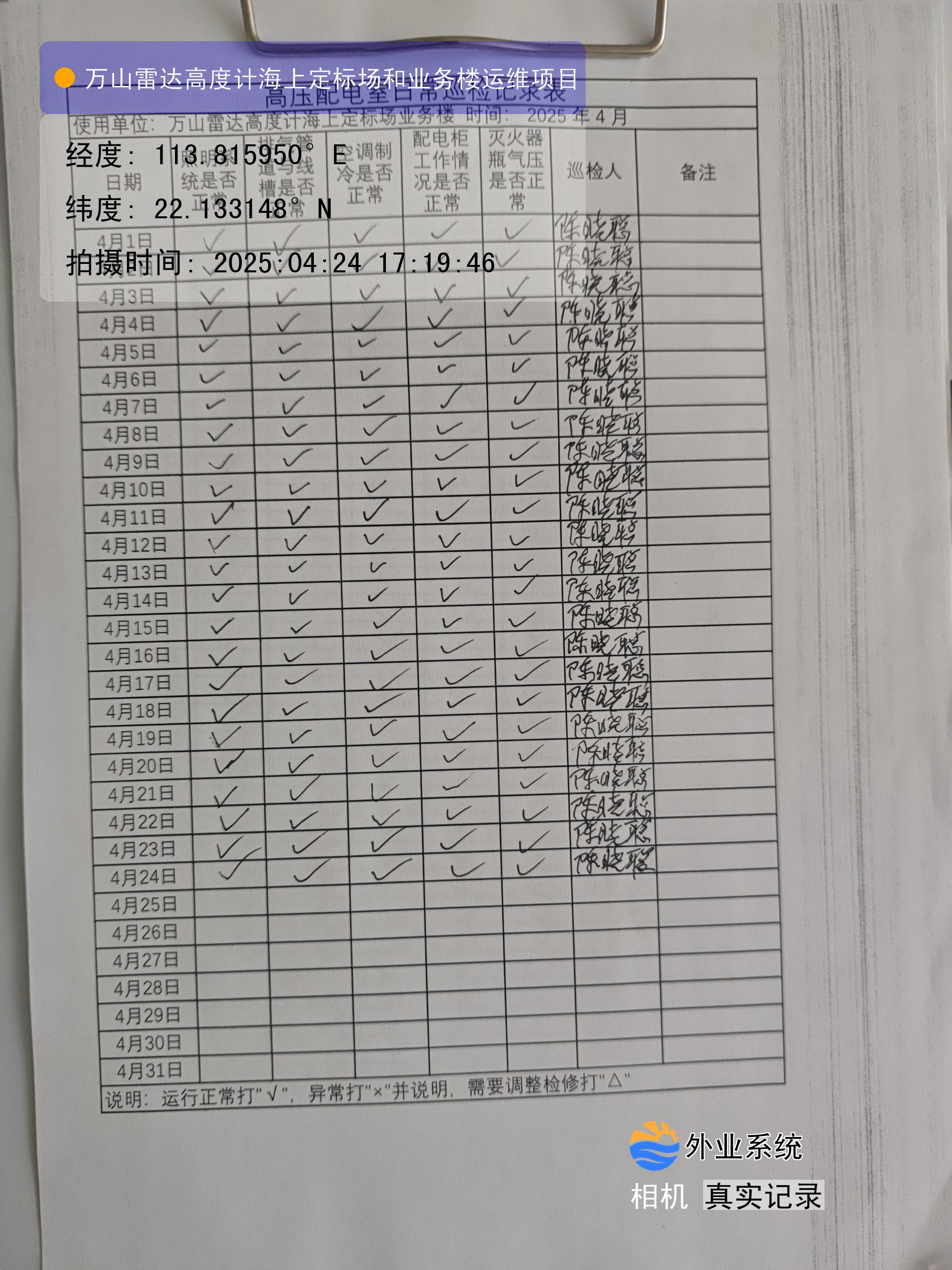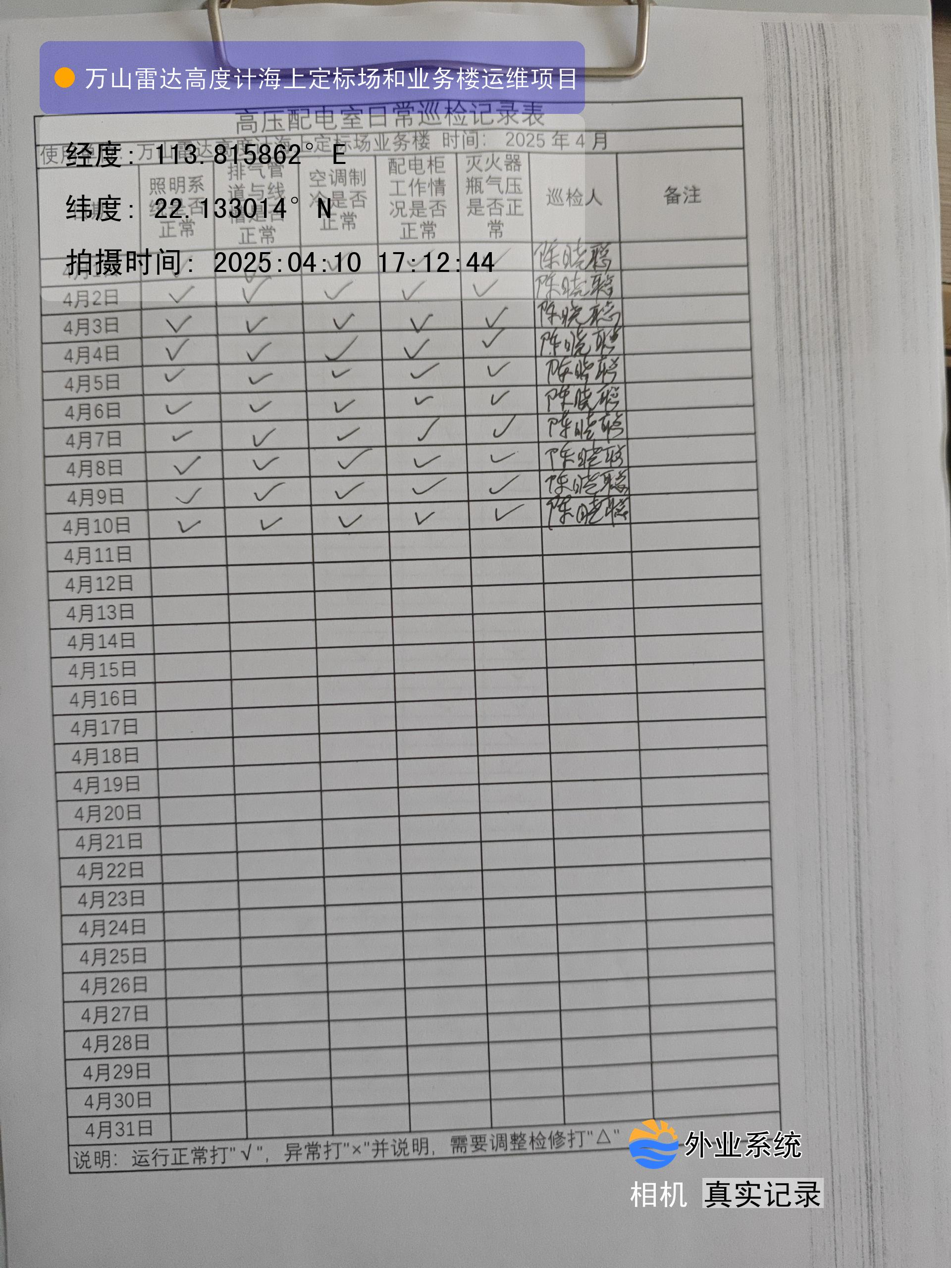 | 记录表-高压配电室日常巡检 | 原图 | 水印1 | 水印2 | 陈晓聪 | 工作照 | 2025-04-07 17:00:00 |