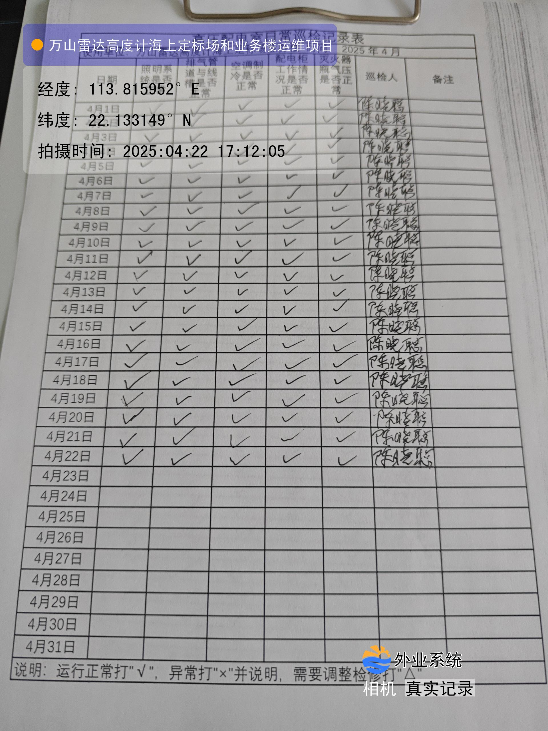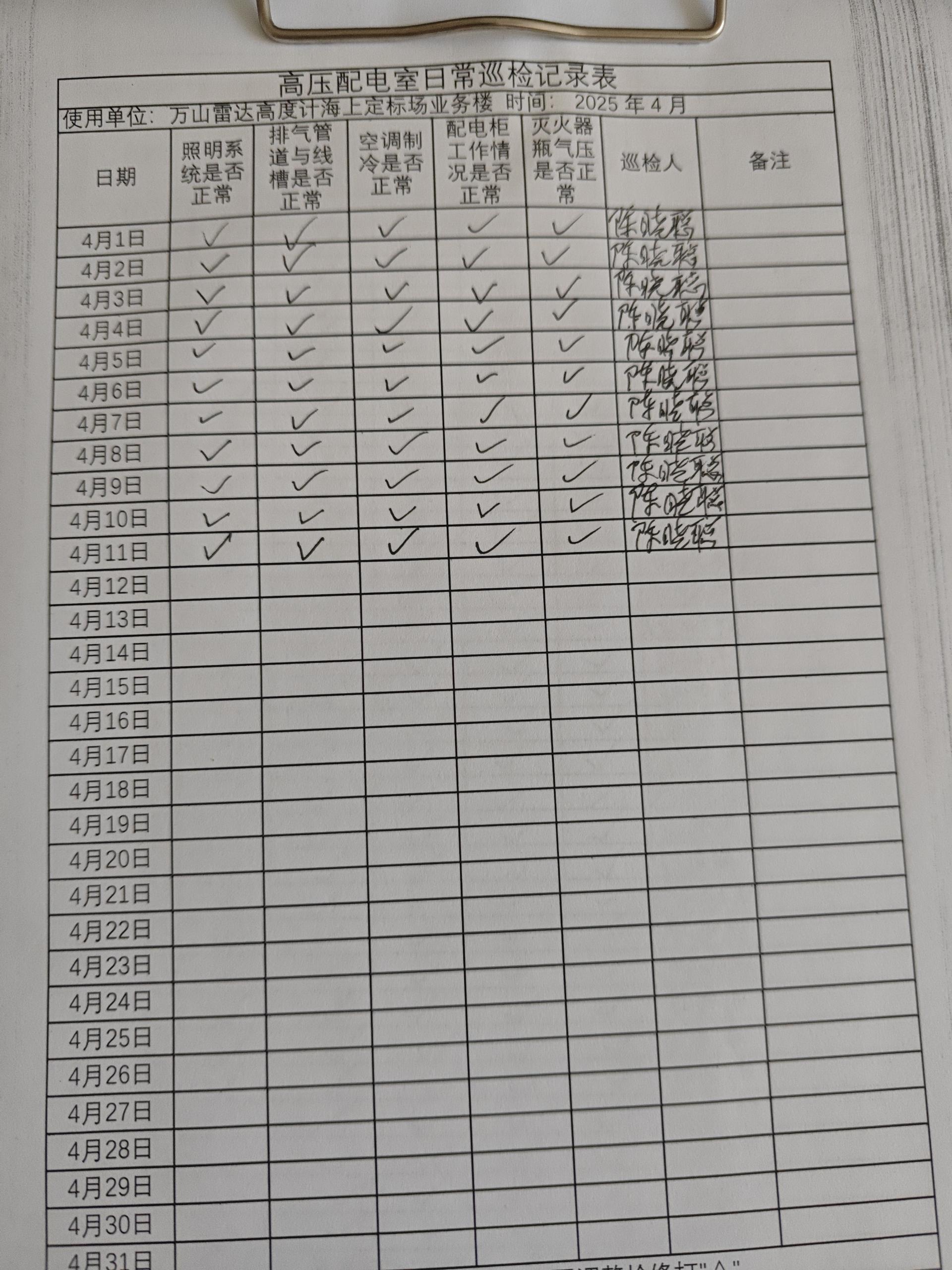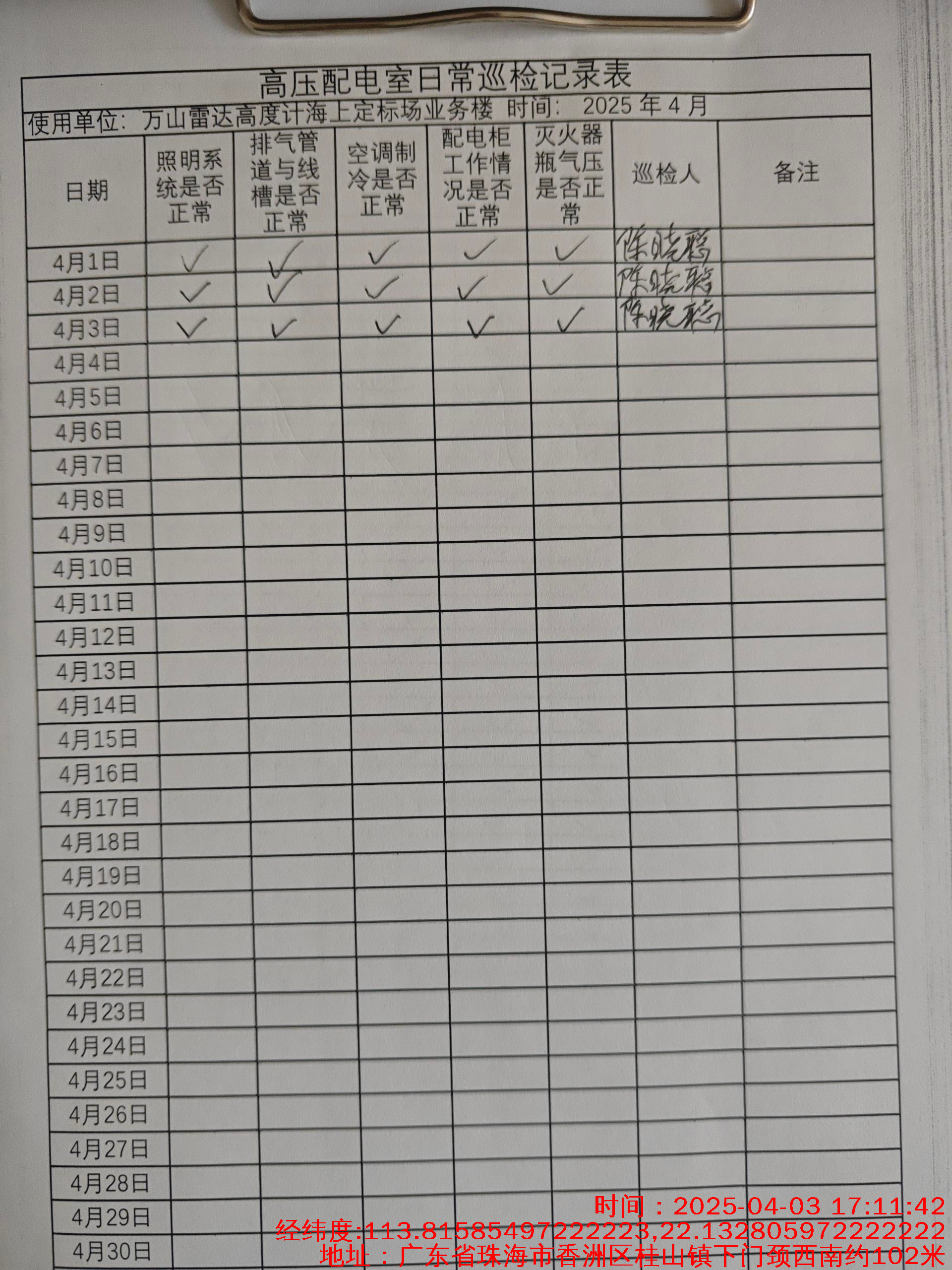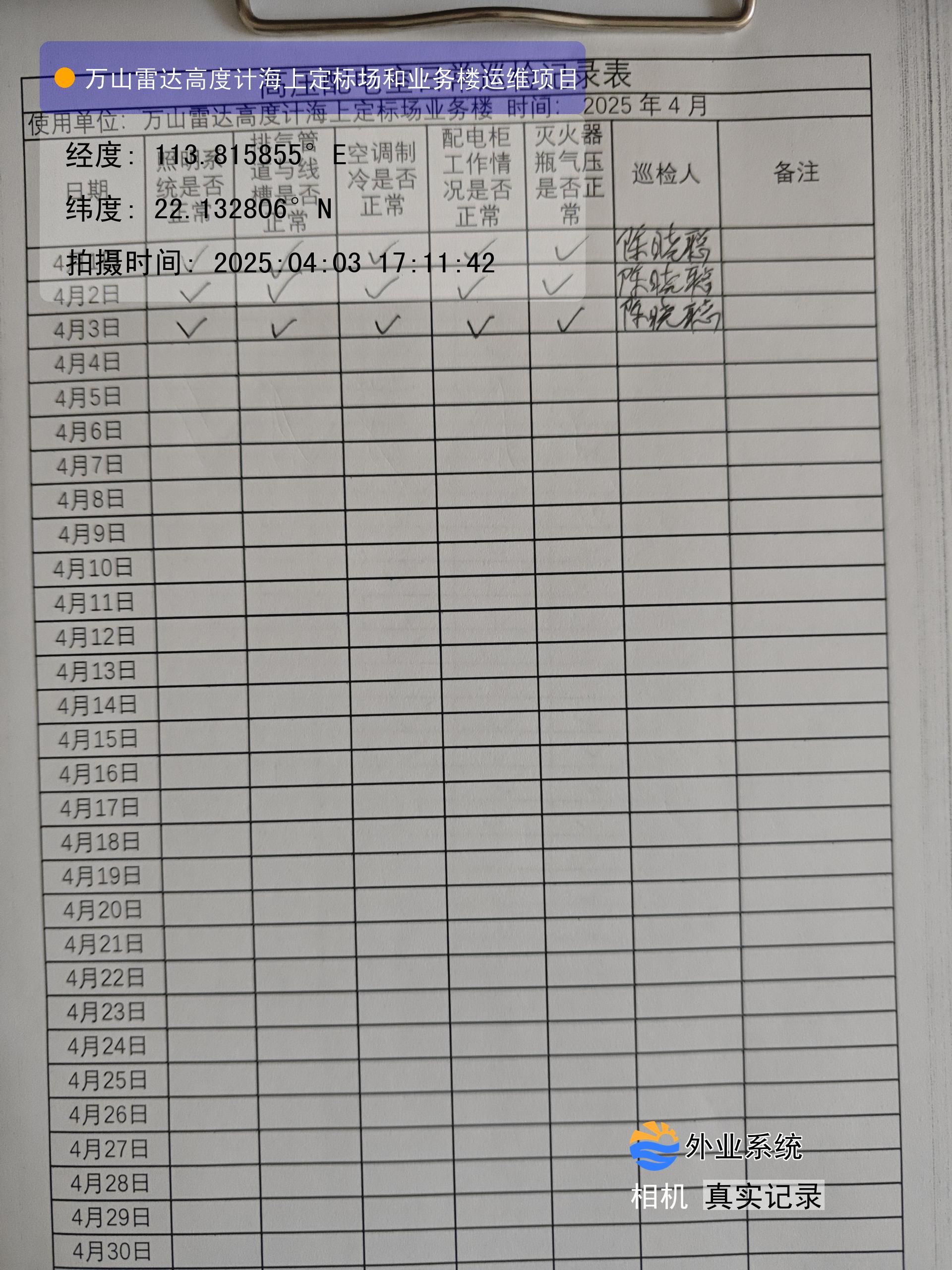| 记录表-高压配电室日常巡检 | 原图 | 水印1 | 水印2 | 陈晓聪 | 工作照 | 2025-04-07 17:00:00 |