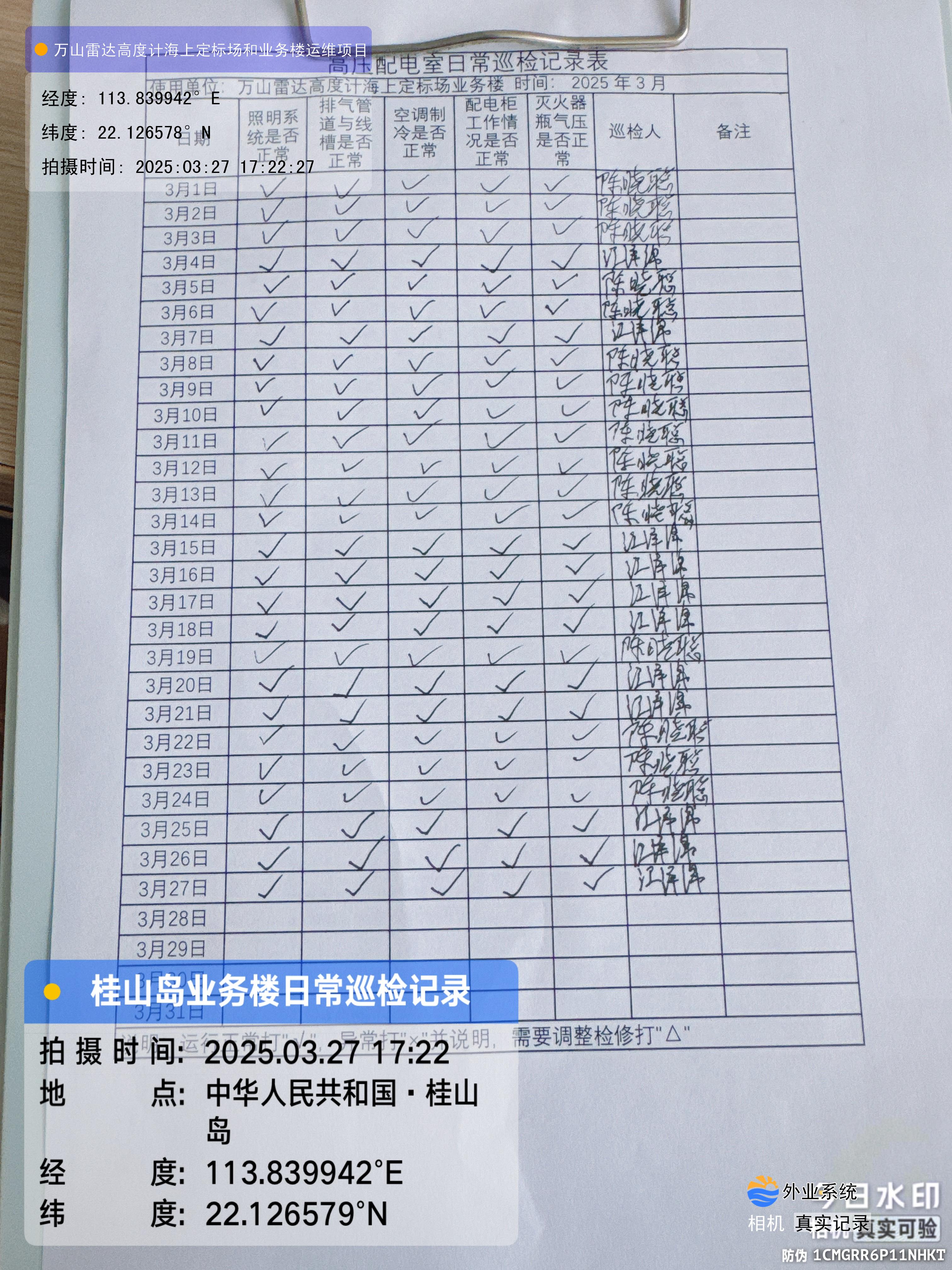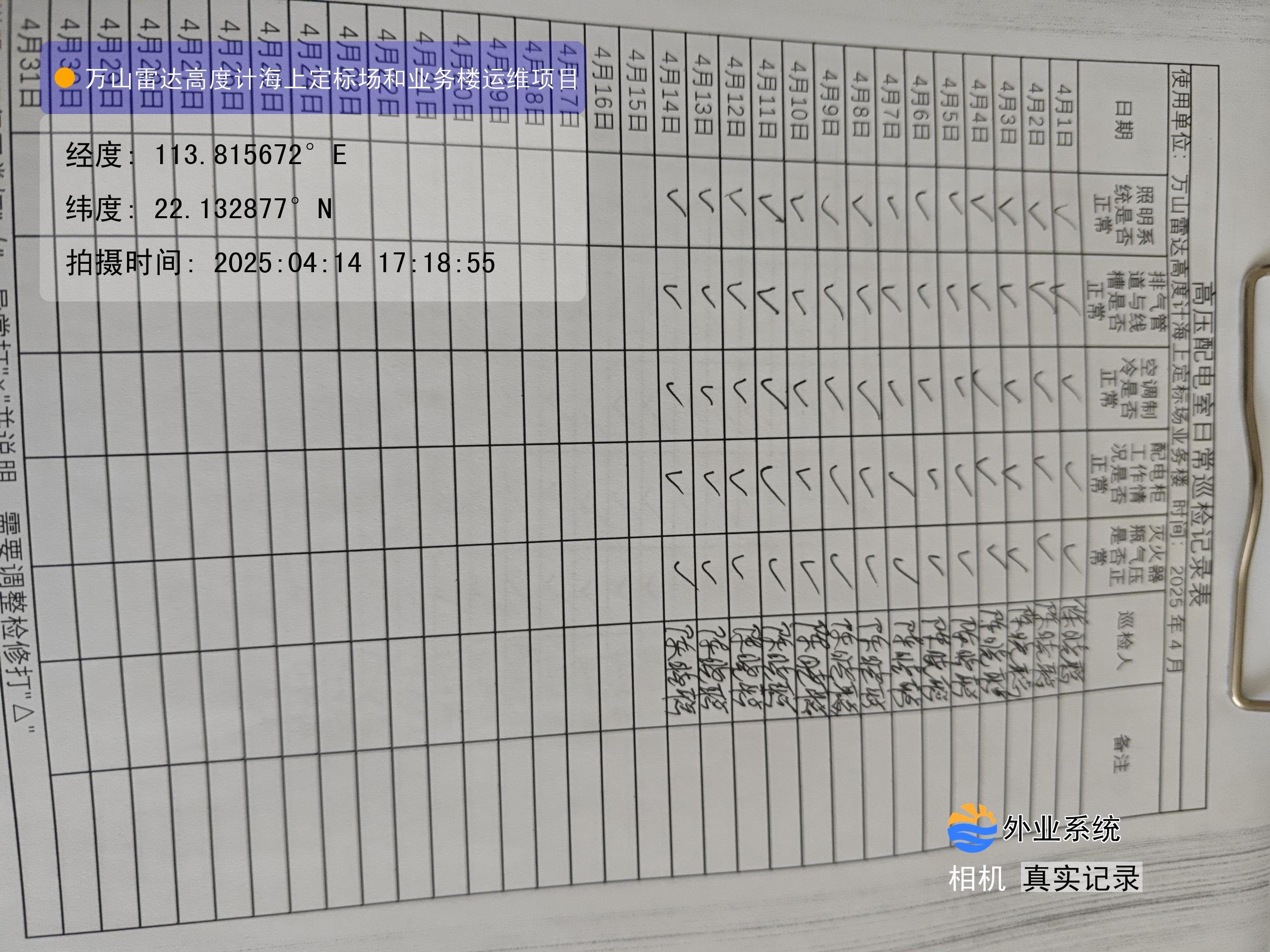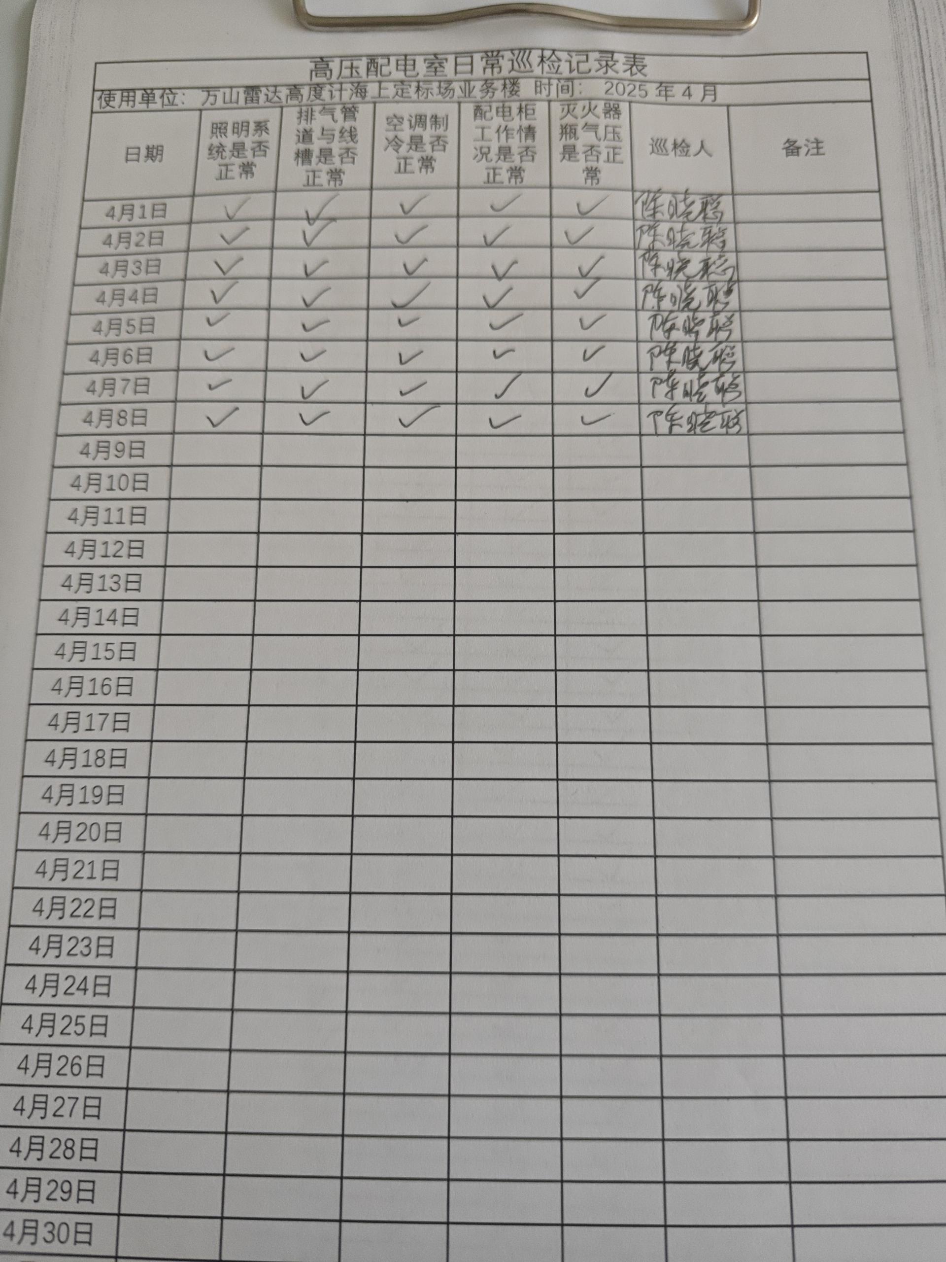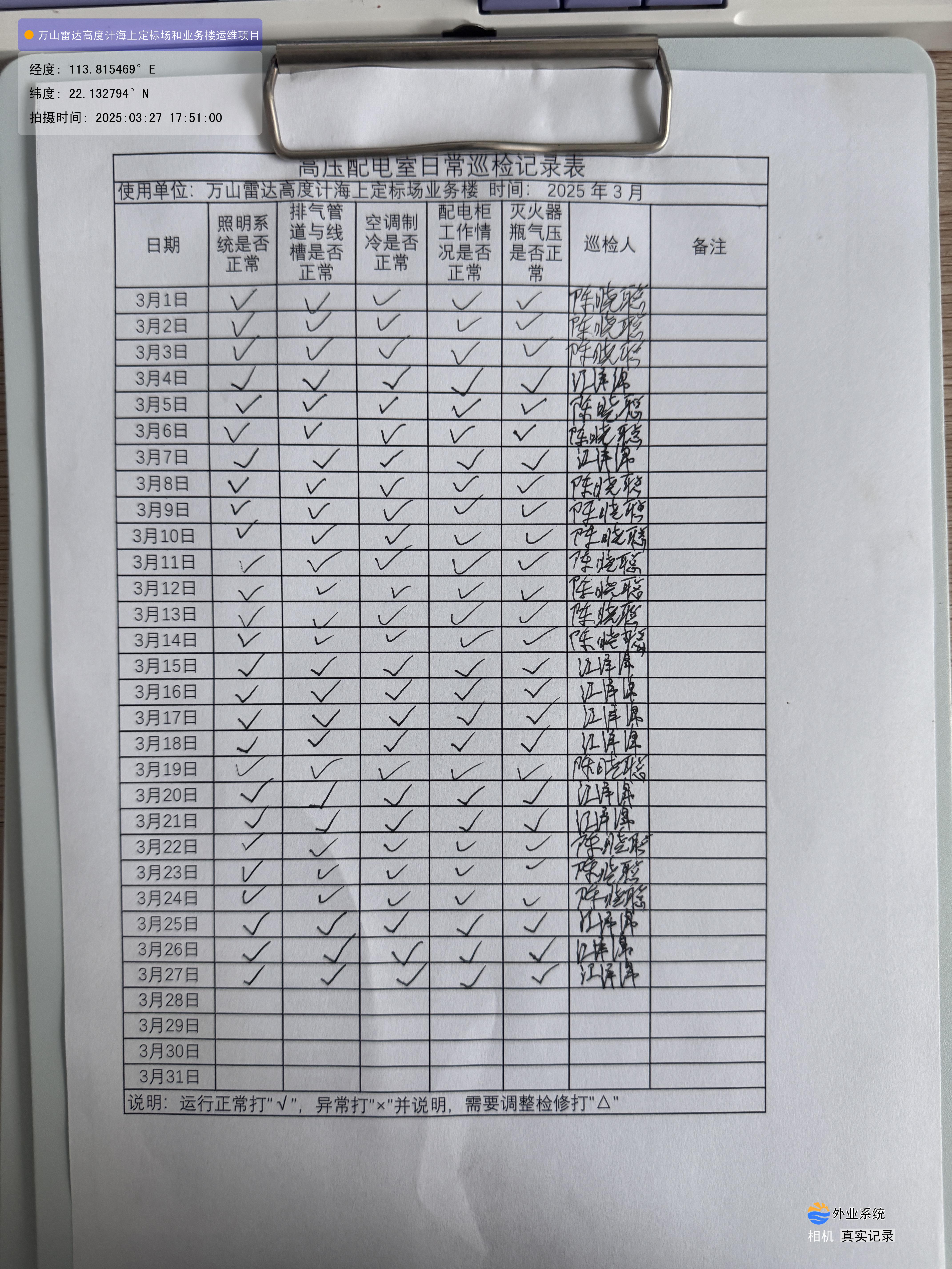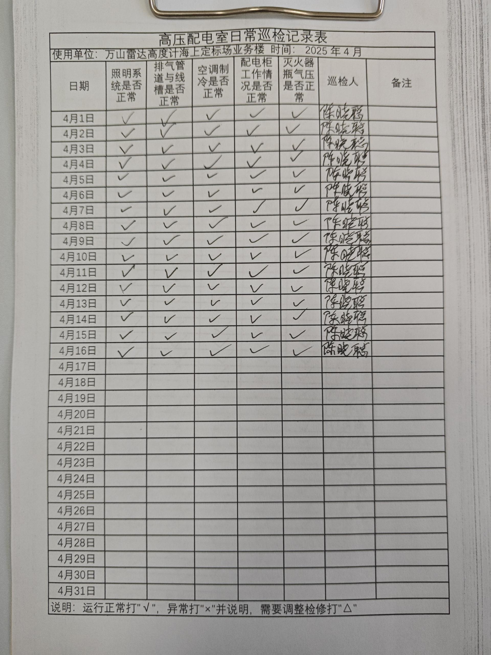 | 记录表-高压配电室日常巡检 | 原图 | 水印1 | 水印2 | 陈晓聪 | 工作照 | 2025-04-07 17:00:00 |