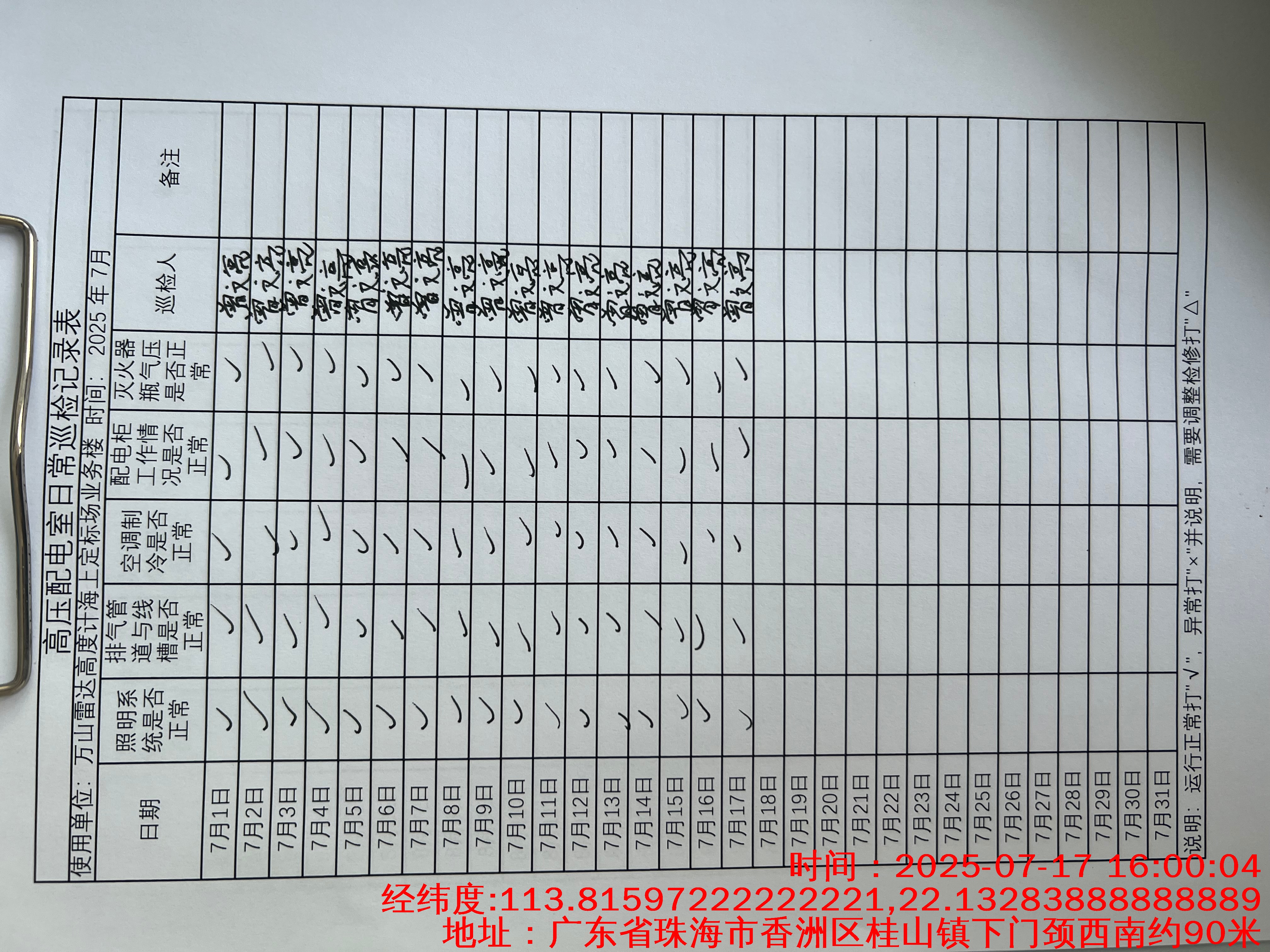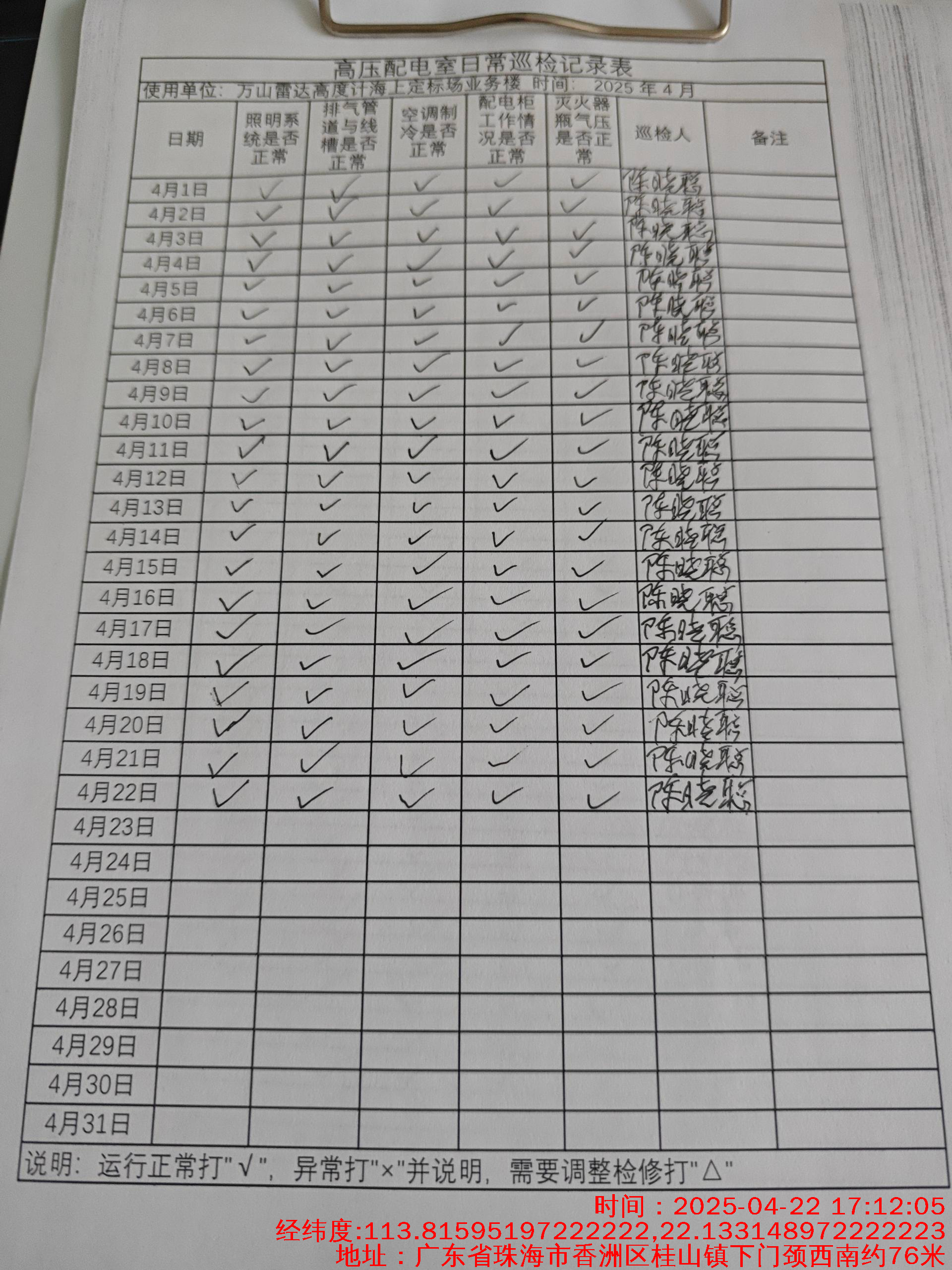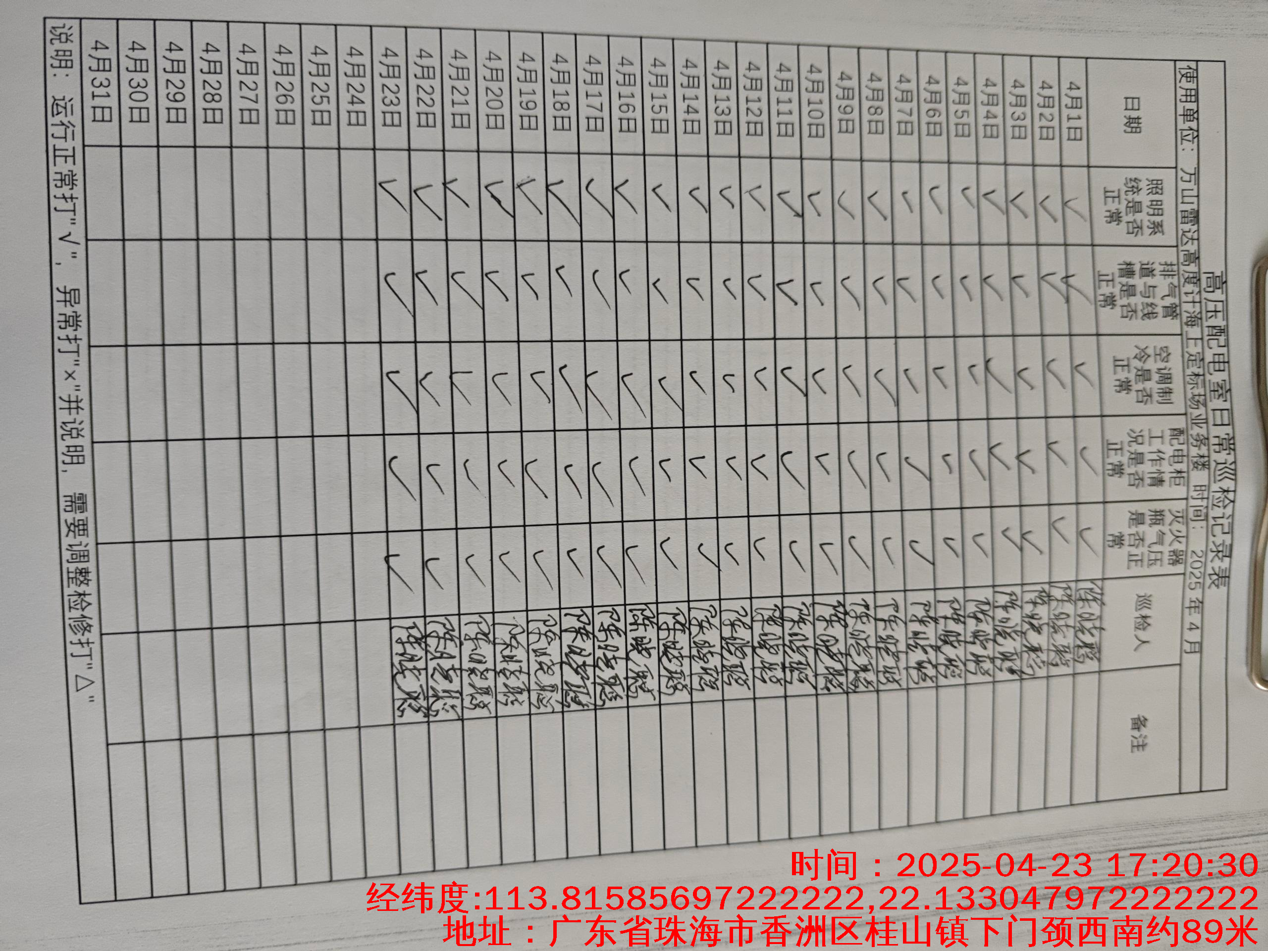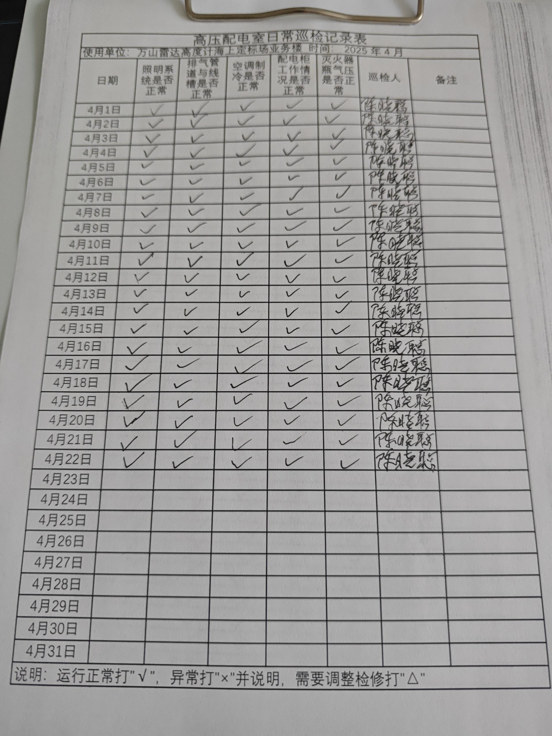 | 记录表-高压配电室日常巡检 | 原图 | 水印1 | 水印2 | 陈晓聪 | 工作照 | 2025-04-07 17:00:00 |