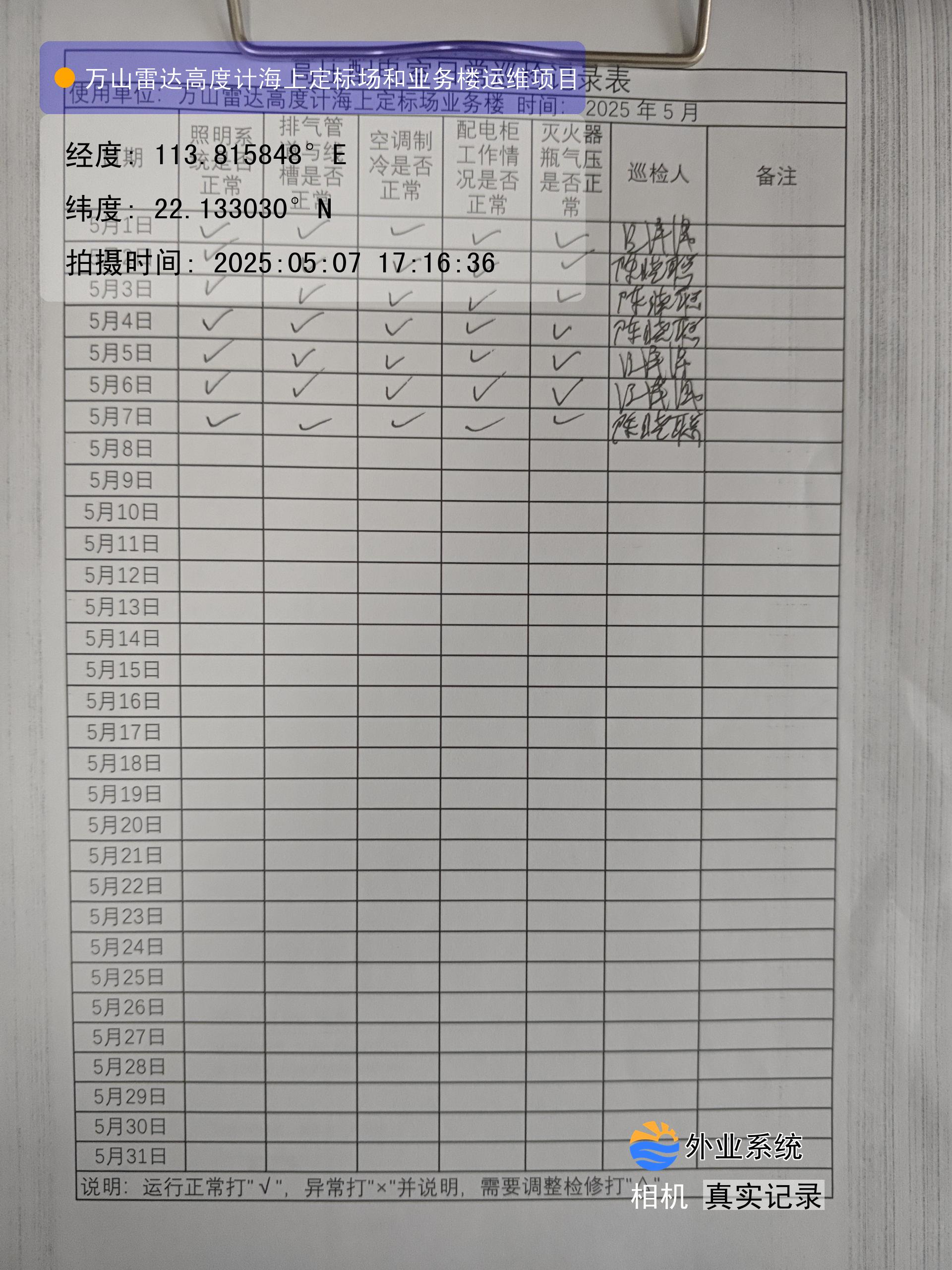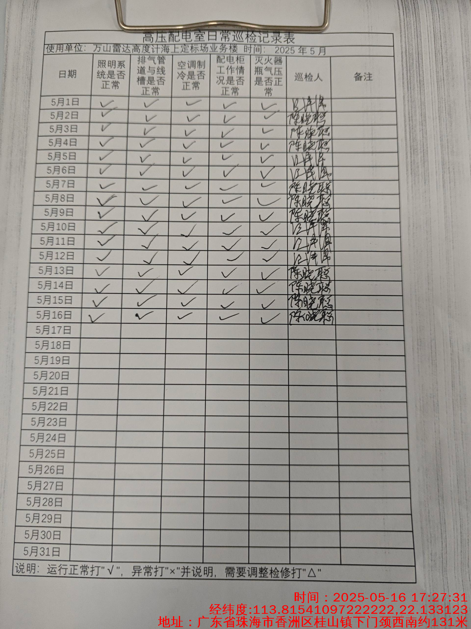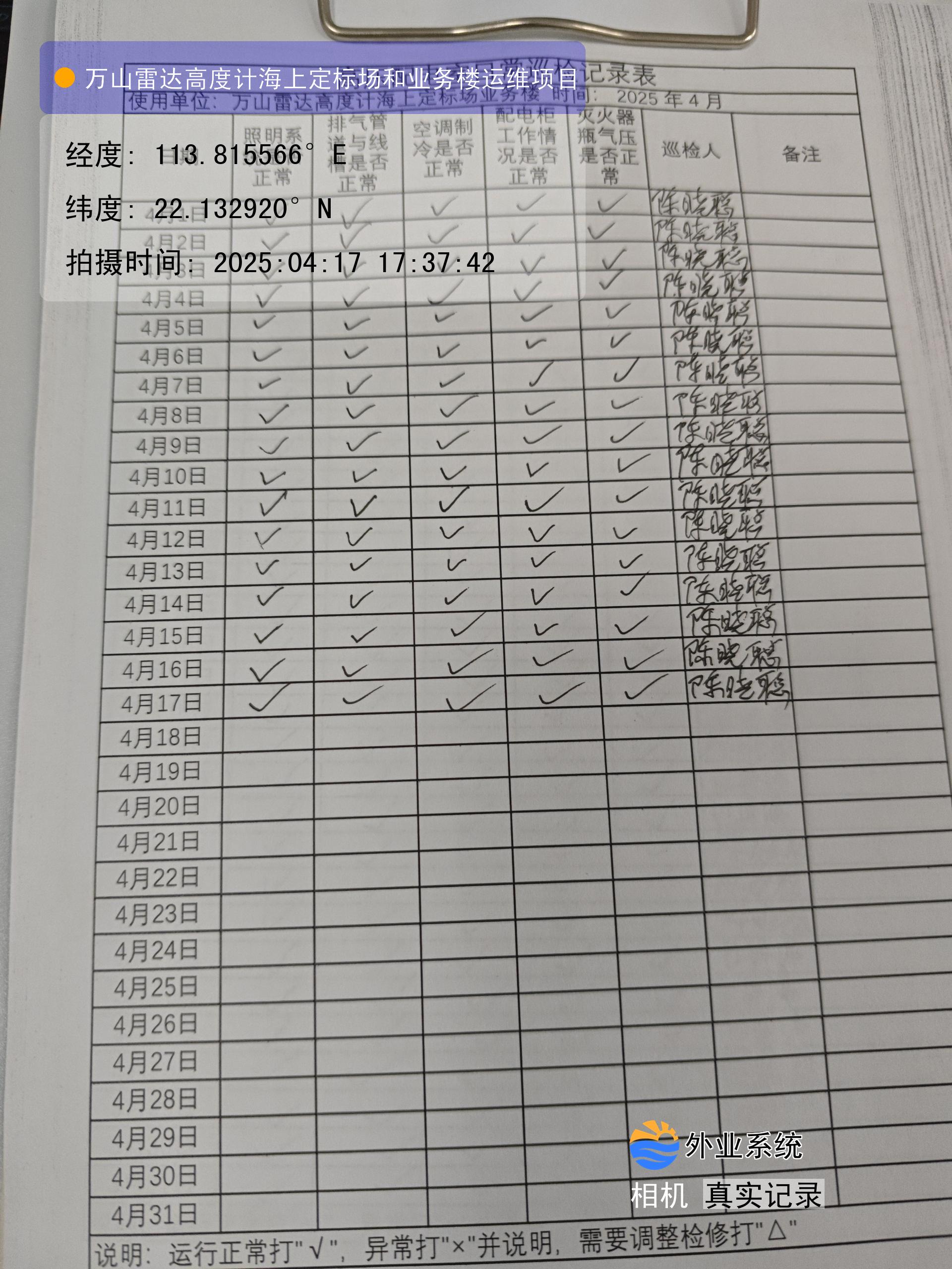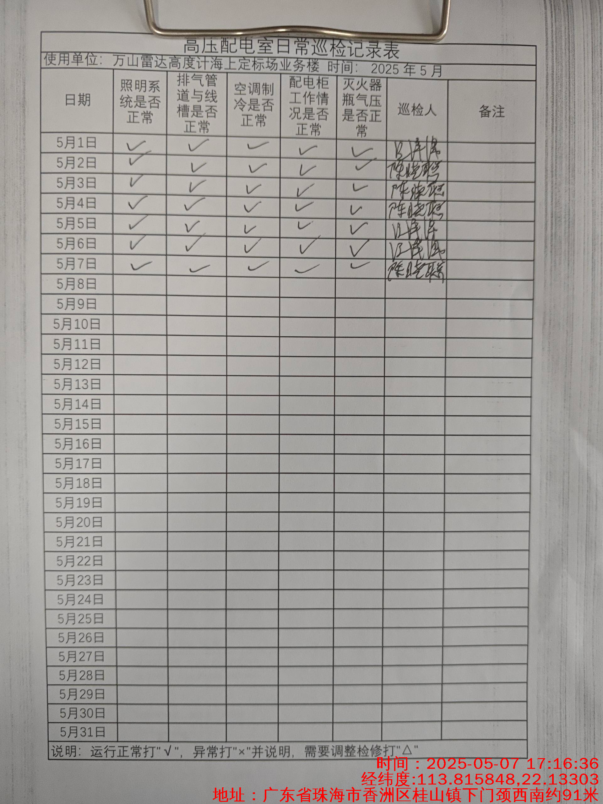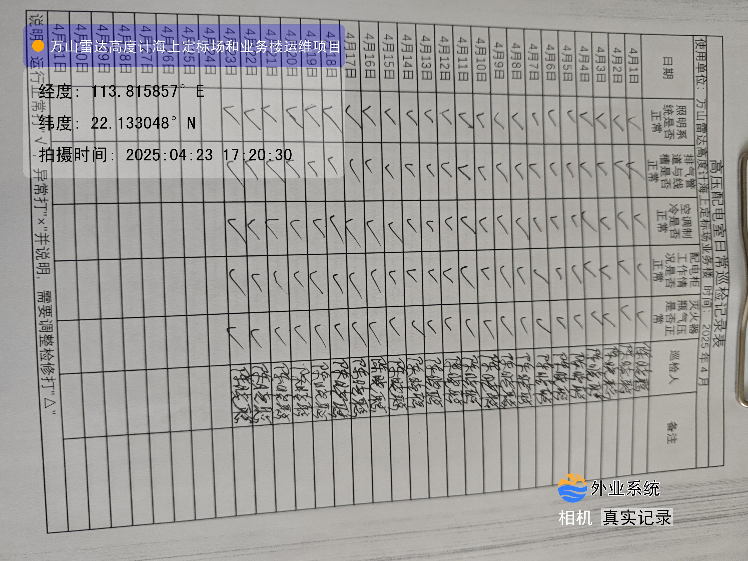 | 记录表-高压配电室日常巡检 | 原图 | 水印1 | 水印2 | 陈晓聪 | 工作照 | 2025-04-07 17:00:00 |