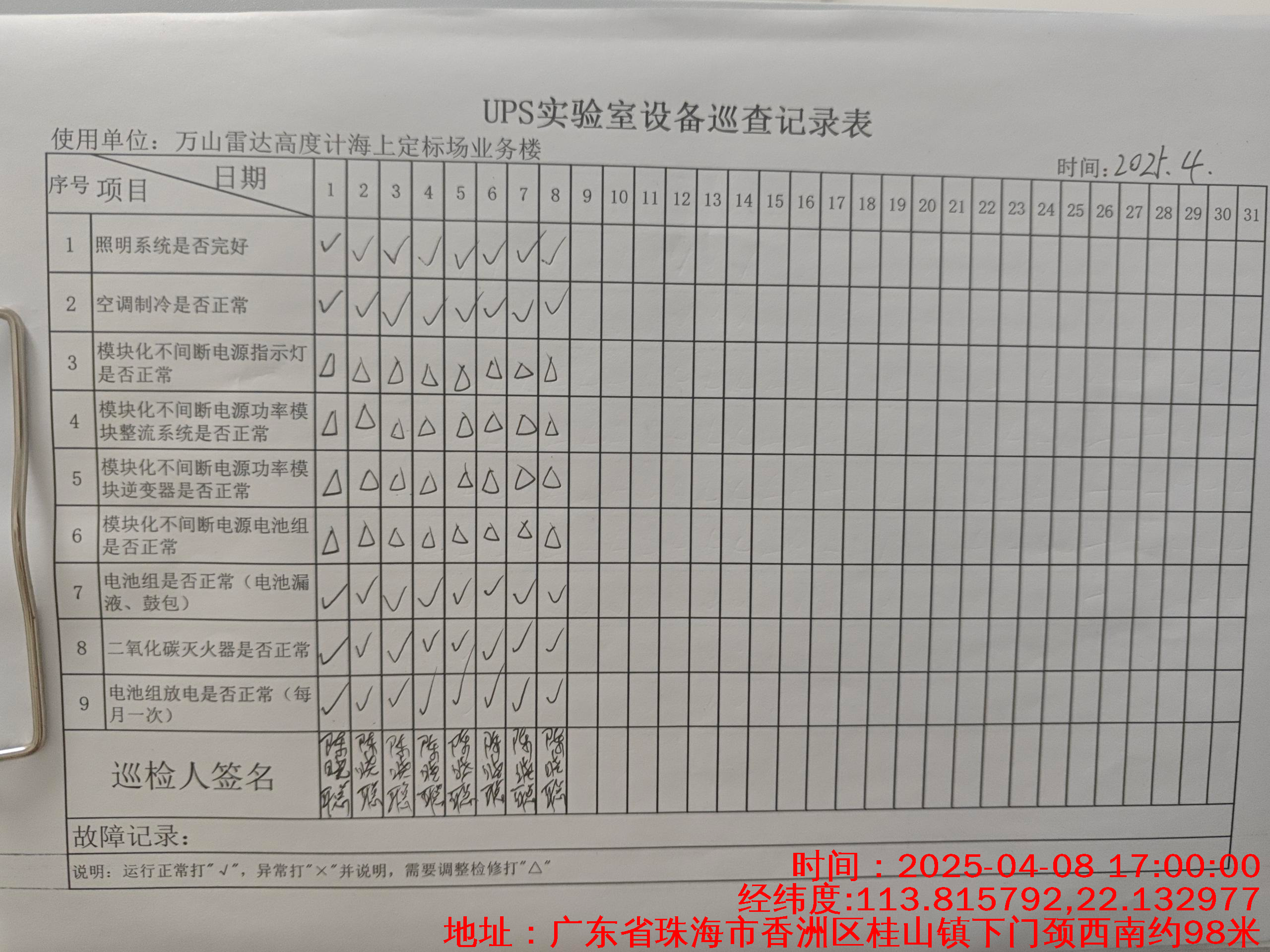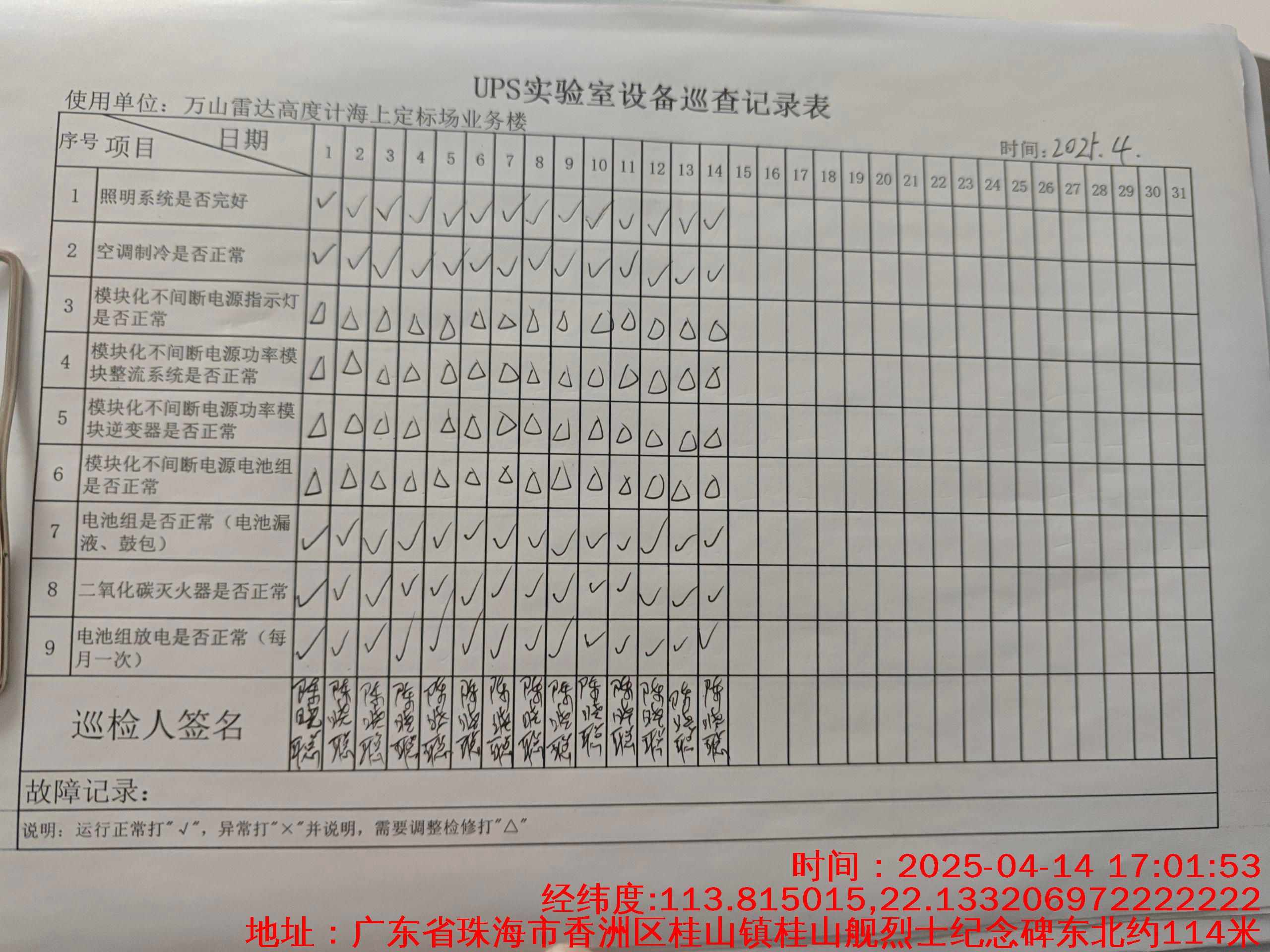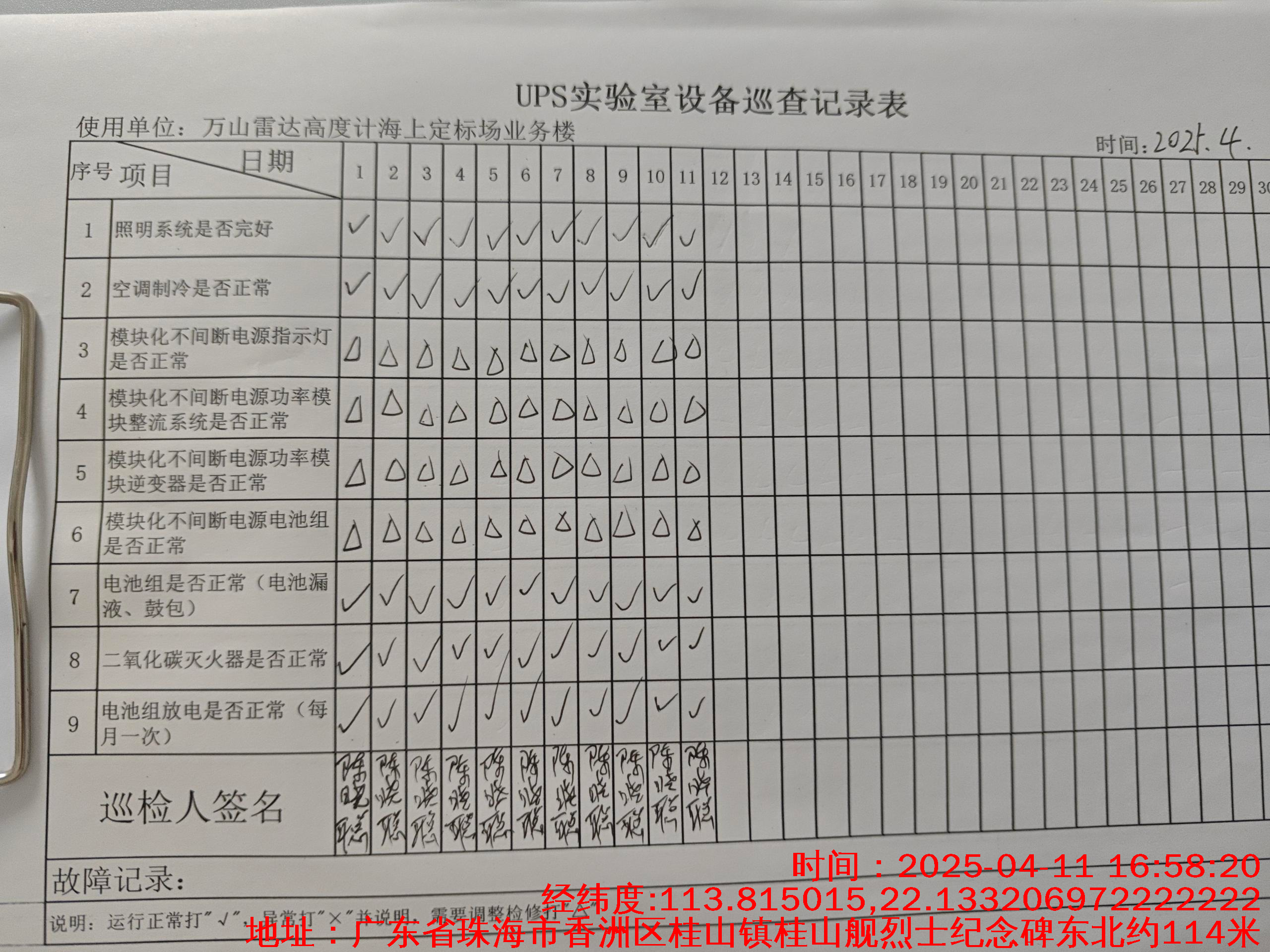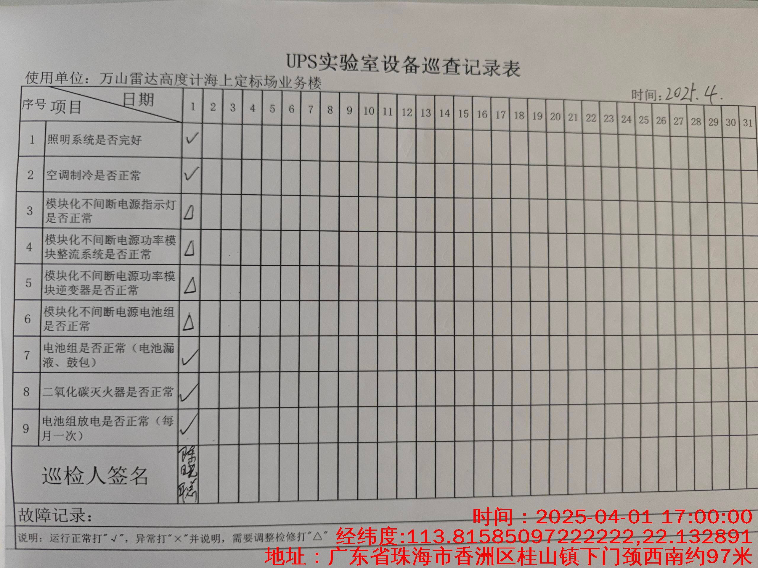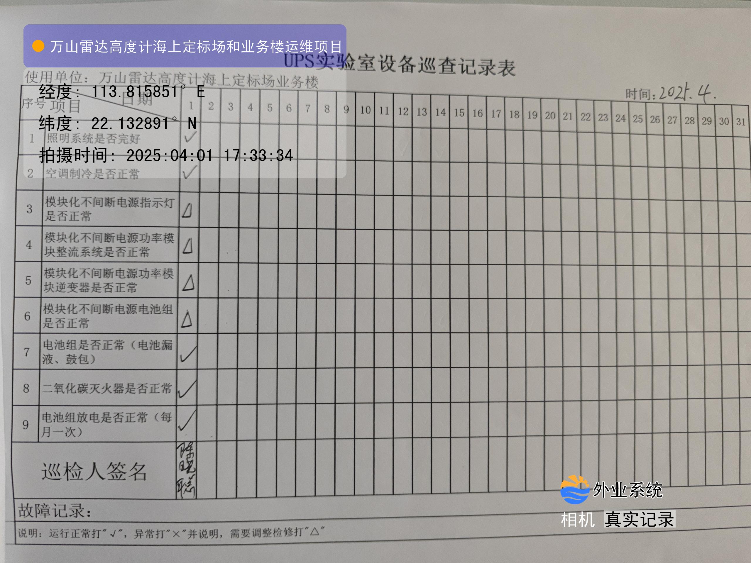 | 记录表-UPS实验室设备巡查 | 原图 | 水印1 | 水印2 | 陈晓聪 | 工作照 | 2025-04-01 17:00:00 |