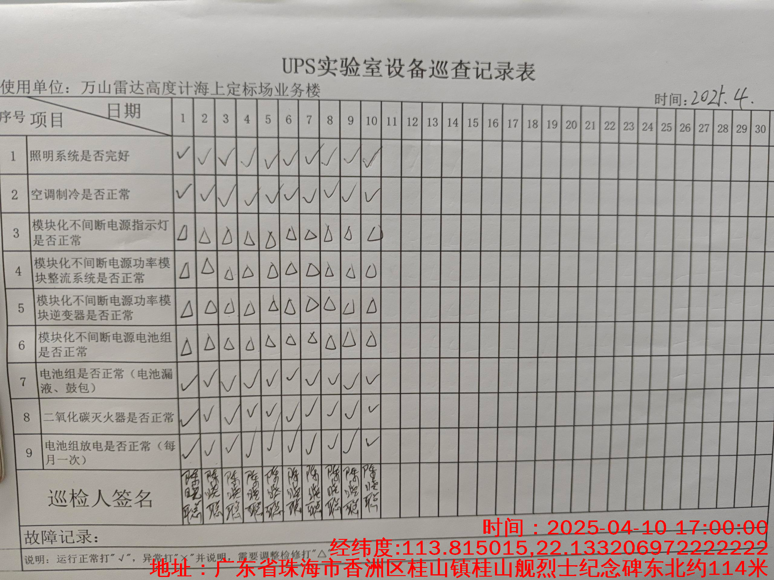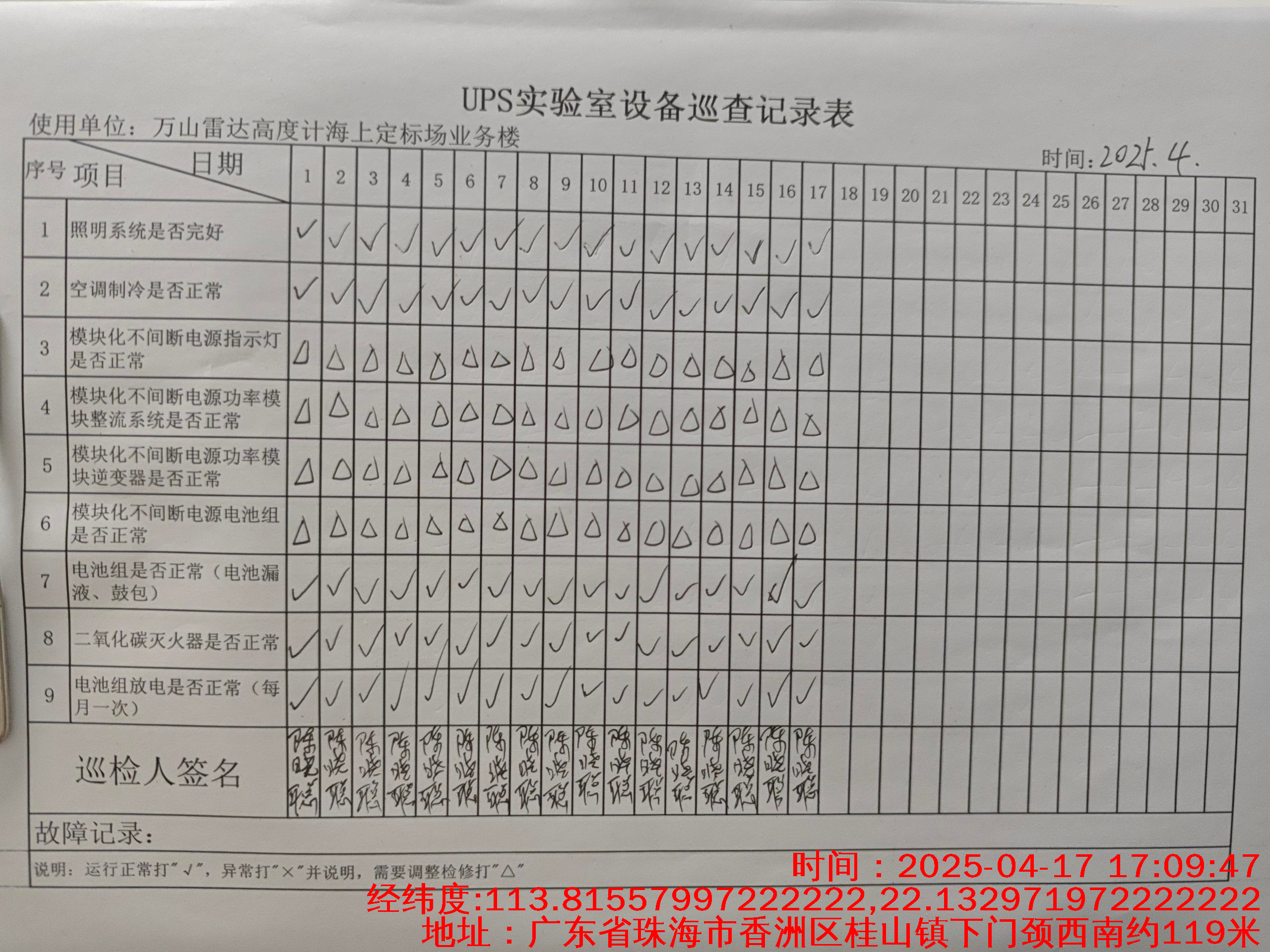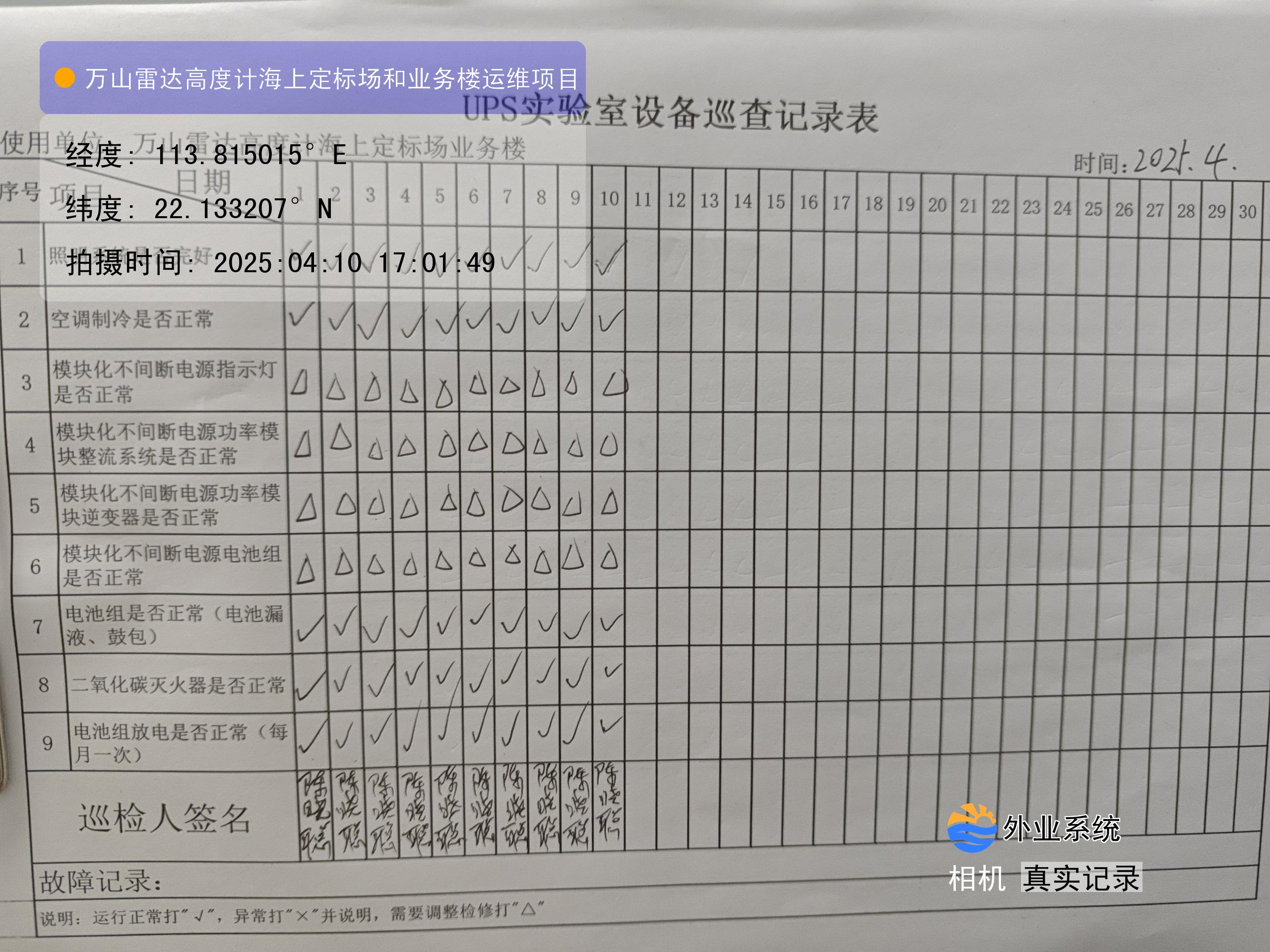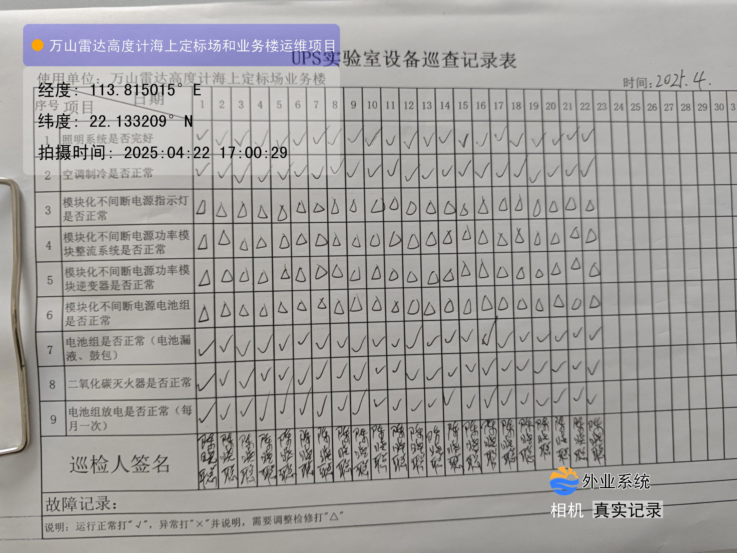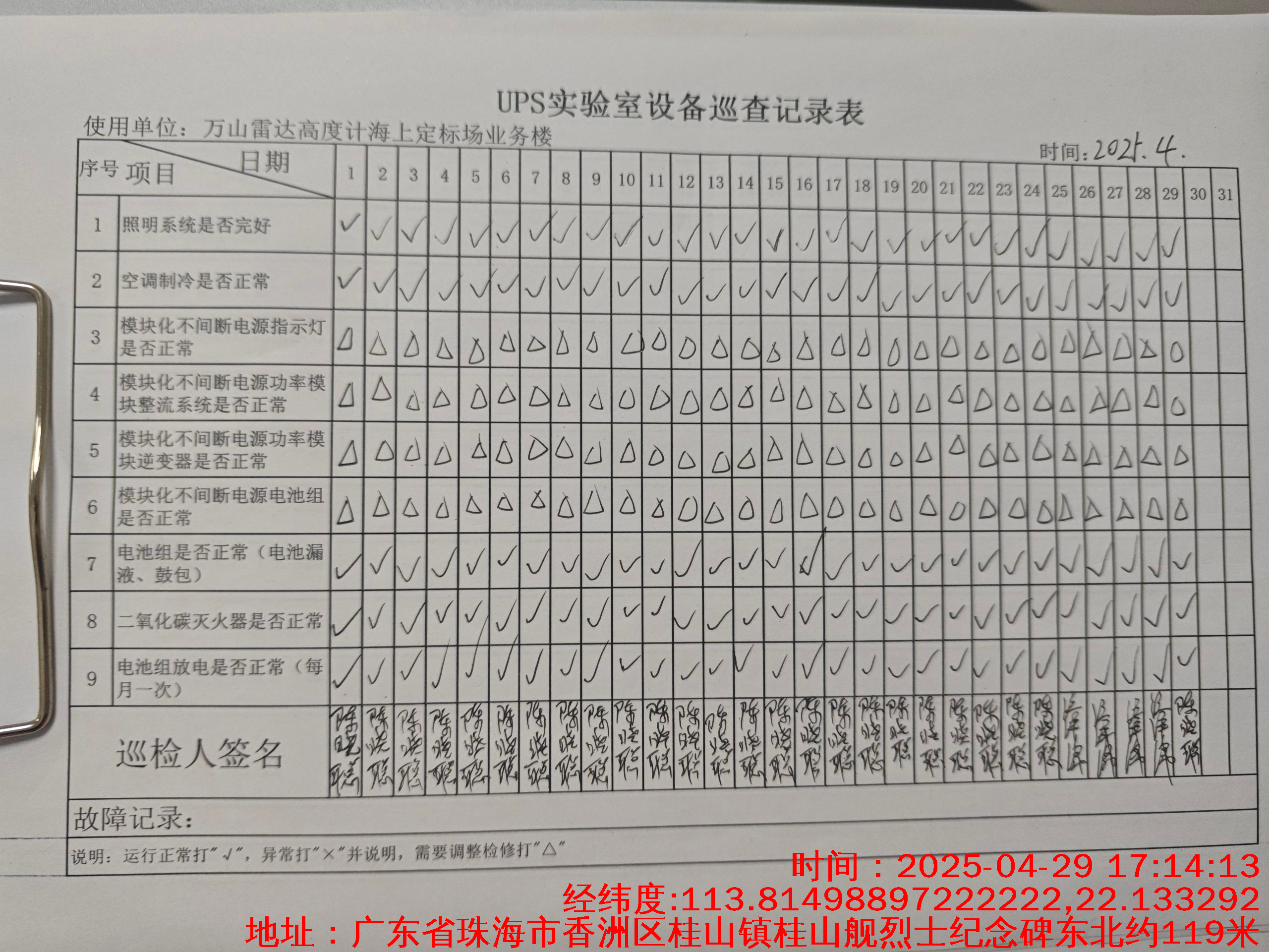 | 记录表-UPS实验室设备巡查 | 原图 | 水印1 | 水印2 | 陈晓聪 | 工作照 | 2025-04-01 17:00:00 |