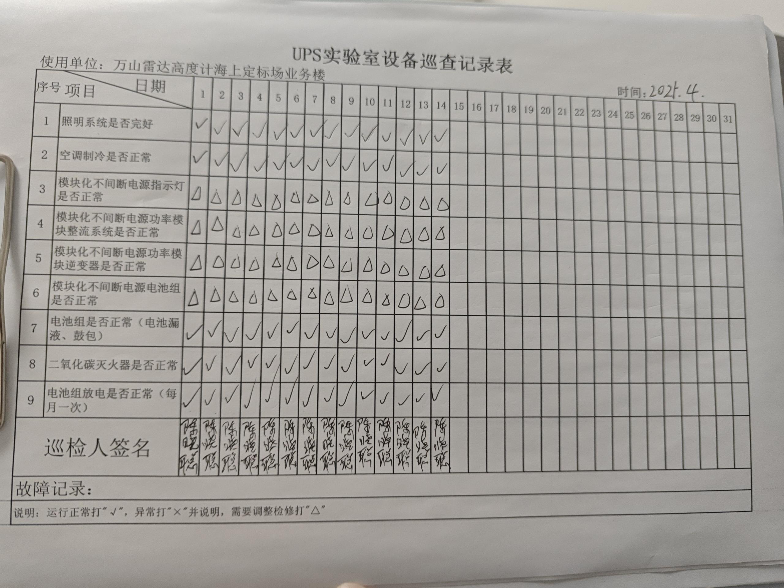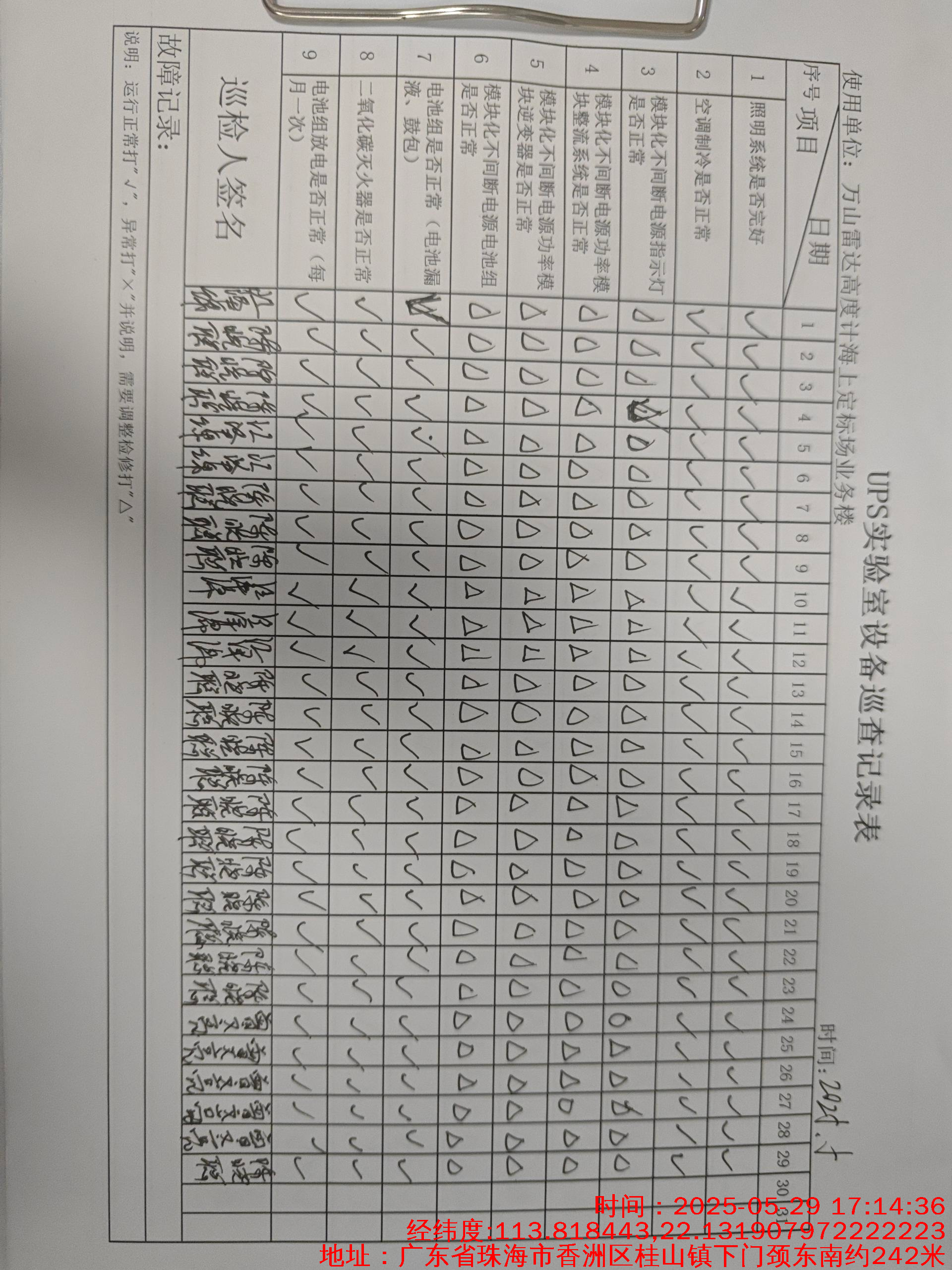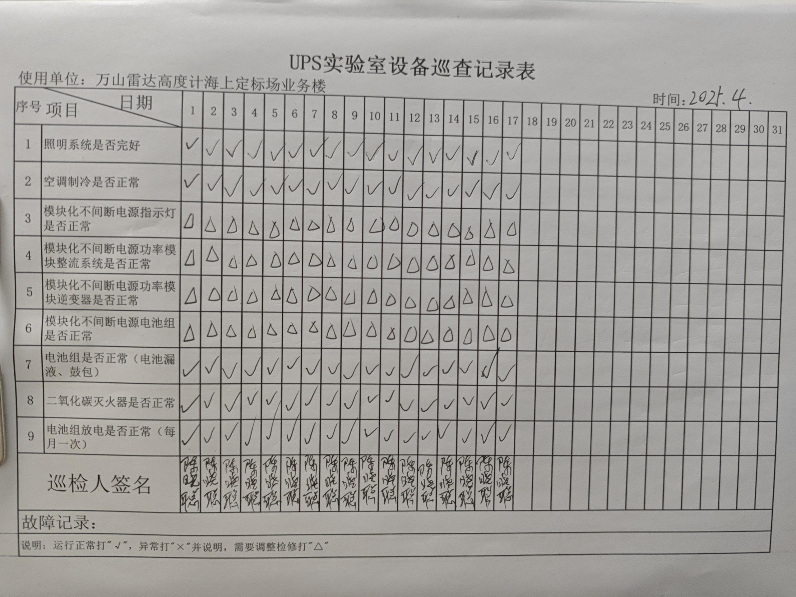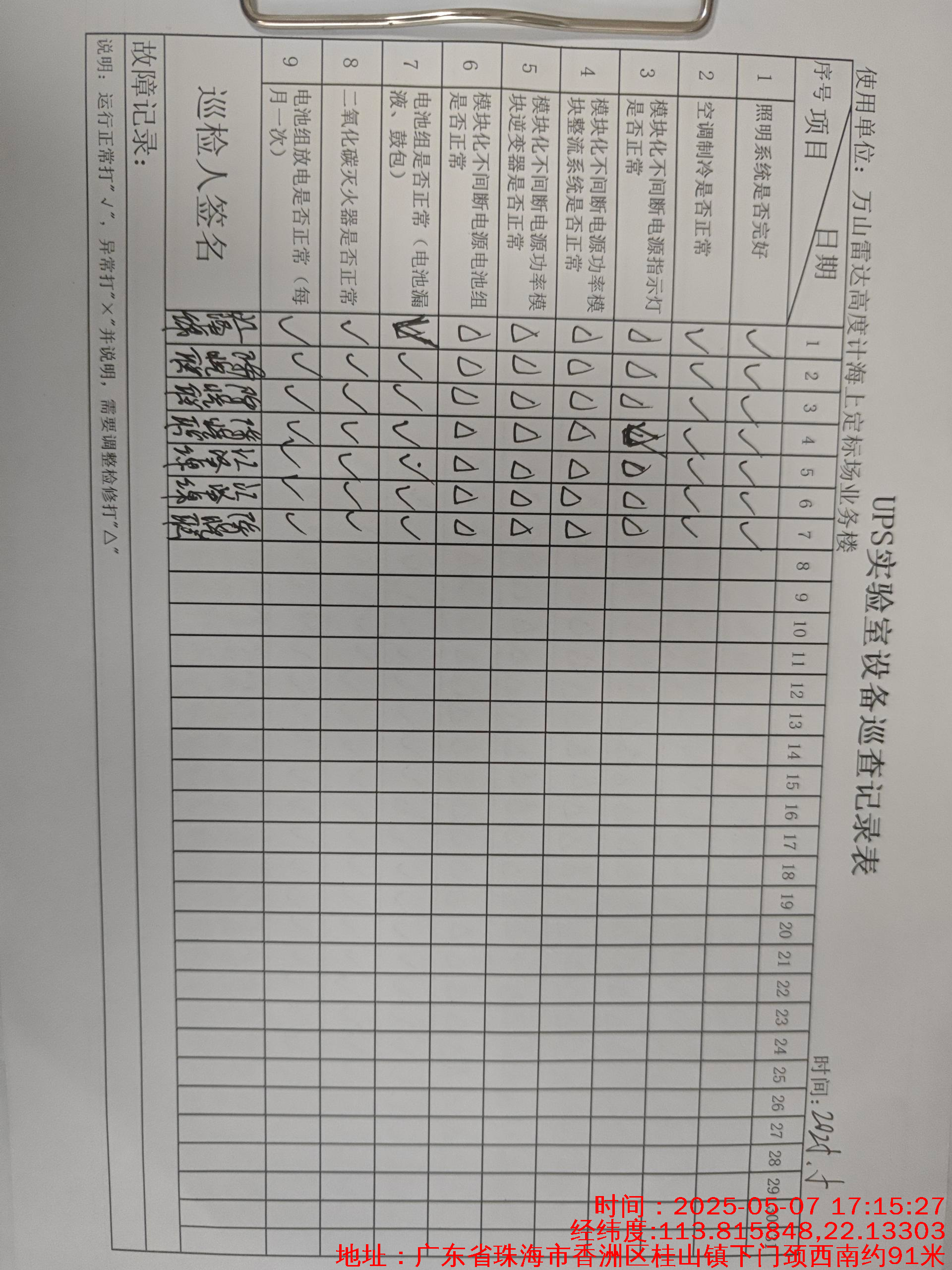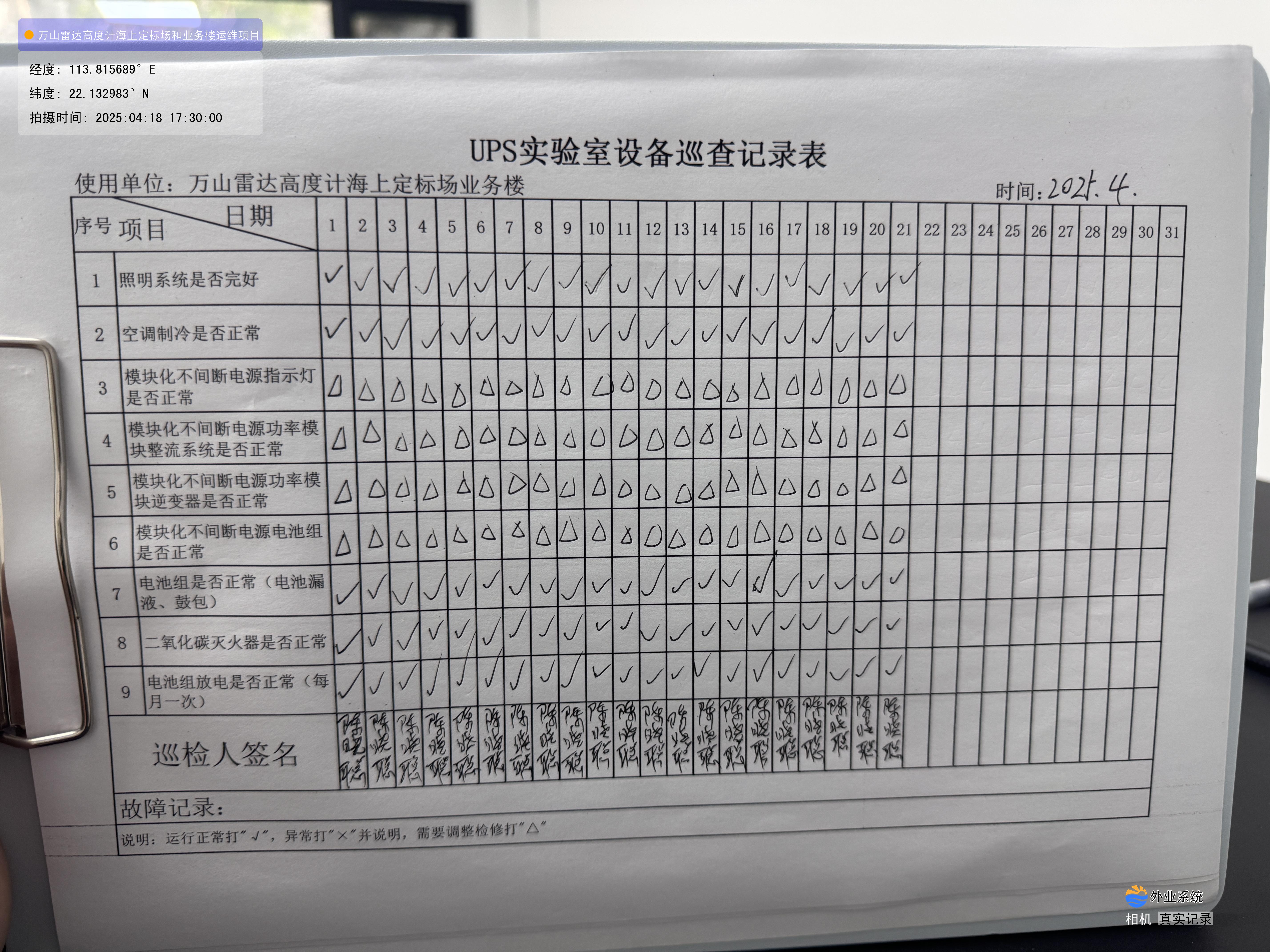| 记录表-UPS实验室设备巡查 | 原图 | 水印1 | 水印2 | 陈晓聪 | 工作照 | 2025-04-01 17:00:00 |