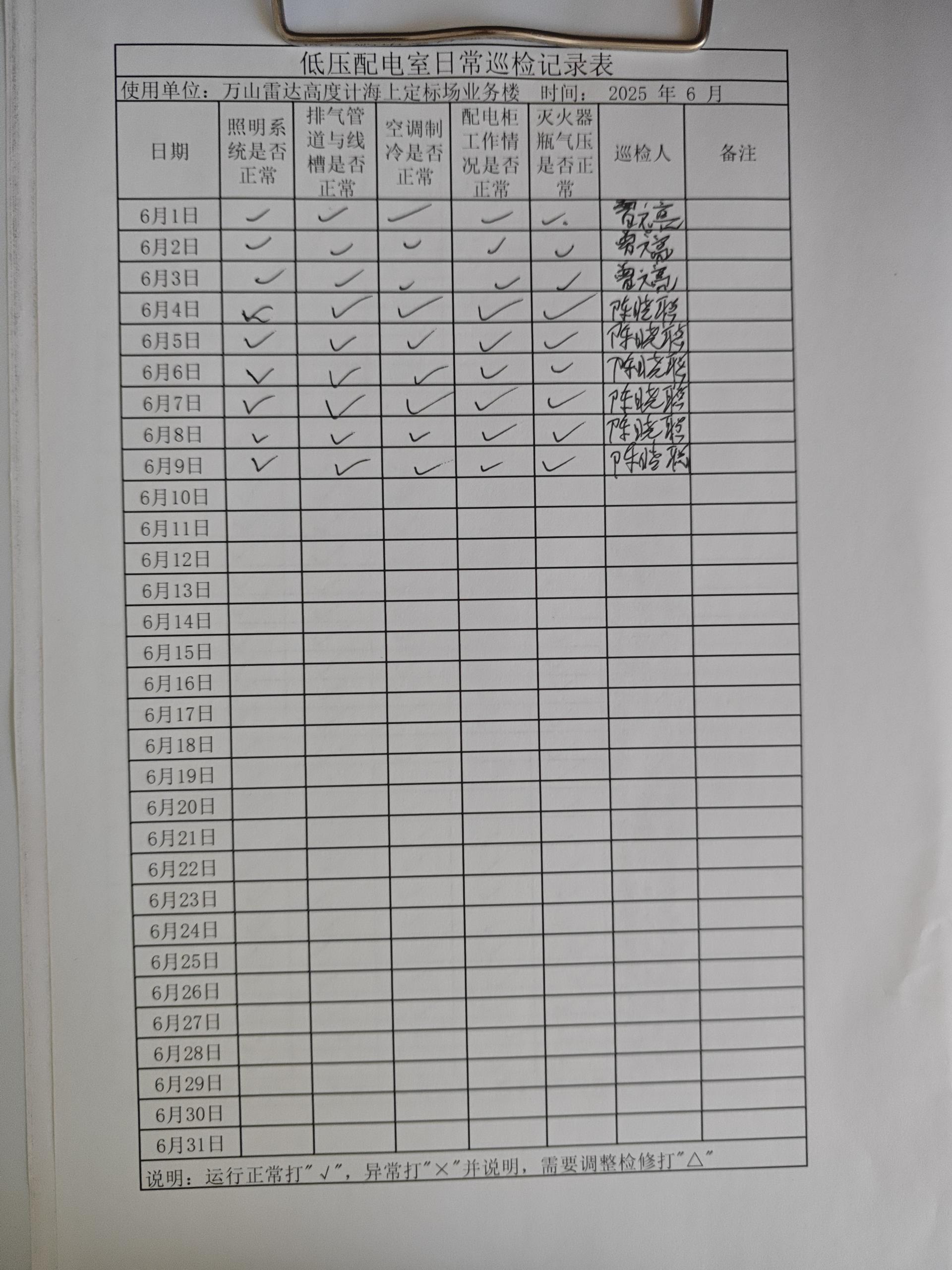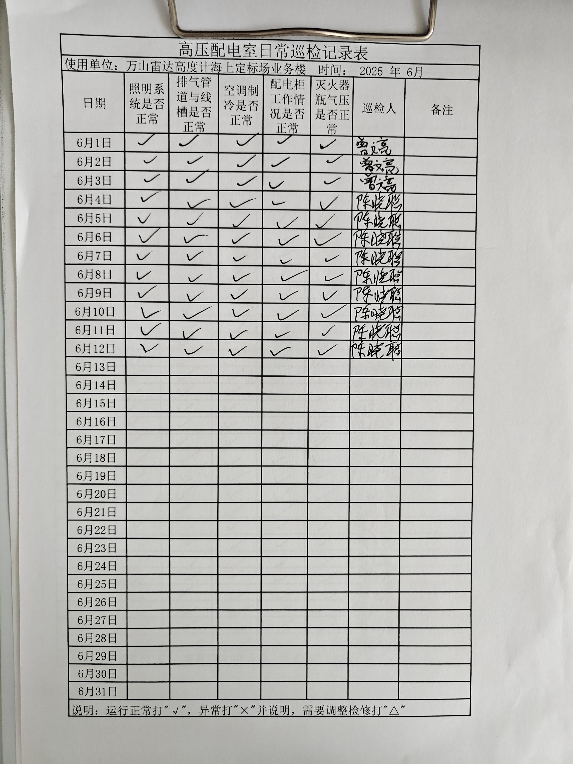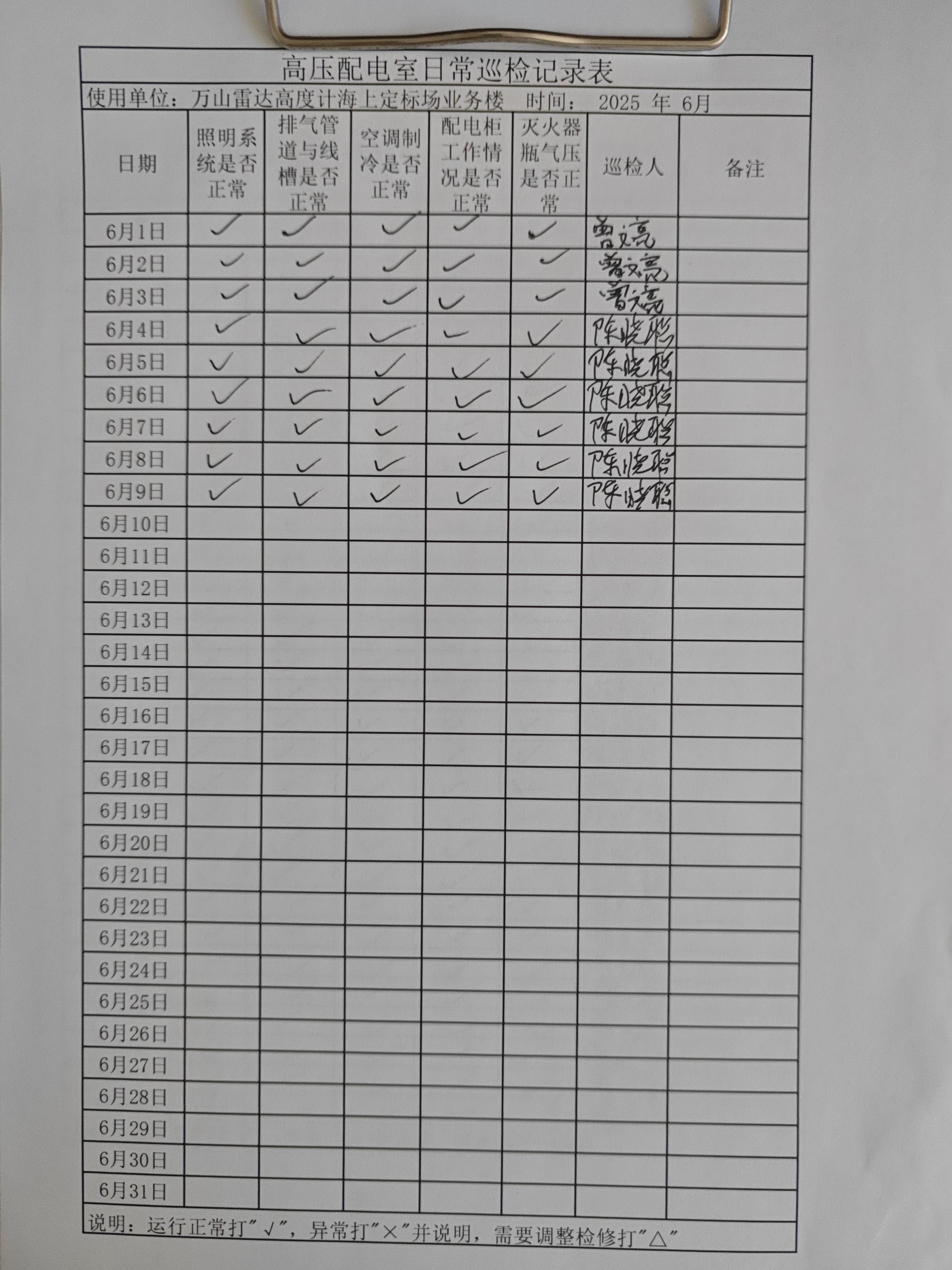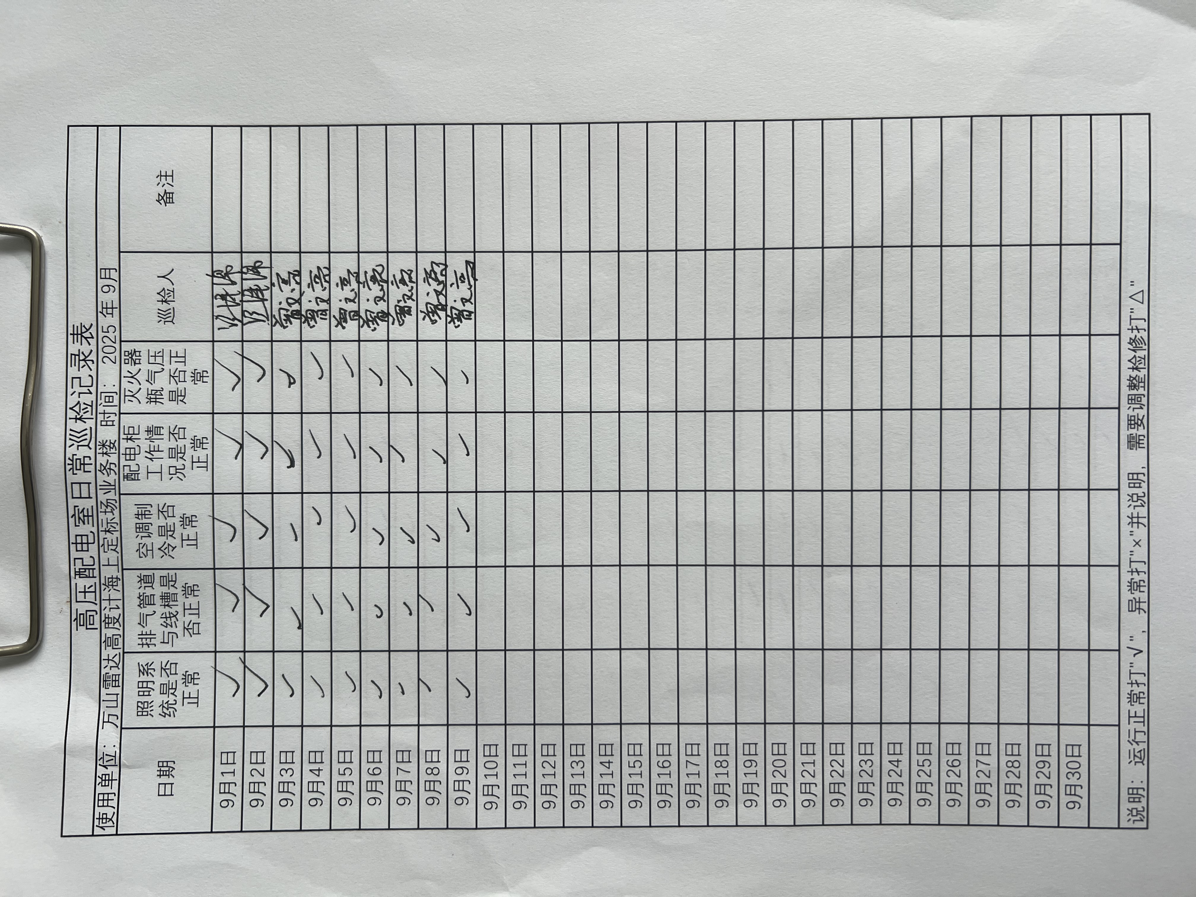 | 记录表-高压配电室日常巡检 | 原图 | 水印1 | 水印2 | 曾文亮 | 工作照 | 2025-09-23 15:40:29 |