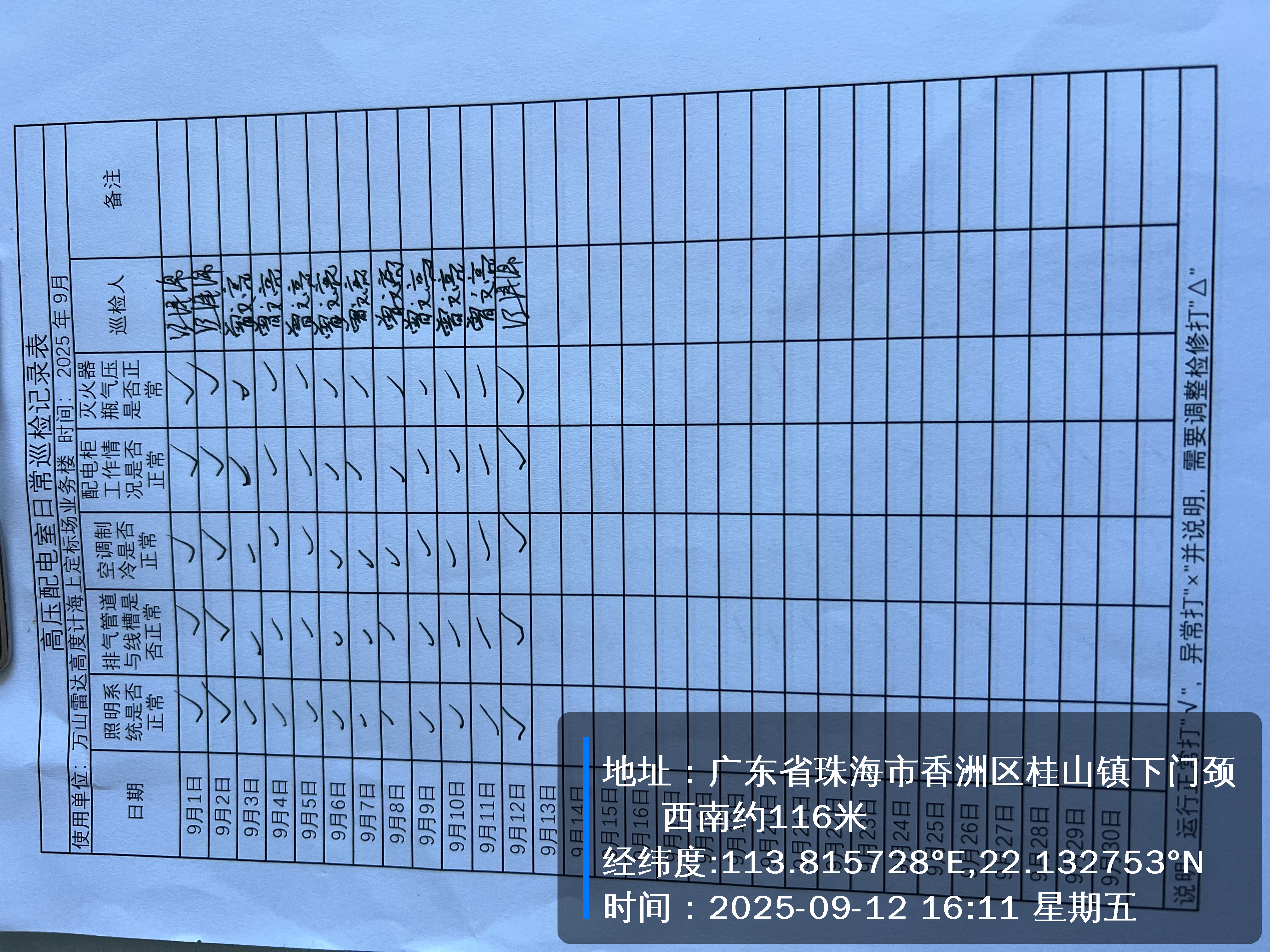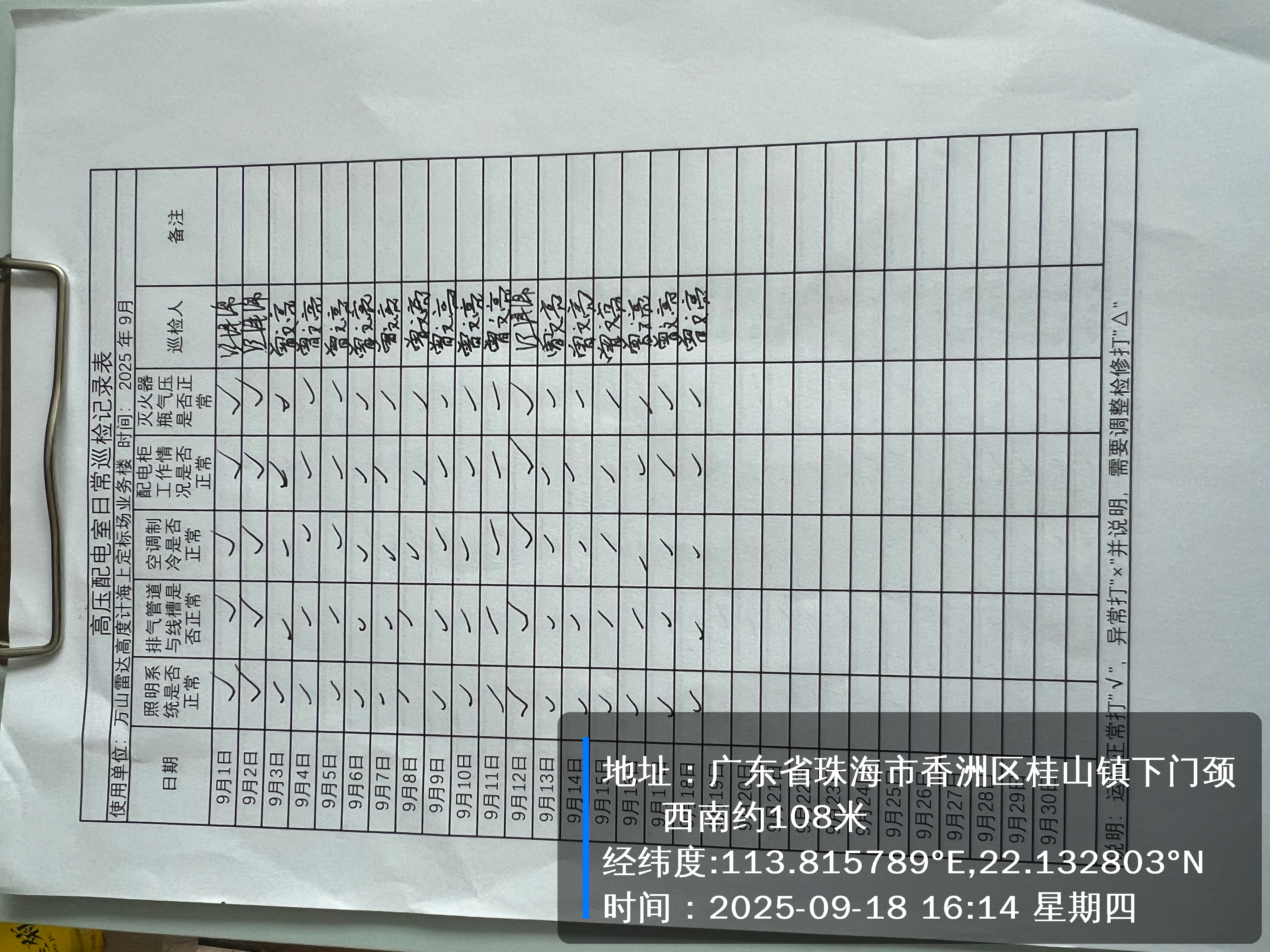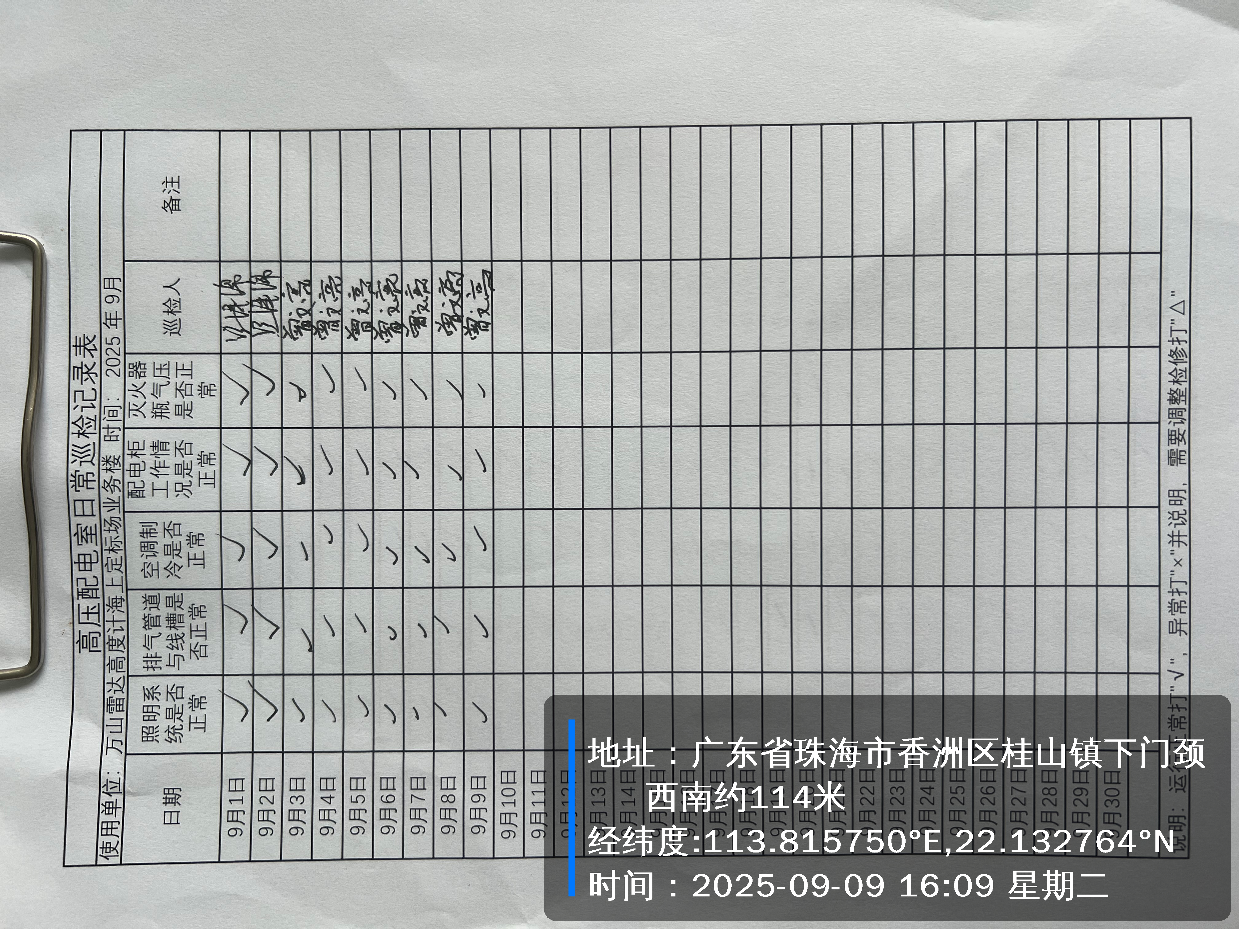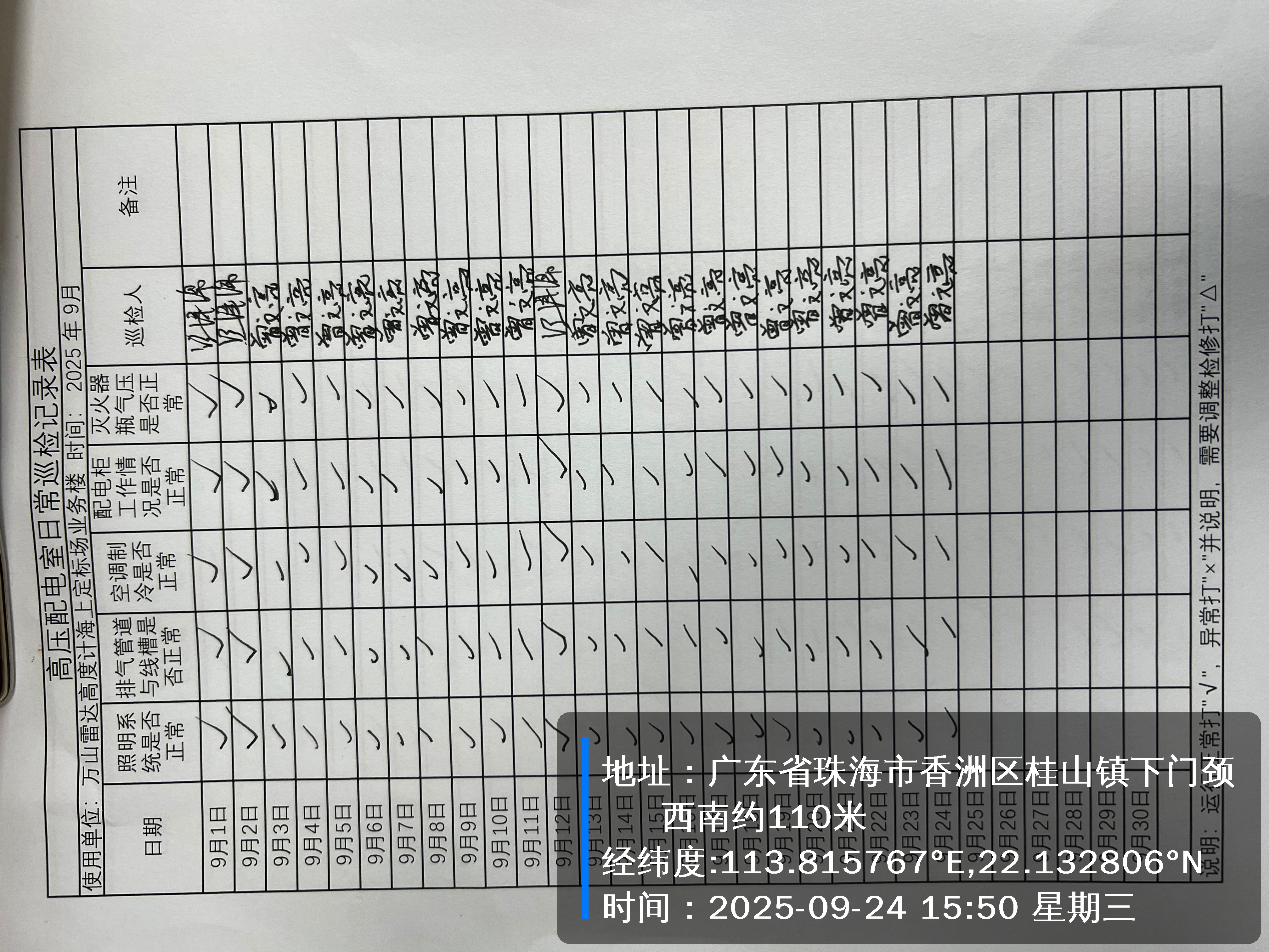 | 记录表-高压配电室日常巡检 | 原图 | 水印1 | 水印2 | 曾文亮 | 工作照 | 2025-09-22 15:37:46 |