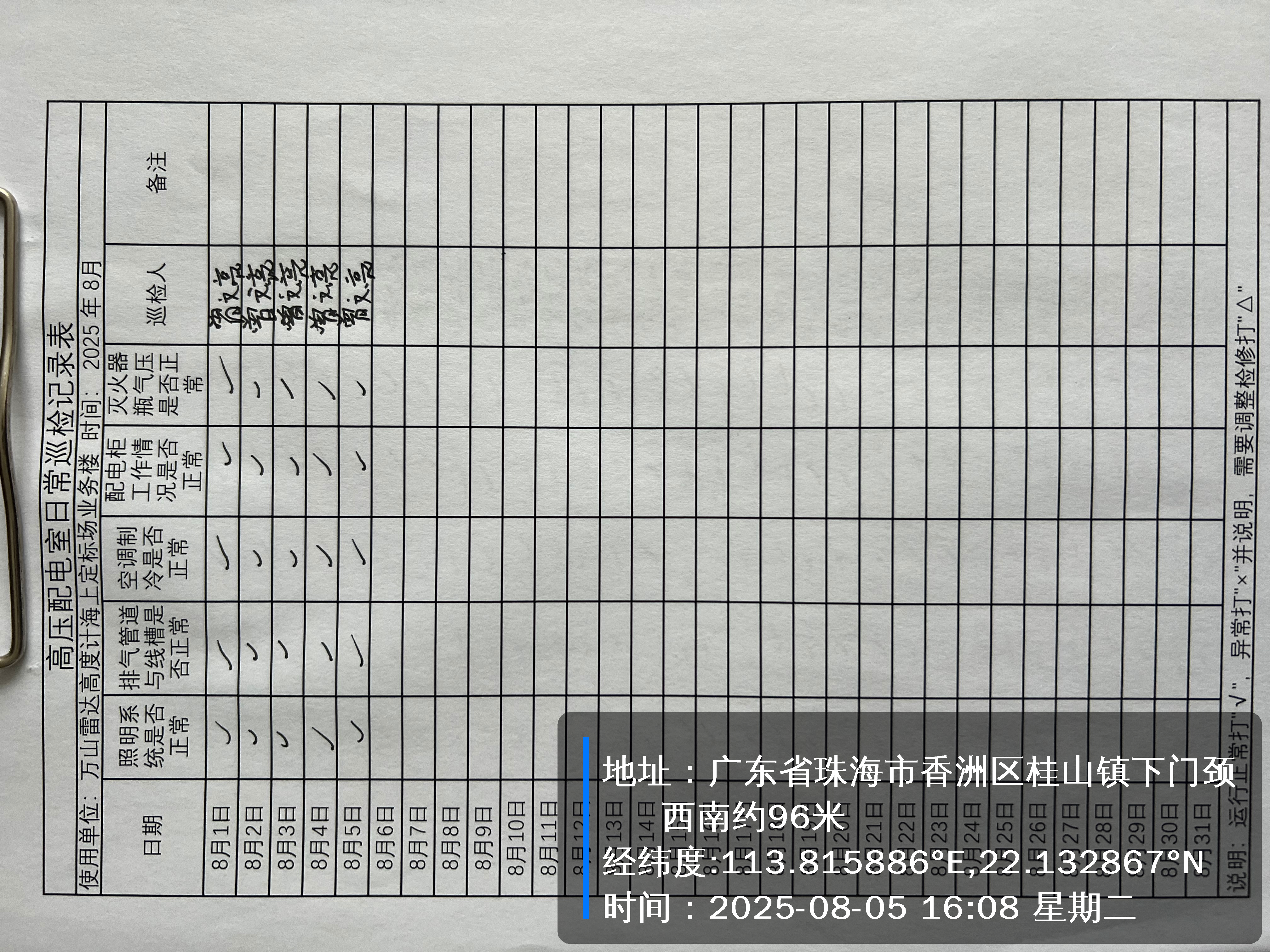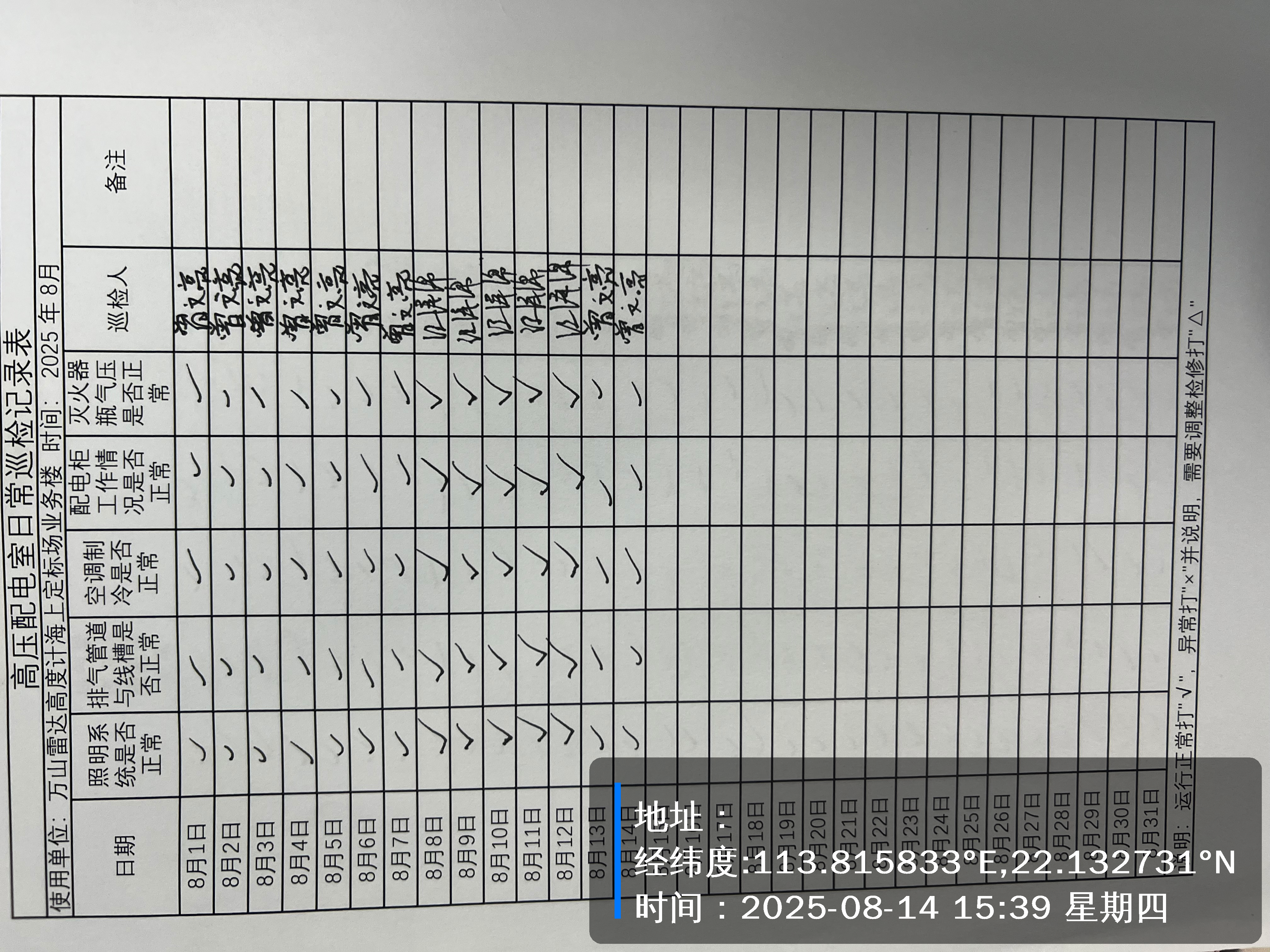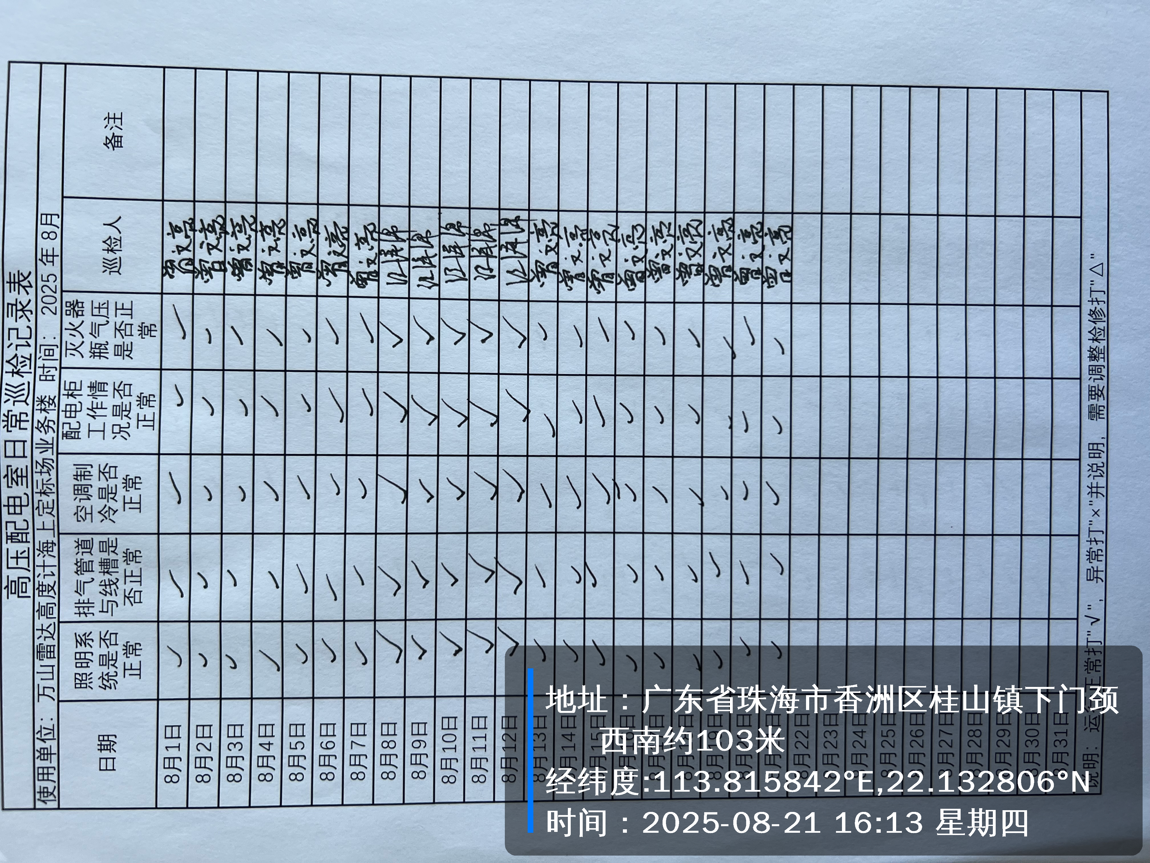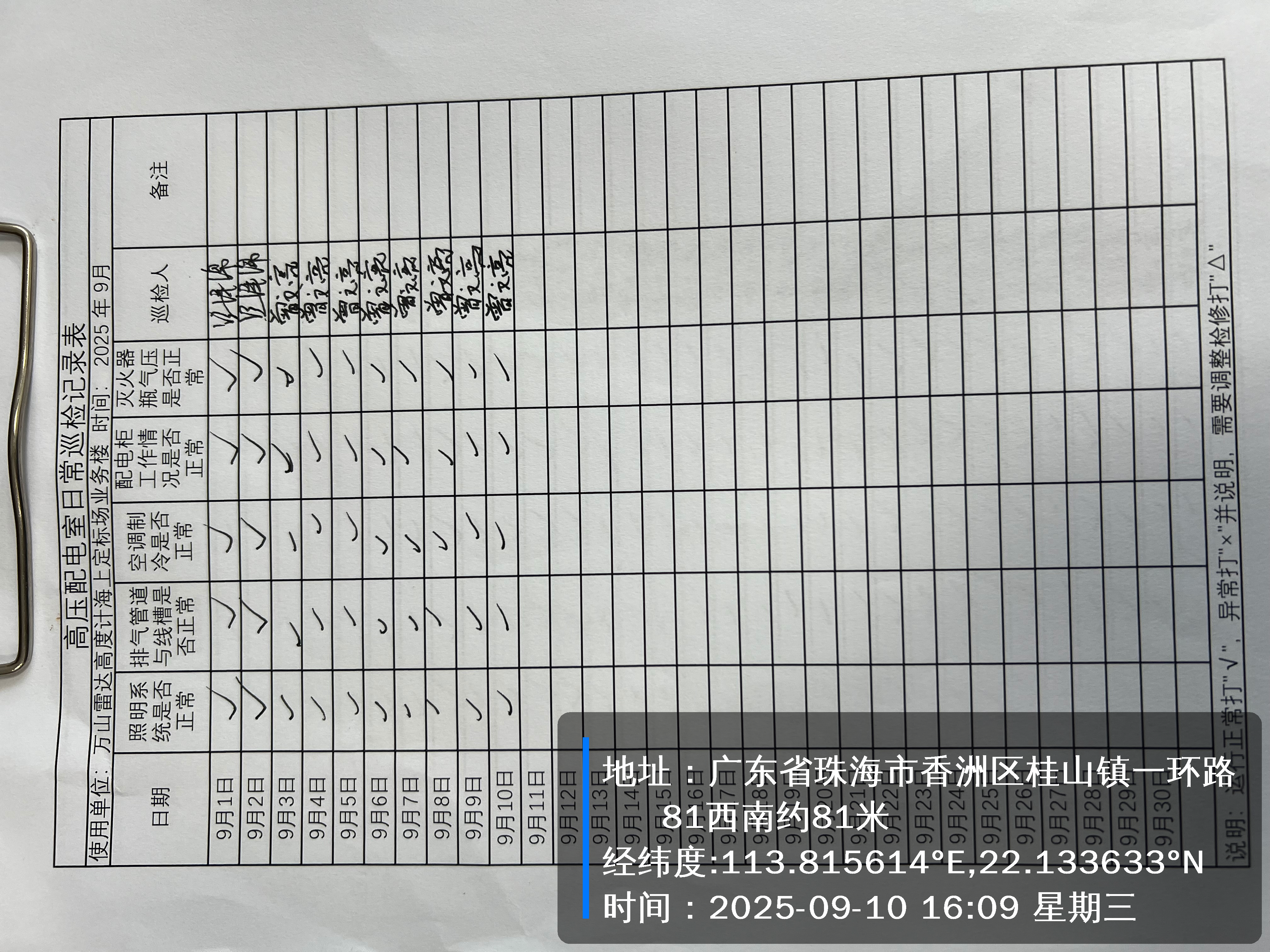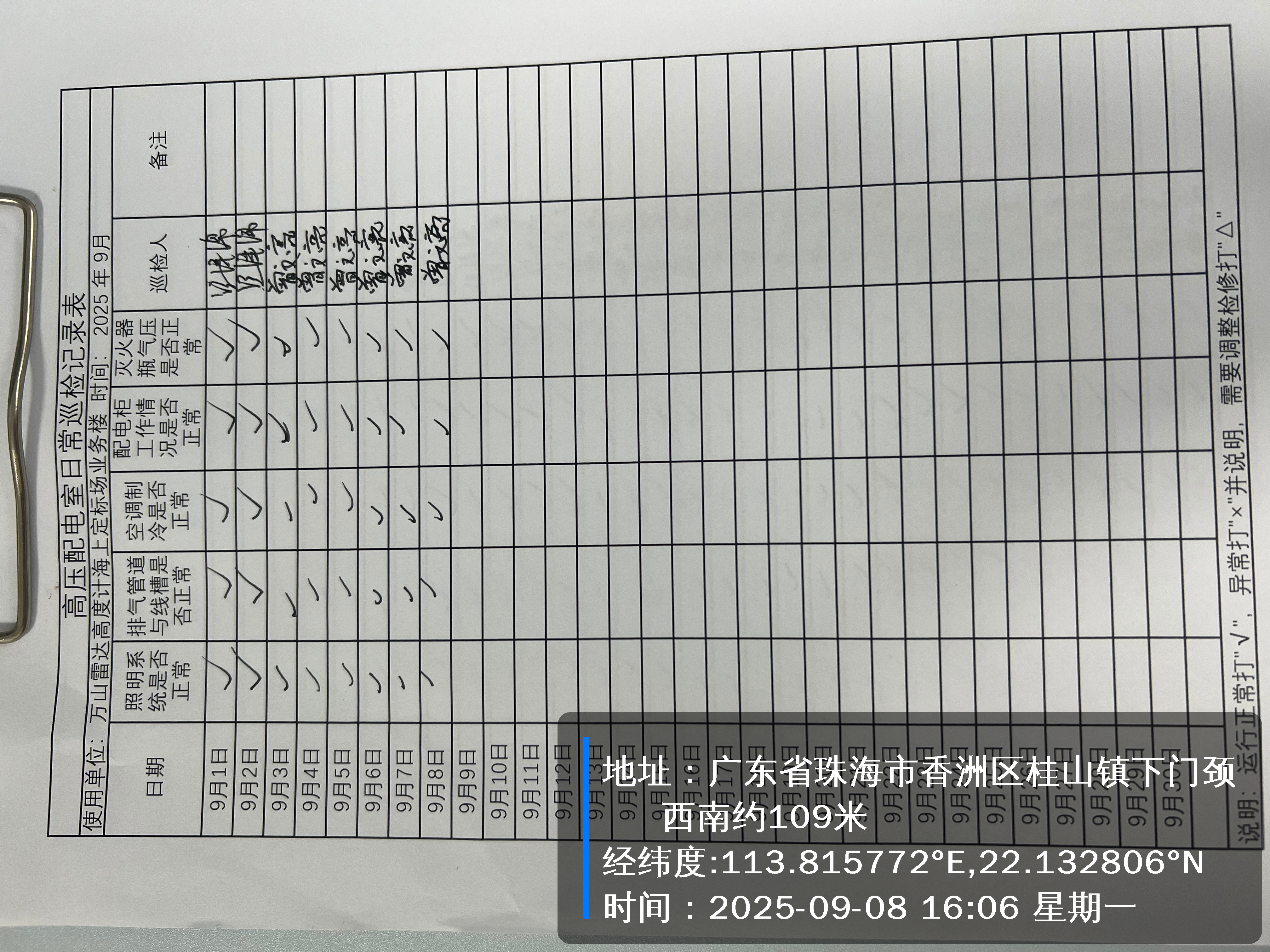 | 记录表-高压配电室日常巡检 | 原图 | 水印1 | 水印2 | 曾文亮 | 工作照 | 2025-09-22 15:37:46 |