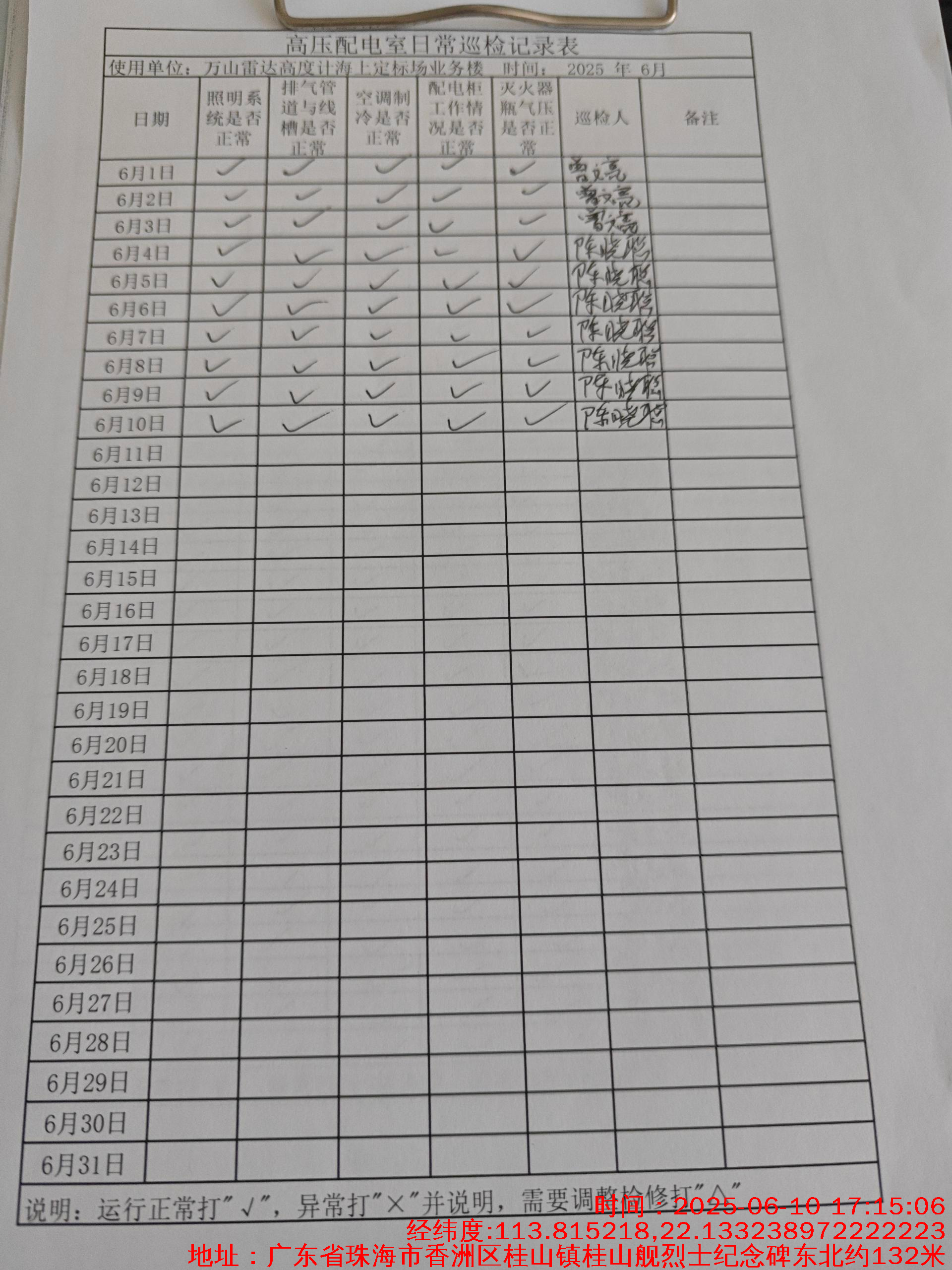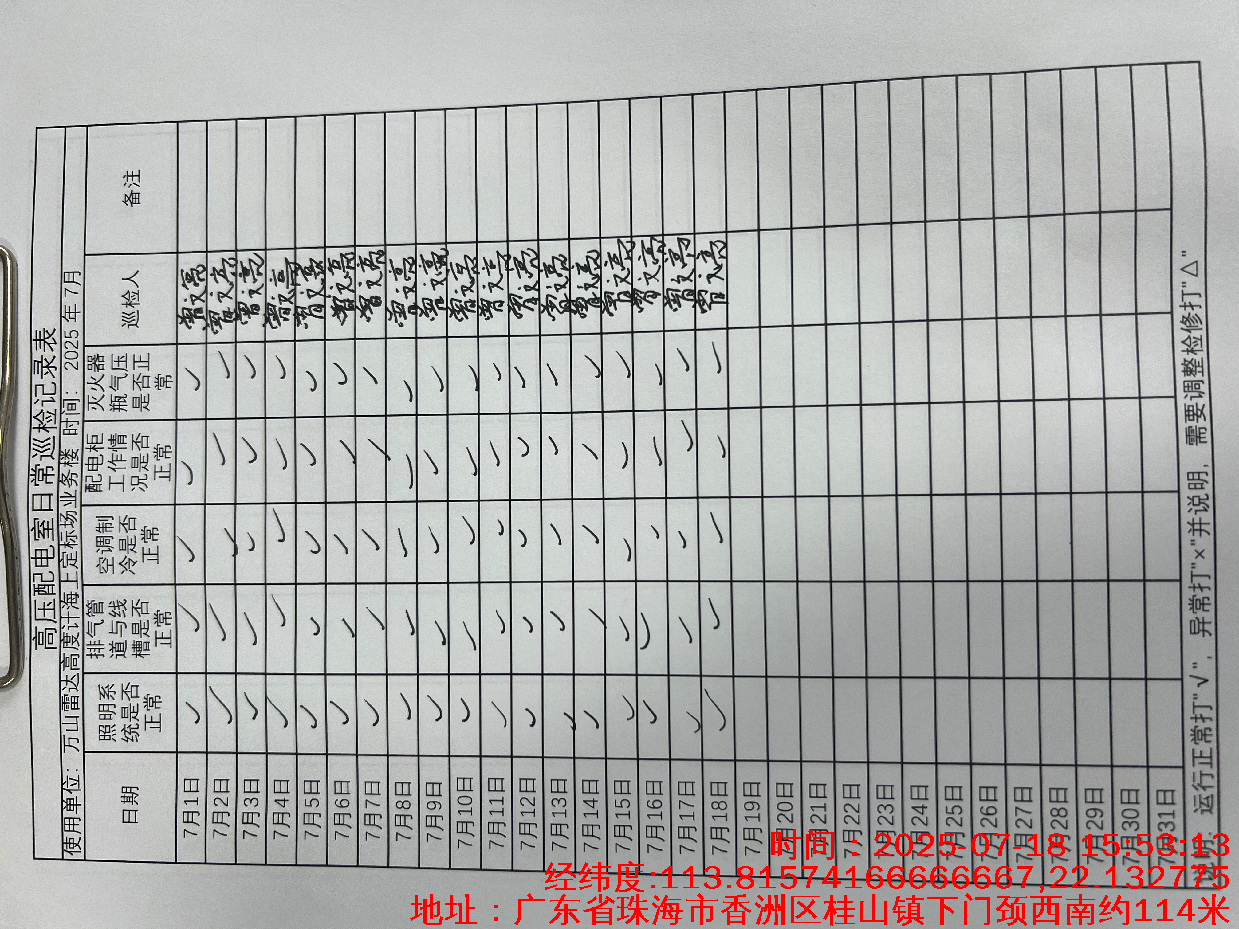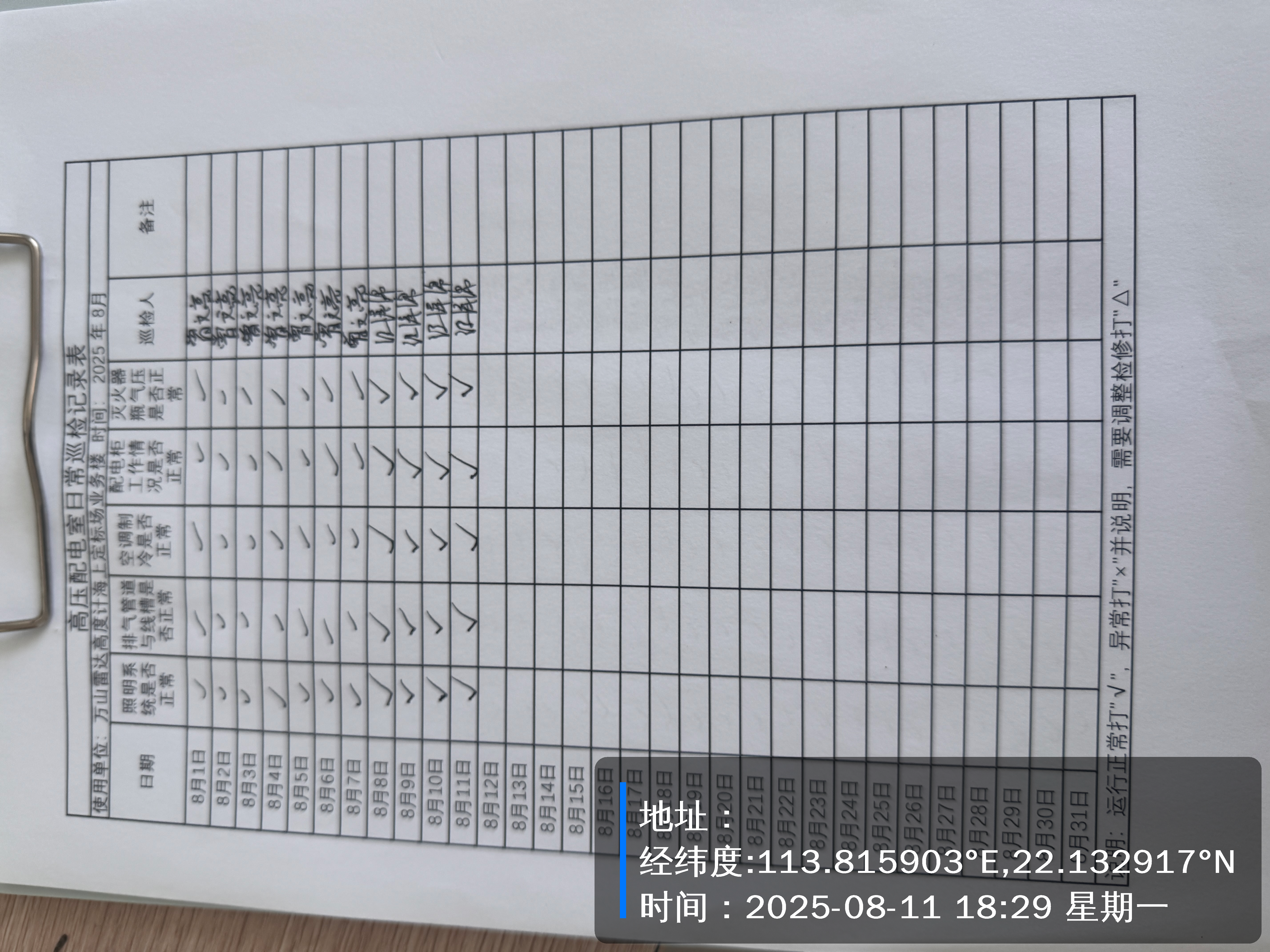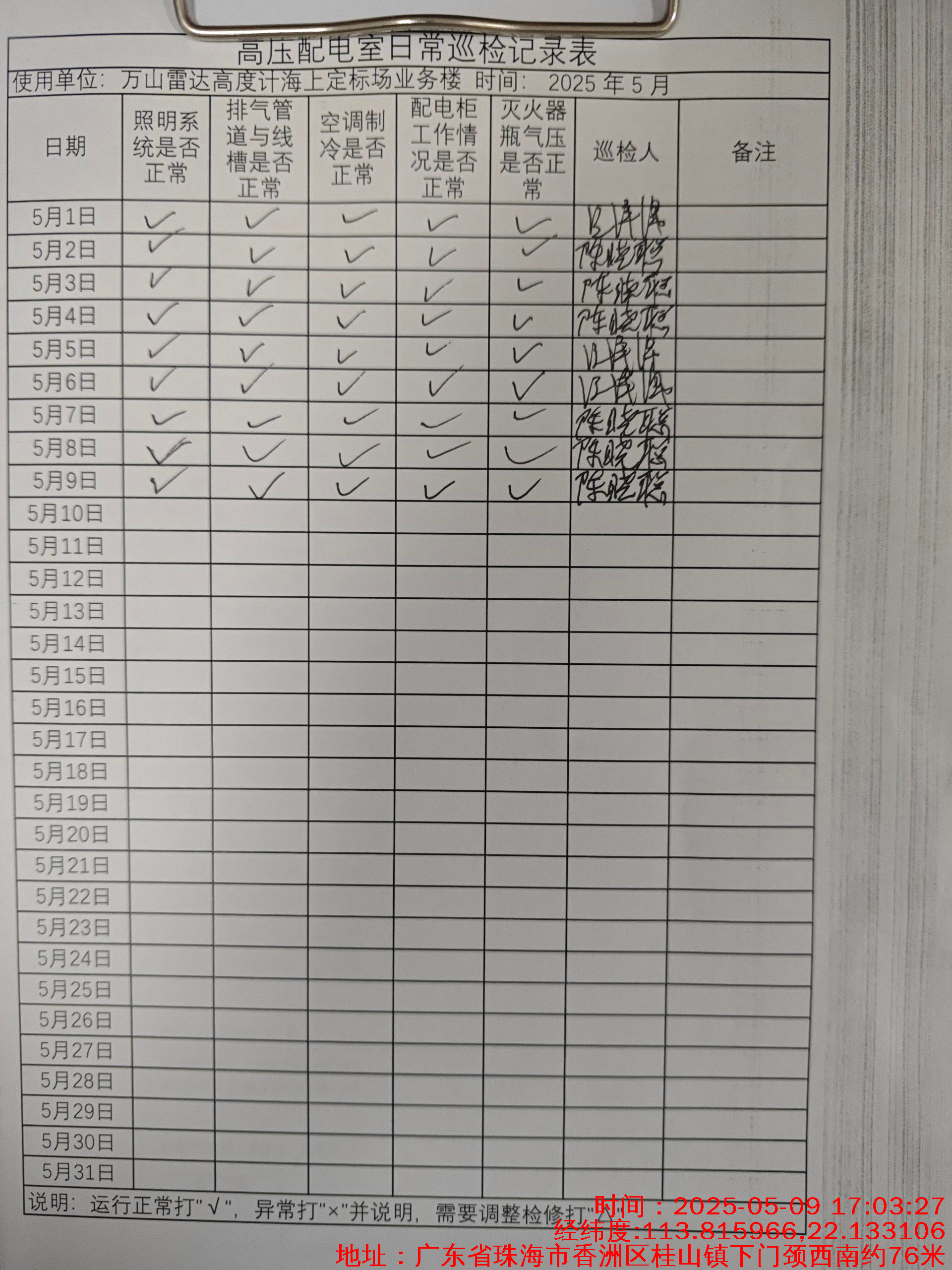 | 记录表-高压配电室日常巡检 | 原图 | 水印1 | 水印2 | 曾文亮 | 工作照 | 2025-09-22 15:37:46 |