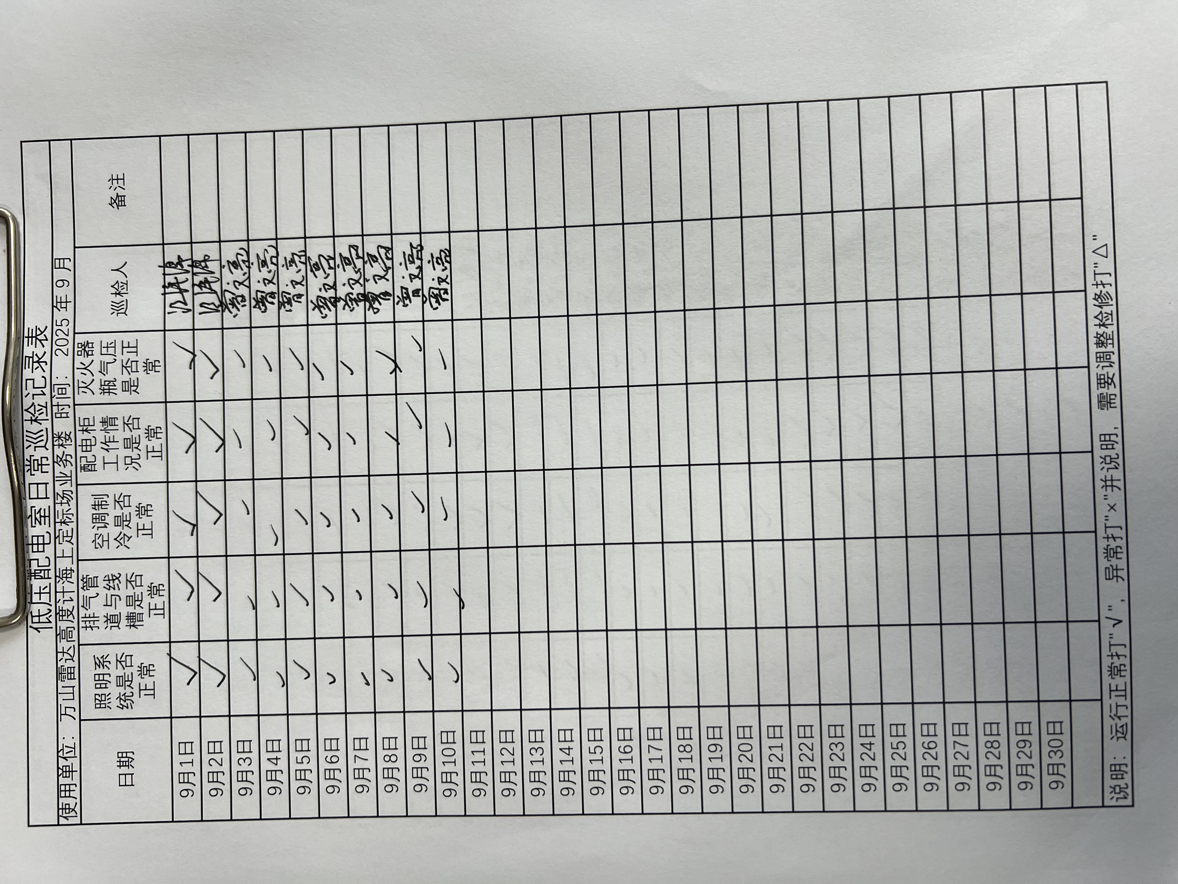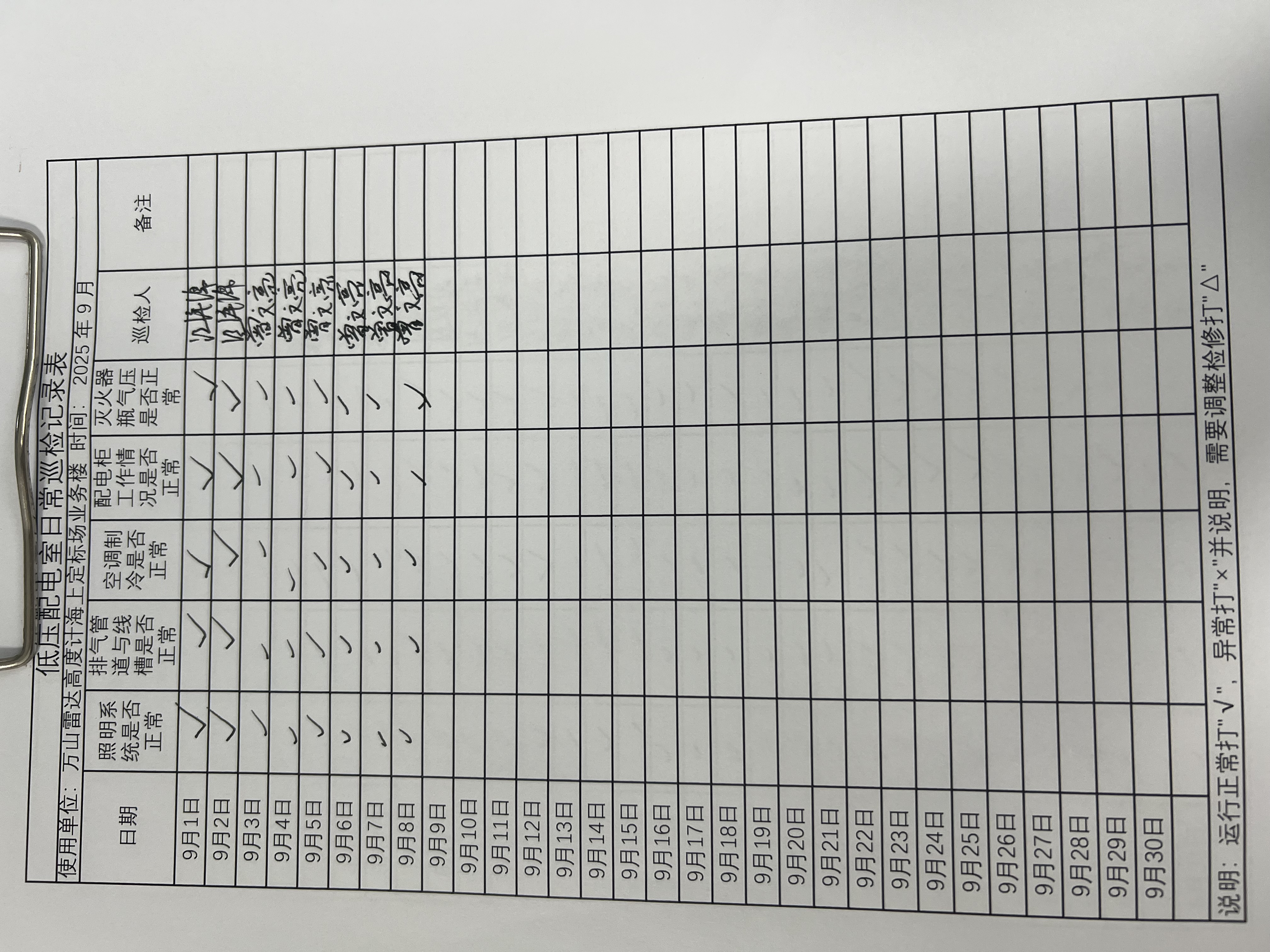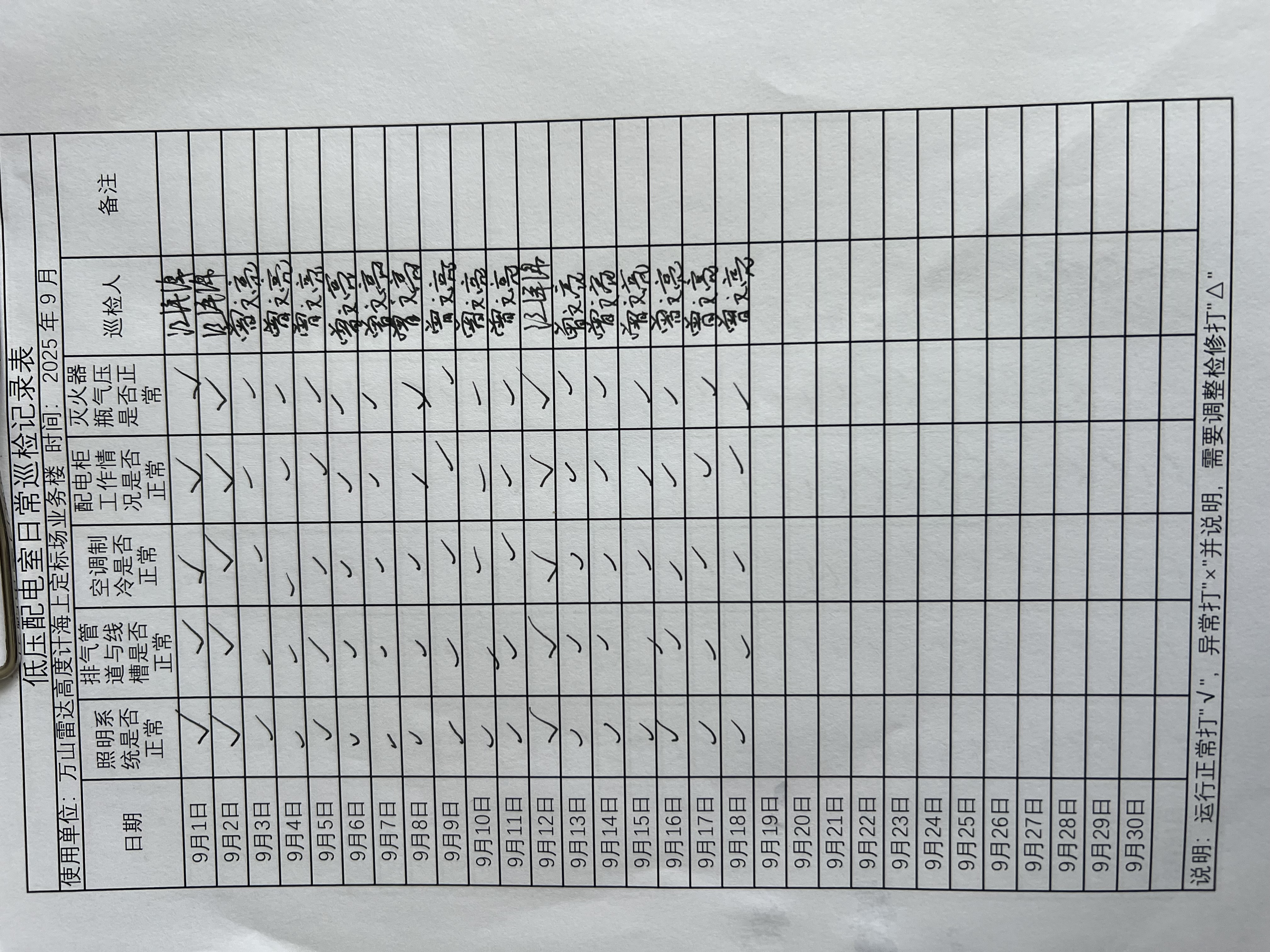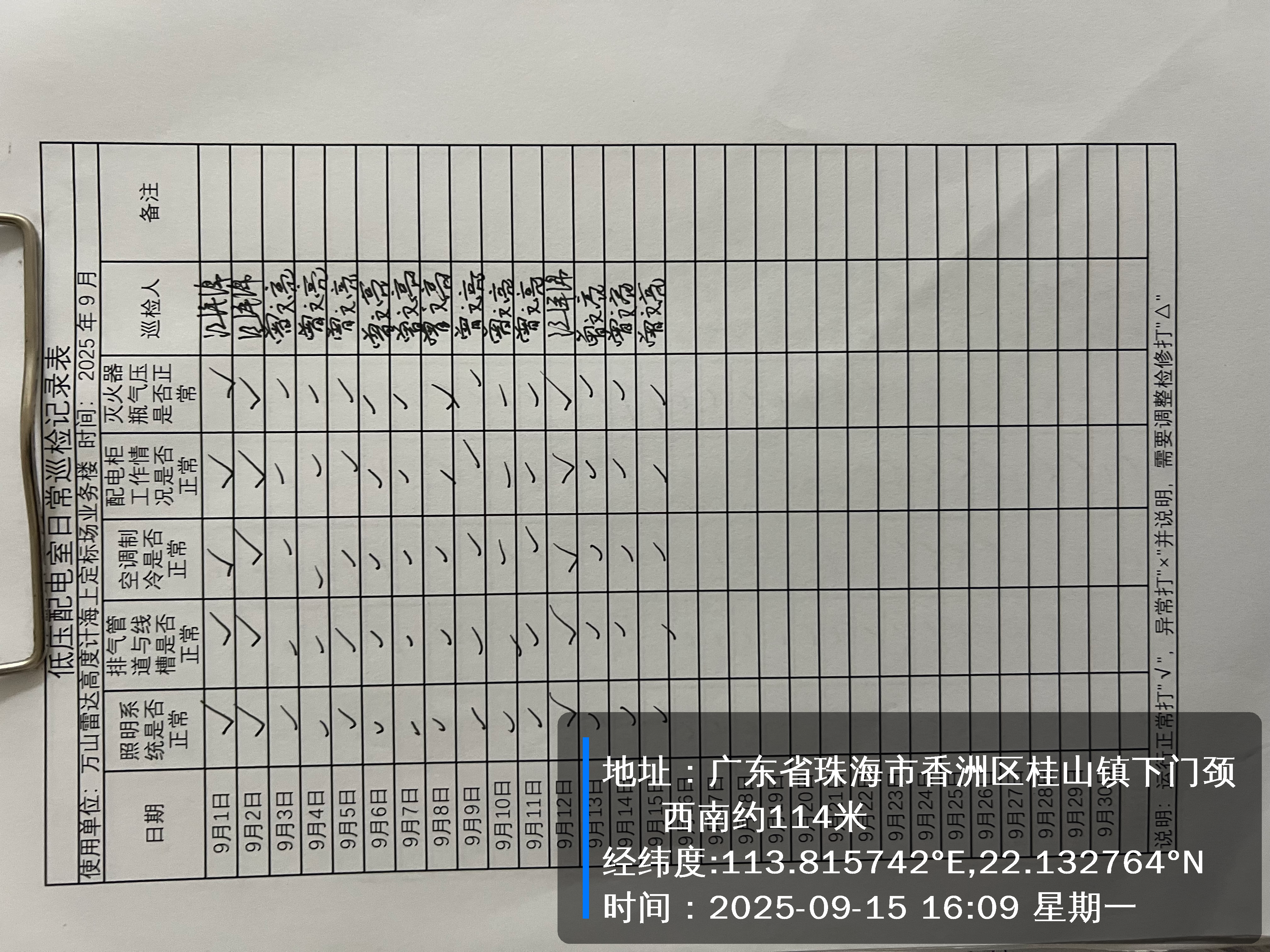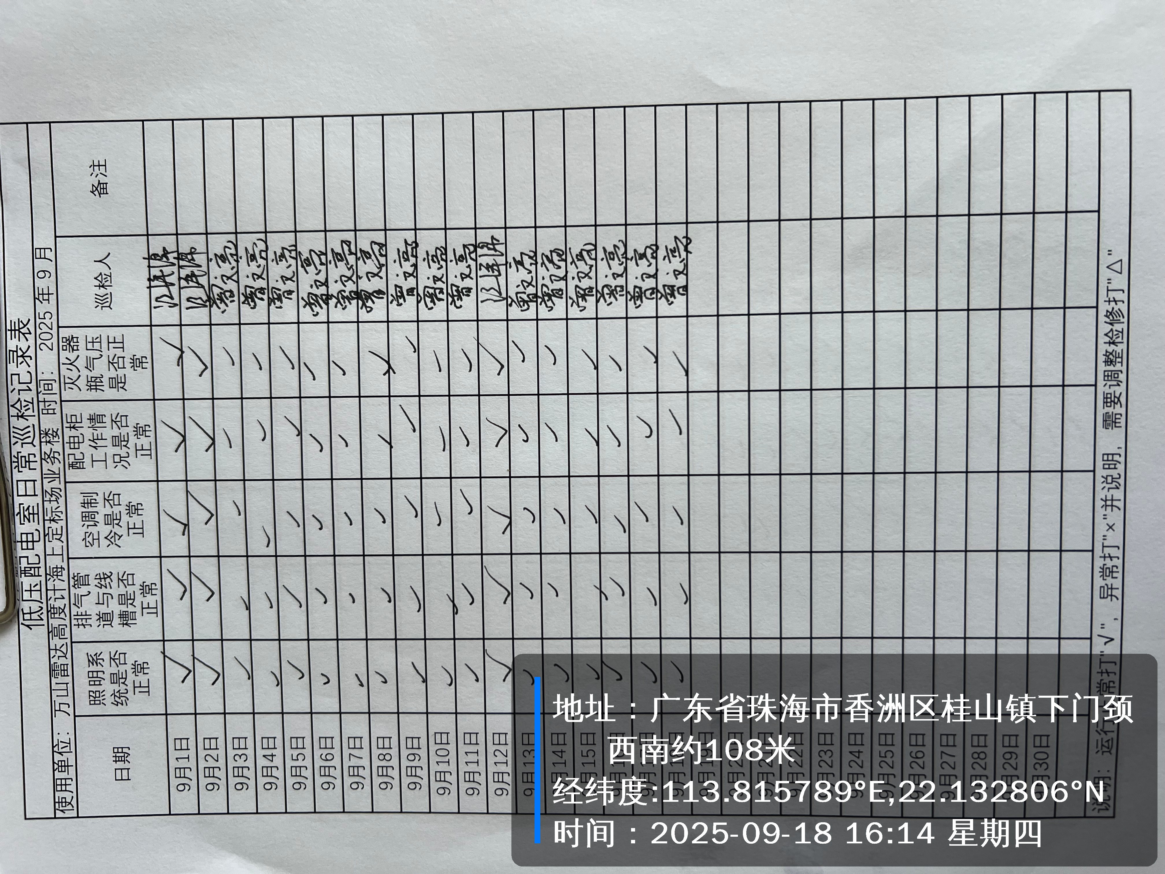 | 记录表-低压配电室日常巡检 | 原图 | 水印1 | 水印2 | 曾文亮 | 工作照 | 2025-09-23 15:40:13 |