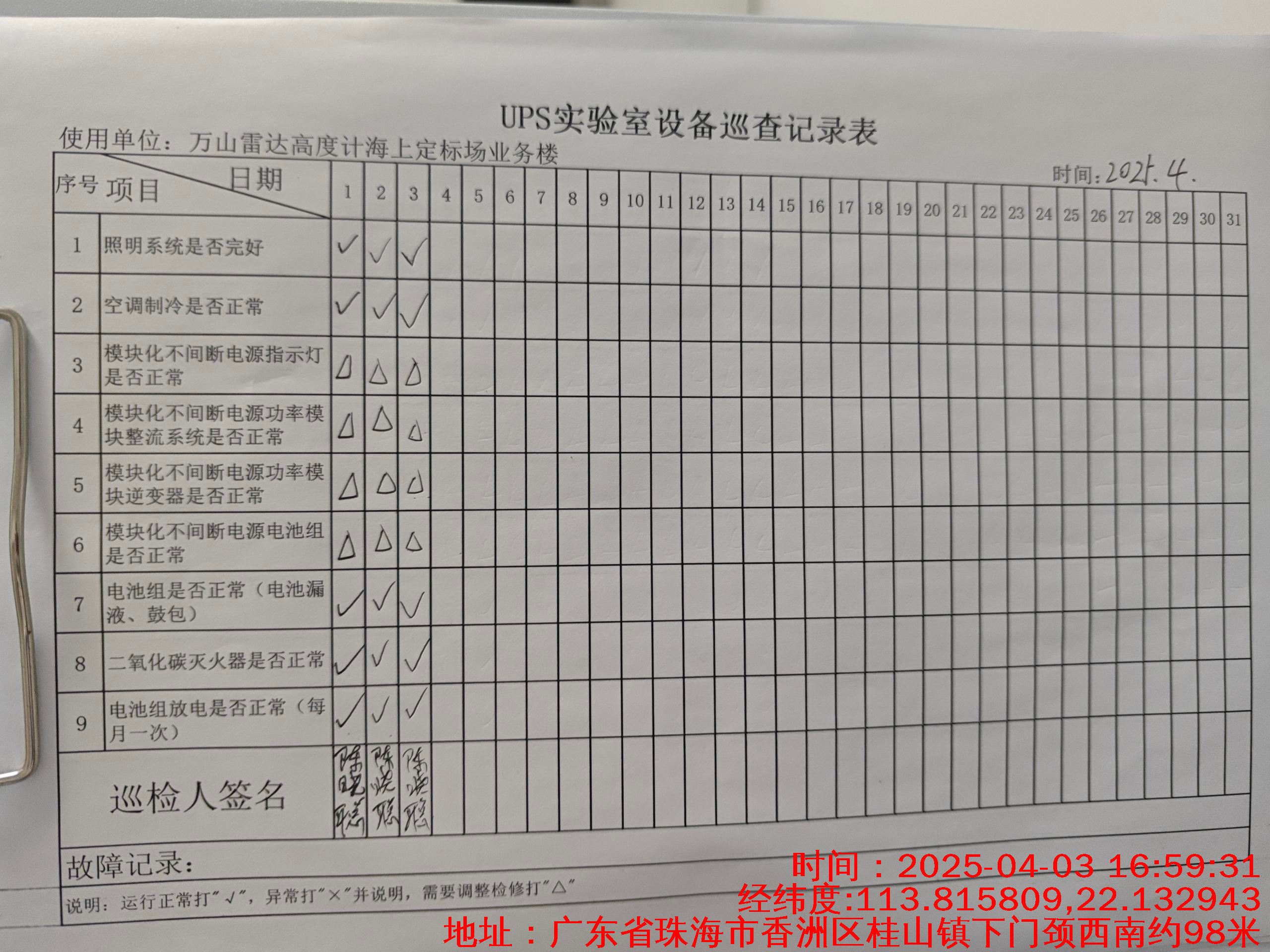 | 记录表-UPS实验室设备巡查 | 原图 | 水印1 | 水印2 | 陈晓聪 | 工作照 | 2025-04-02 17:00:00 |
