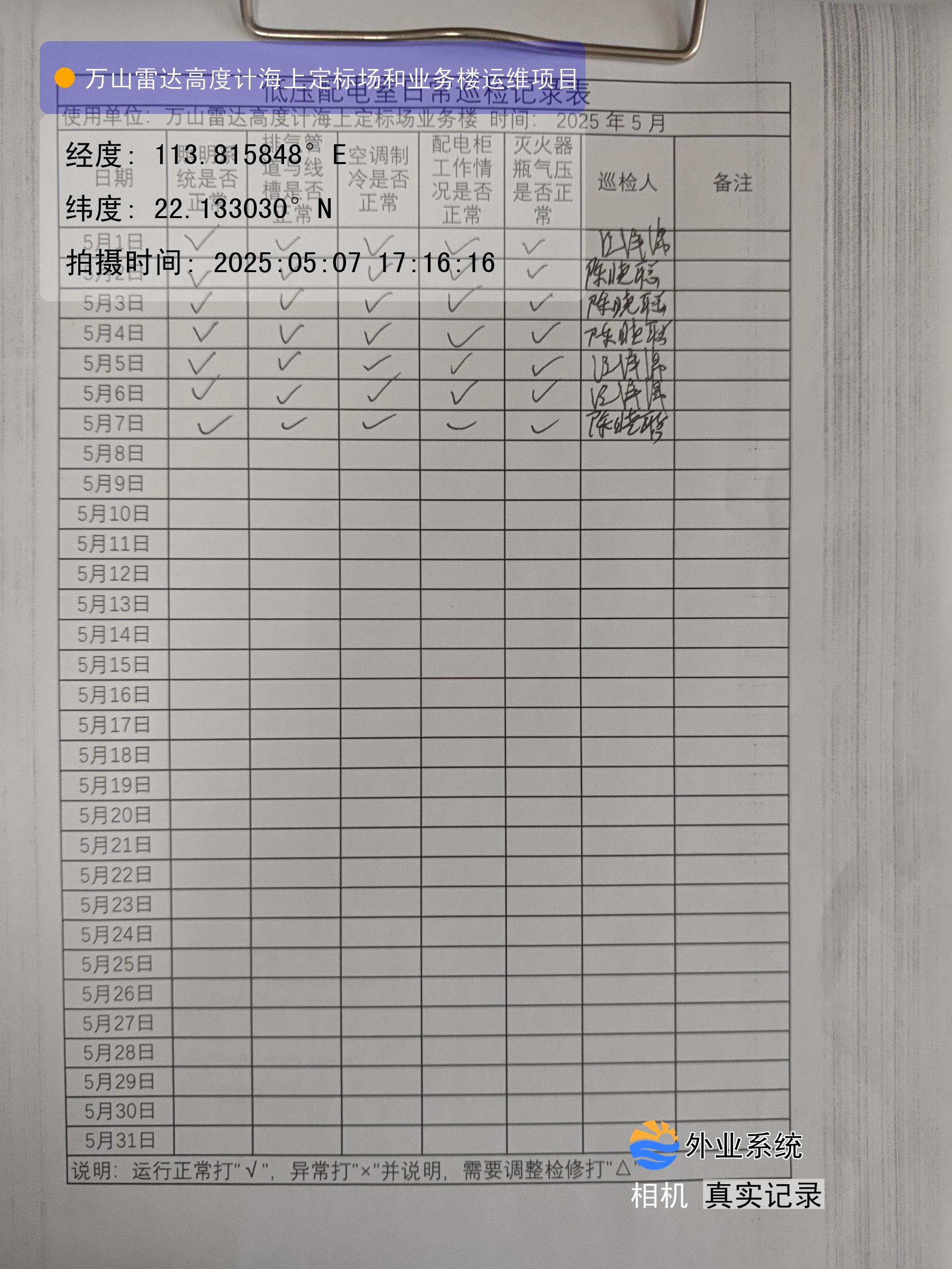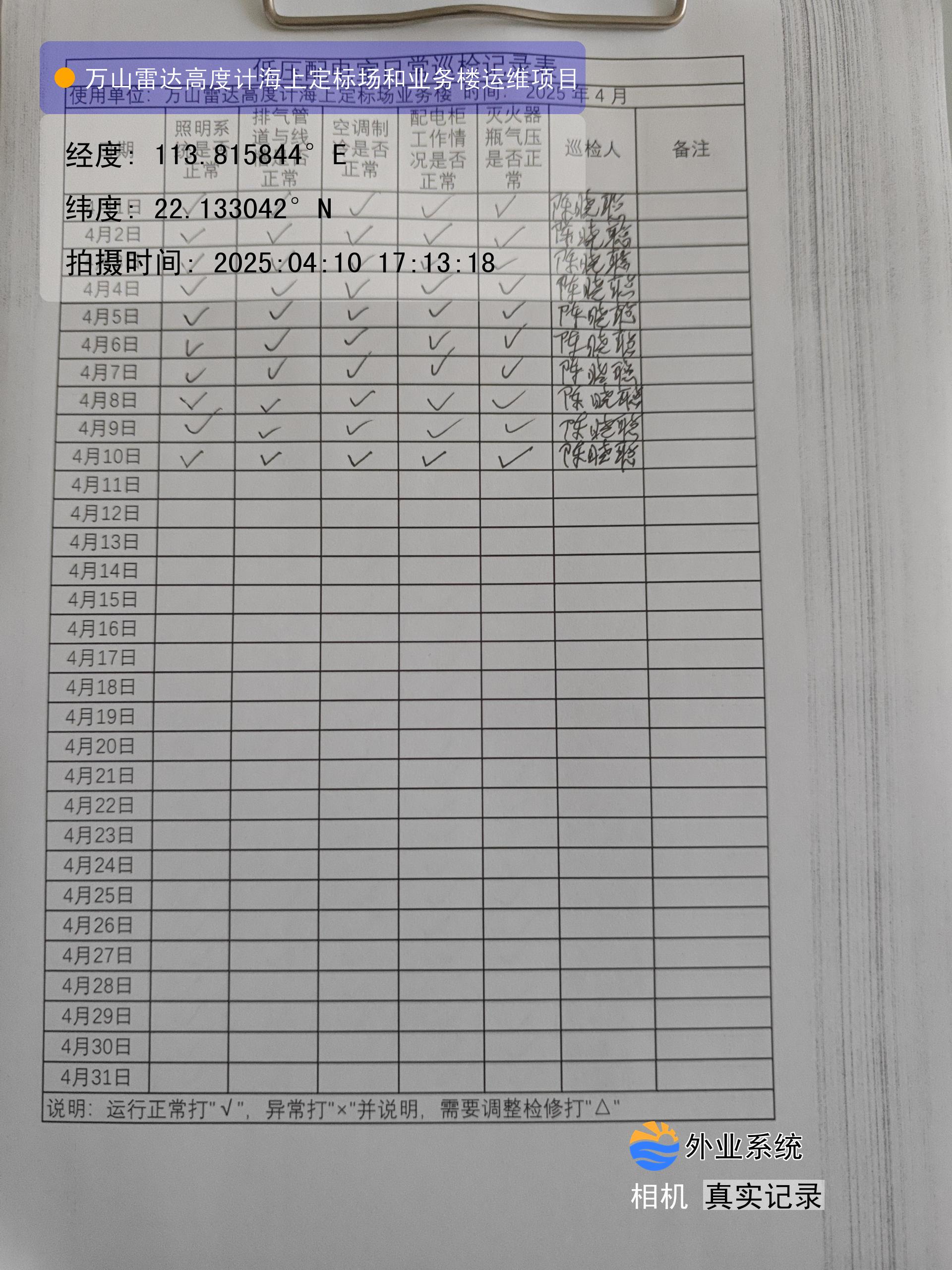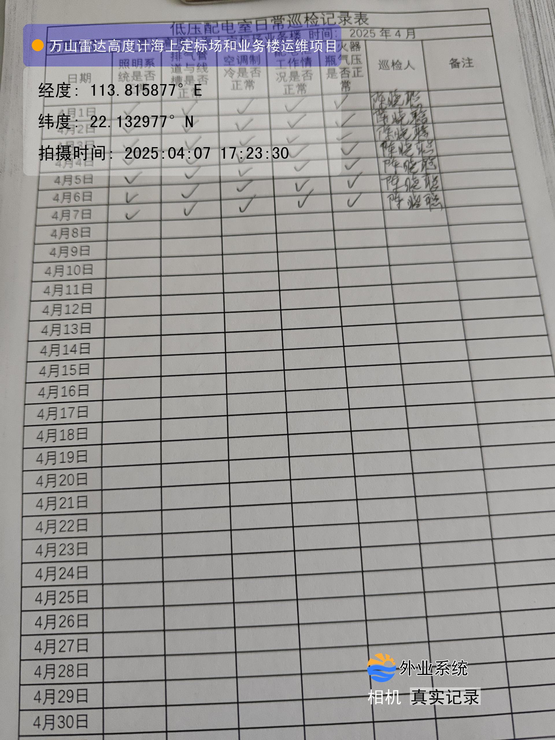 | 记录表-低压配电室日常巡检 | 原图 | 水印1 | 水印2 | 陈晓聪 | 工作照 | 2025-04-07 17:00:00 |