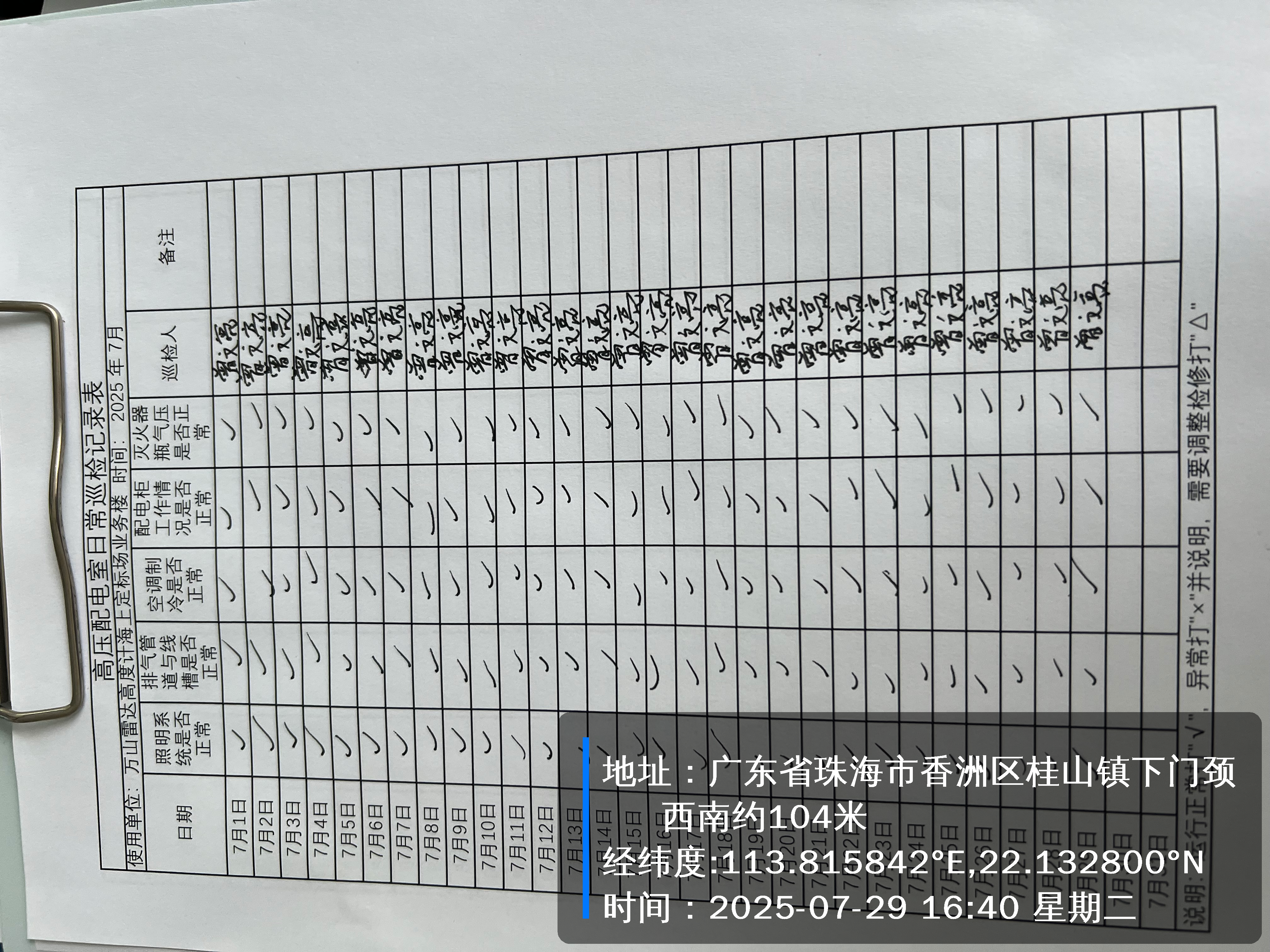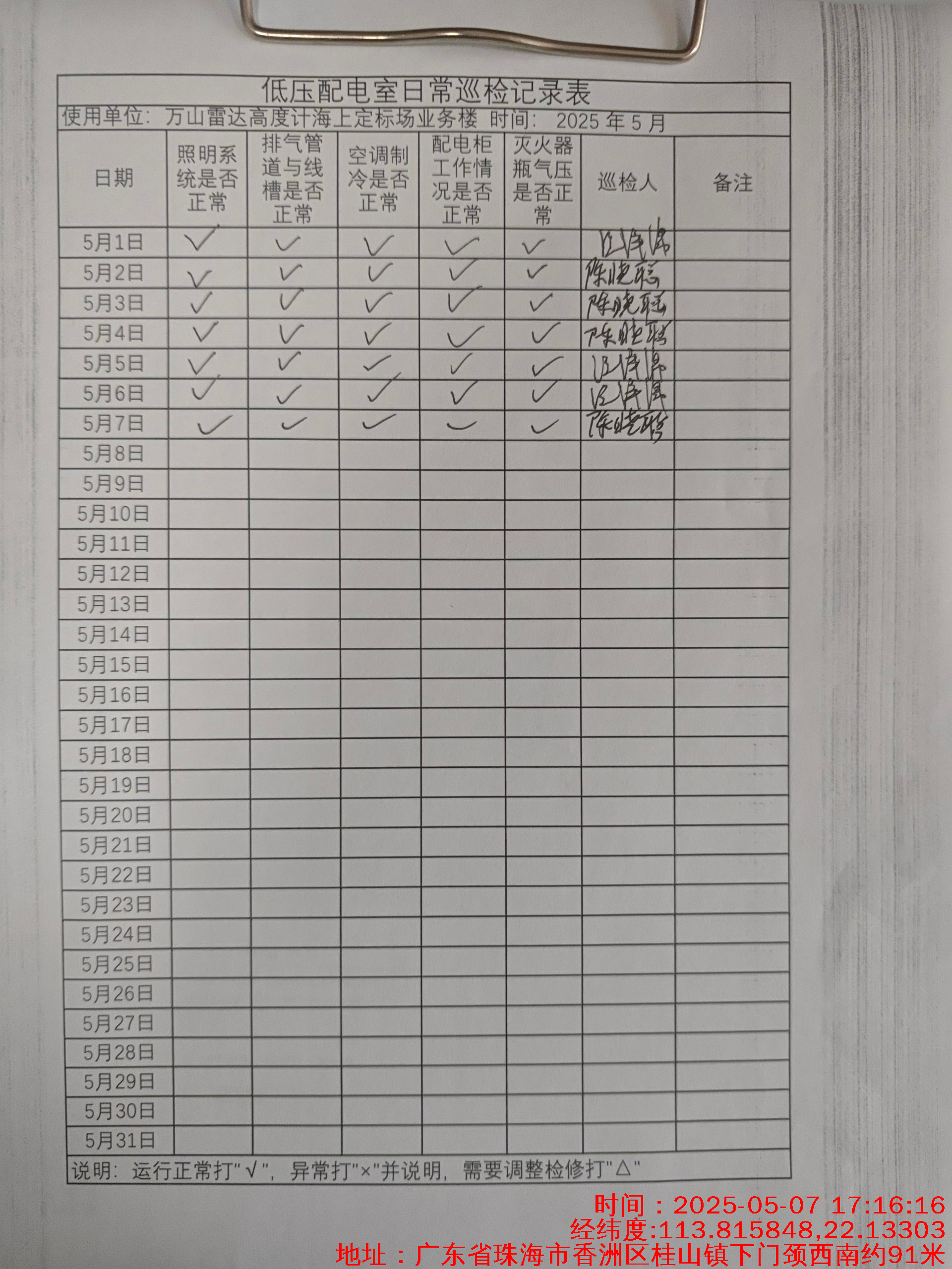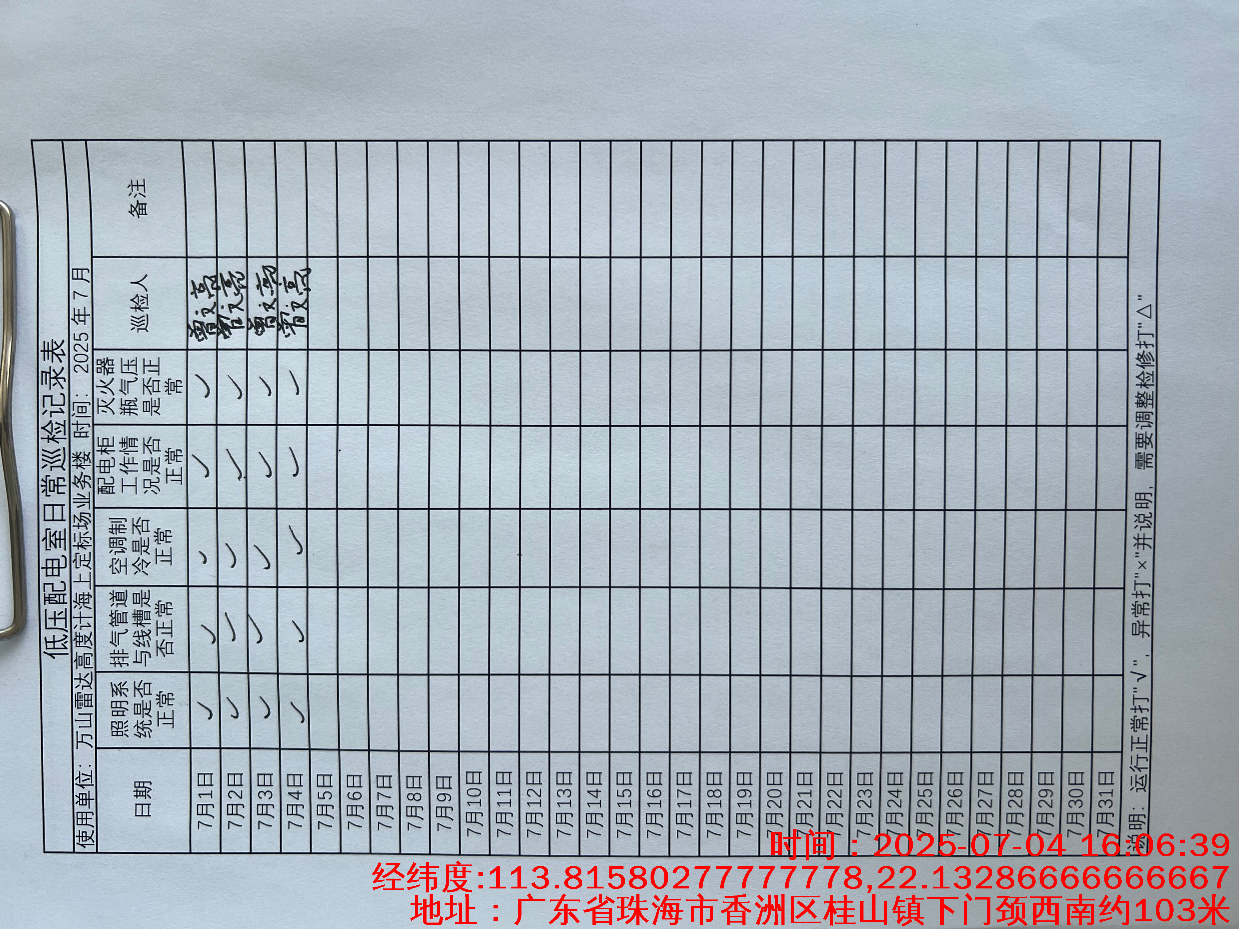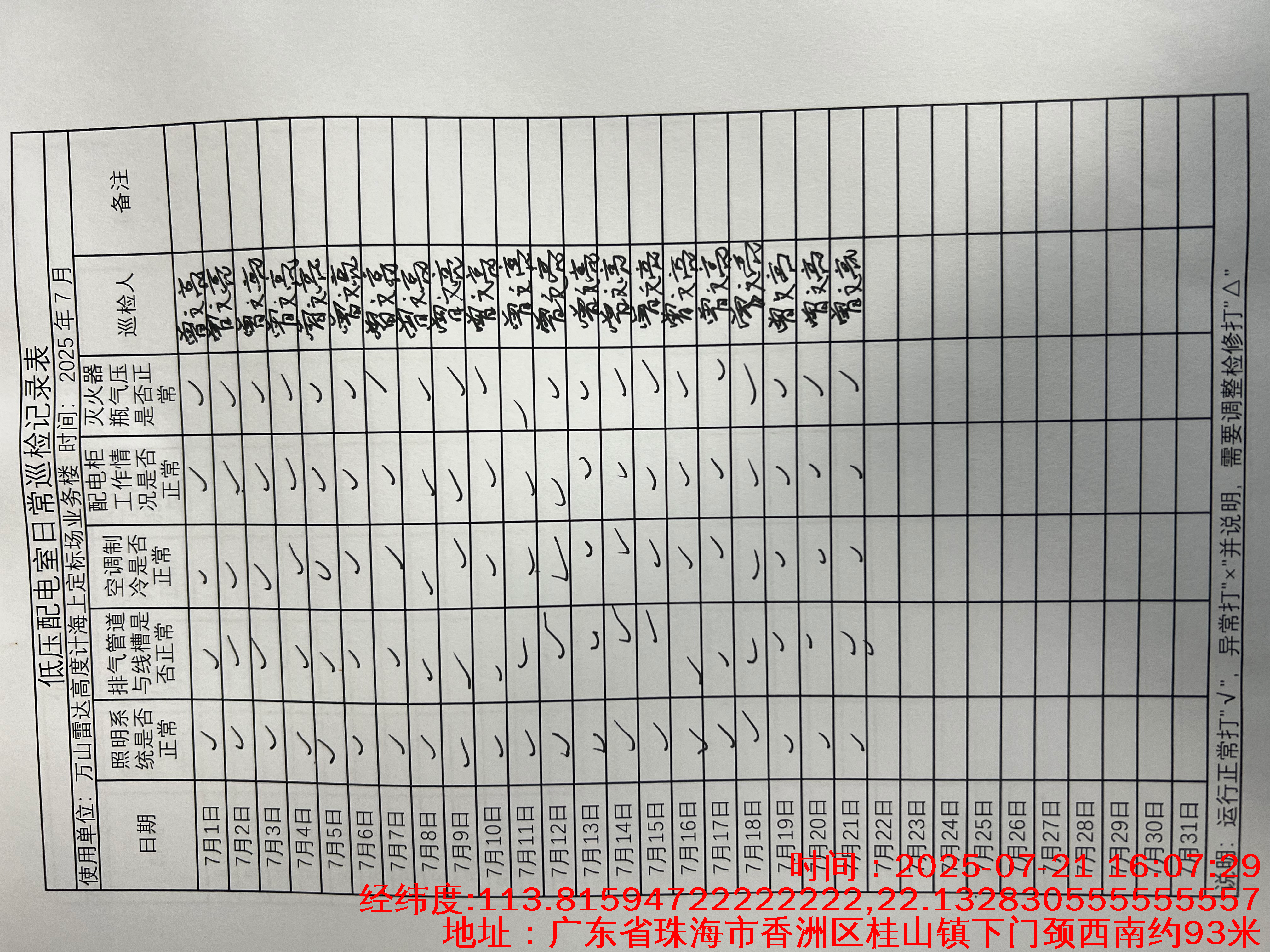 | 记录表-低压配电室日常巡检 | 原图 | 水印1 | 水印2 | 陈晓聪 | 工作照 | 2025-04-07 17:00:00 |