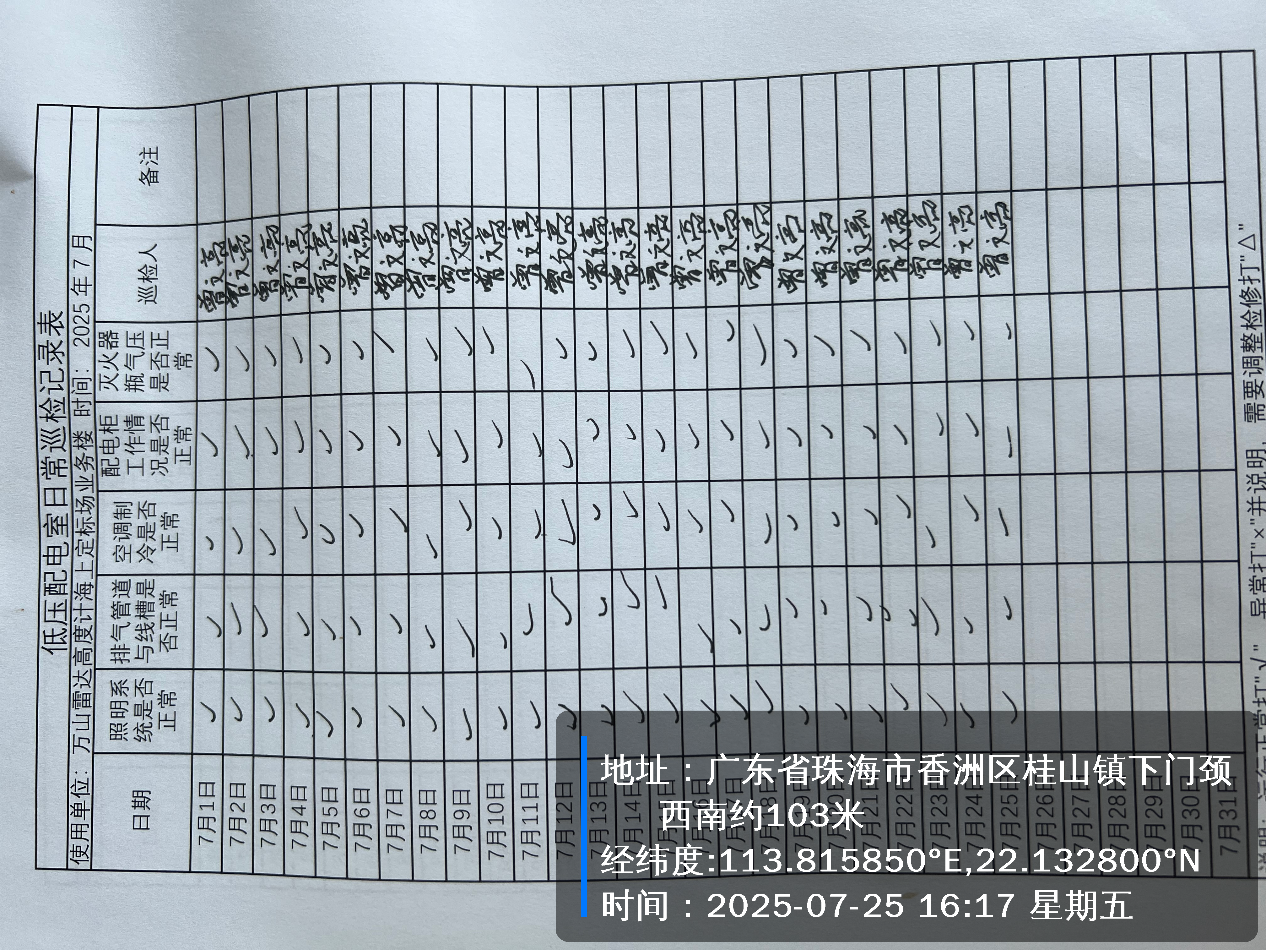 | 记录表-低压配电室日常巡检 | 原图 | 水印1 | 水印2 | 曾文亮 | 工作照 | 2025-09-25 15:45:58 |