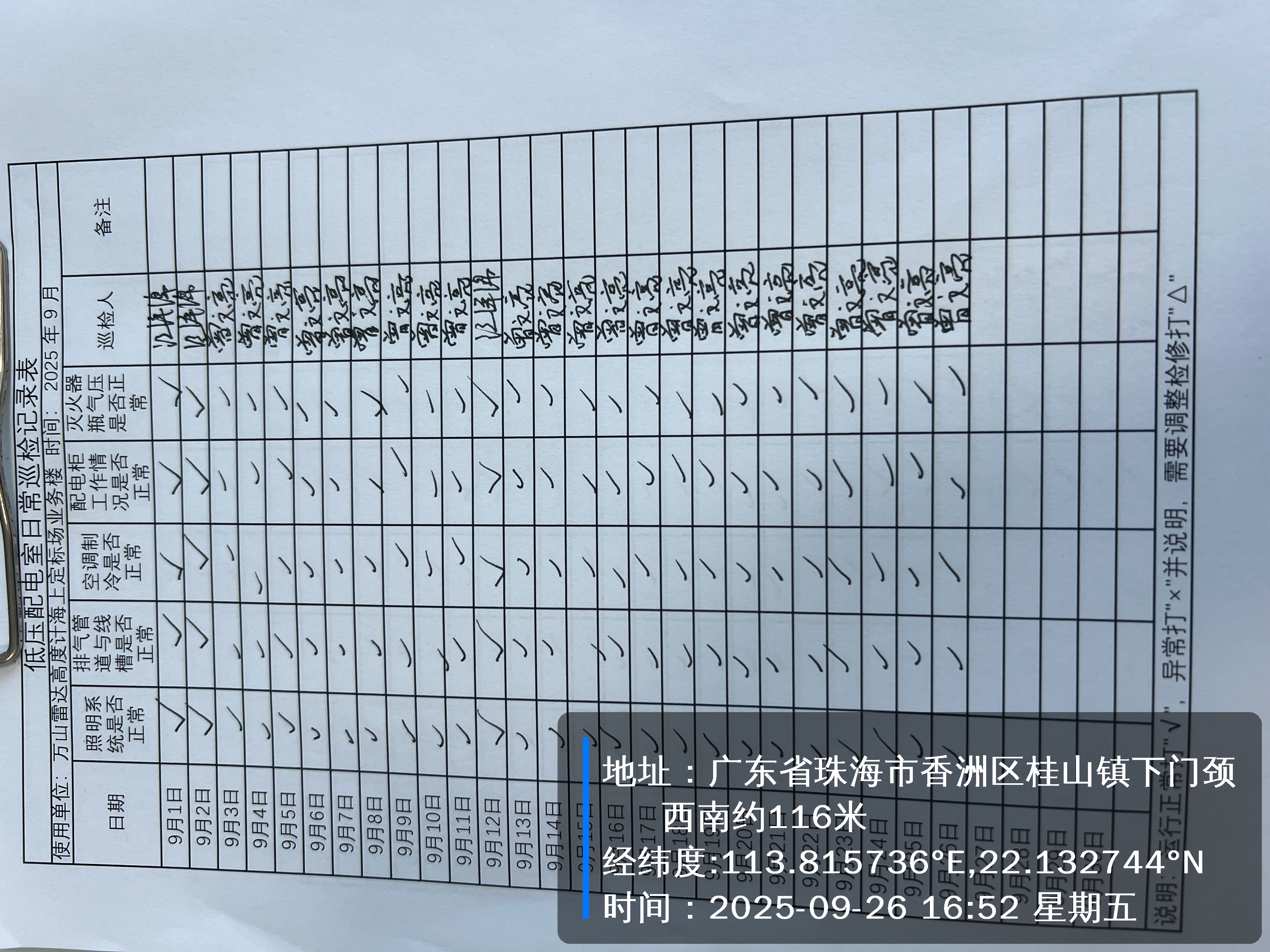 | 记录表-低压配电室日常巡检 | 原图 | 水印1 | 水印2 | 曾文亮 | 工作照 | 2025-09-26 16:52:11 |